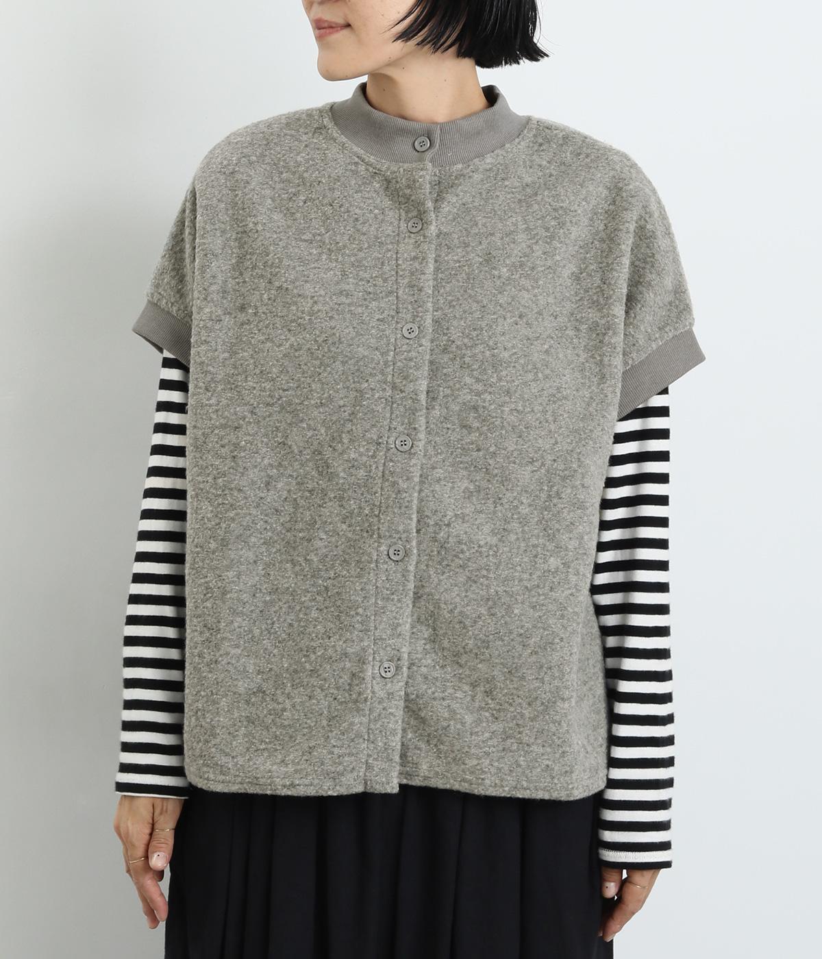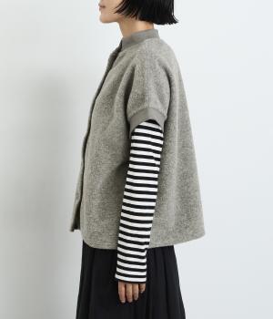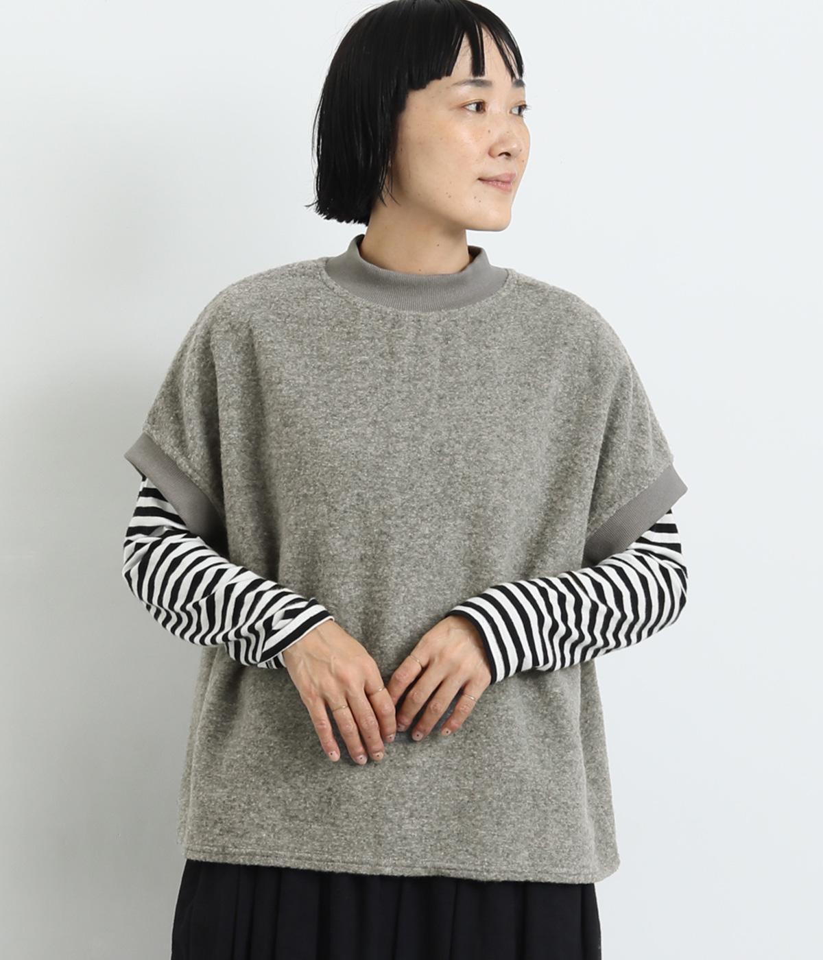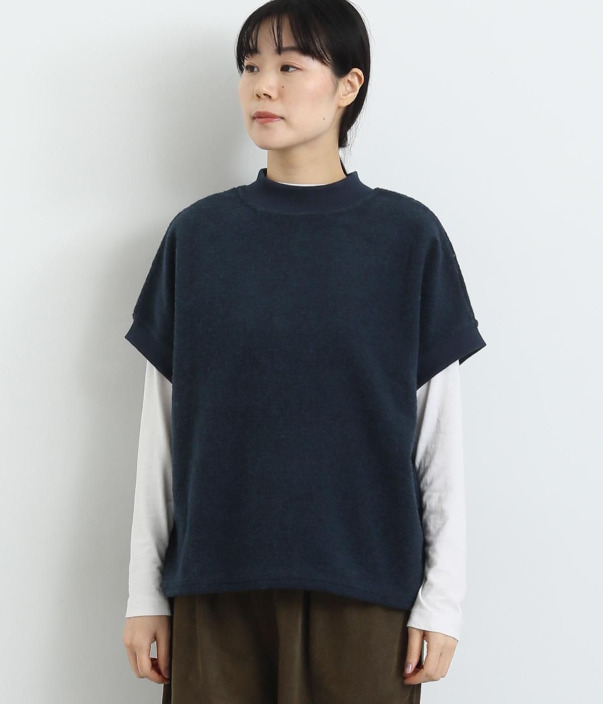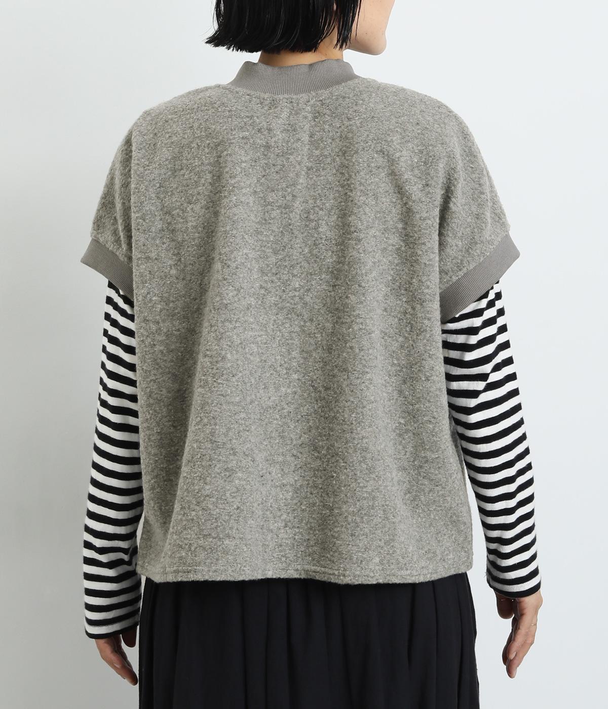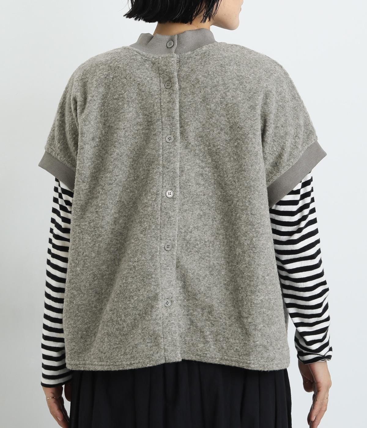 ゆったりとしたボックスシルエットに襟ぐりと袖口のリブ使いが特徴的なニットソーベスト。羽織りにも後ろあきにもなる前後2wayで着こなしの幅も広がります。いつものスタイリングに季節感と新鮮味を与えてくれる一枚です。