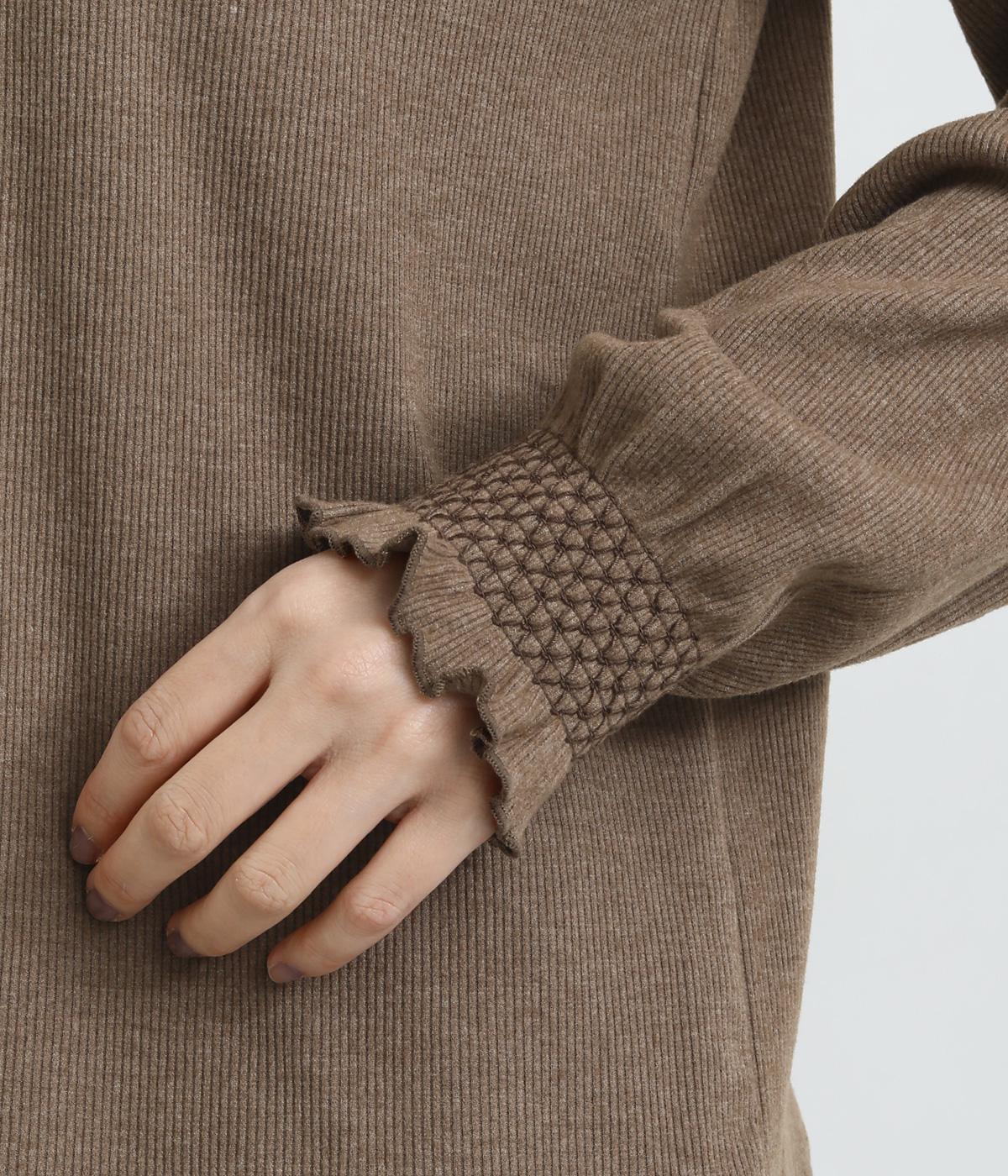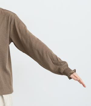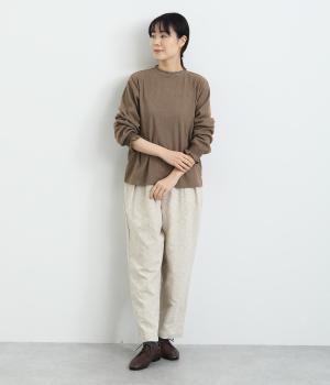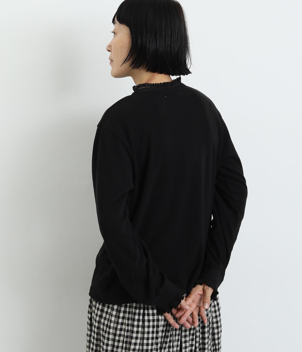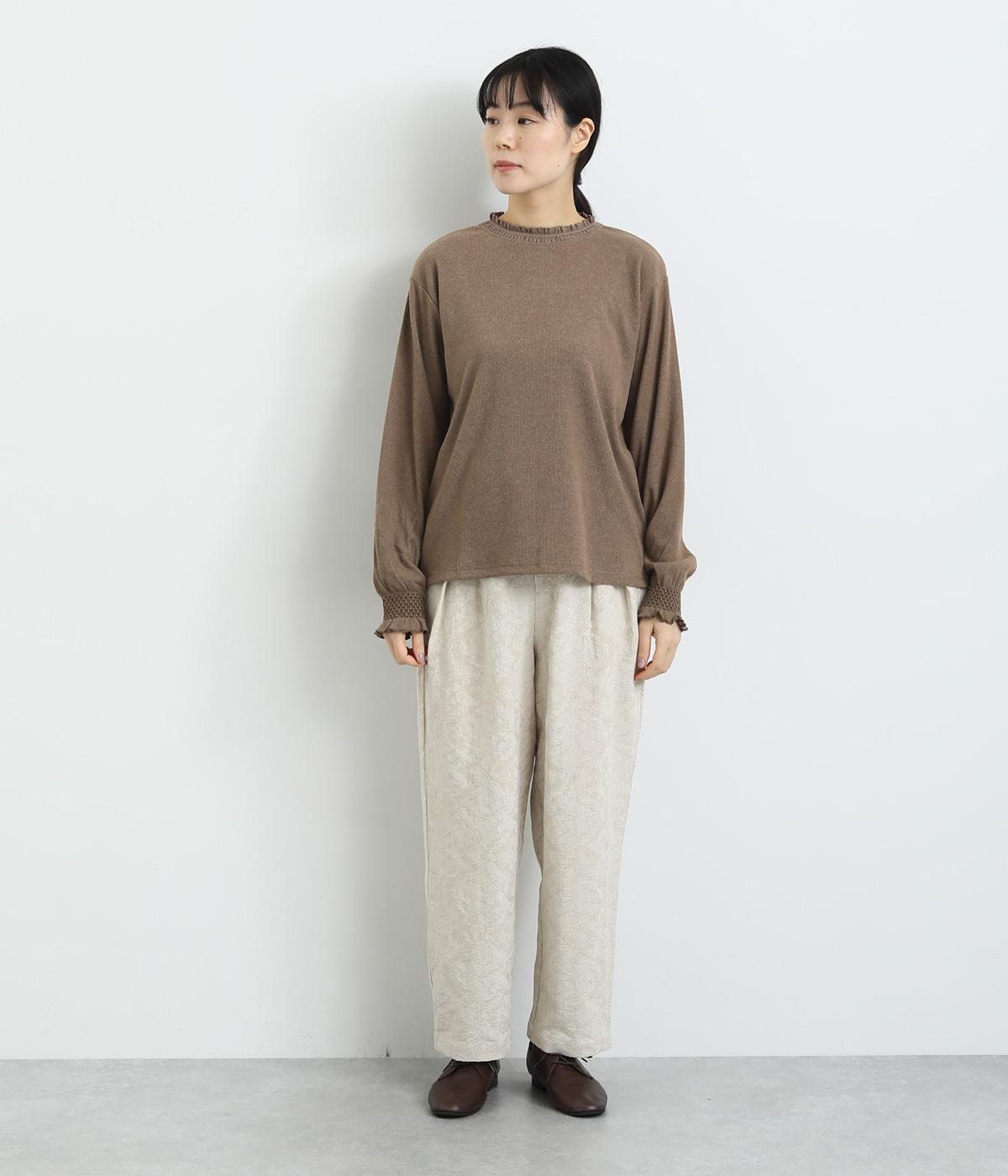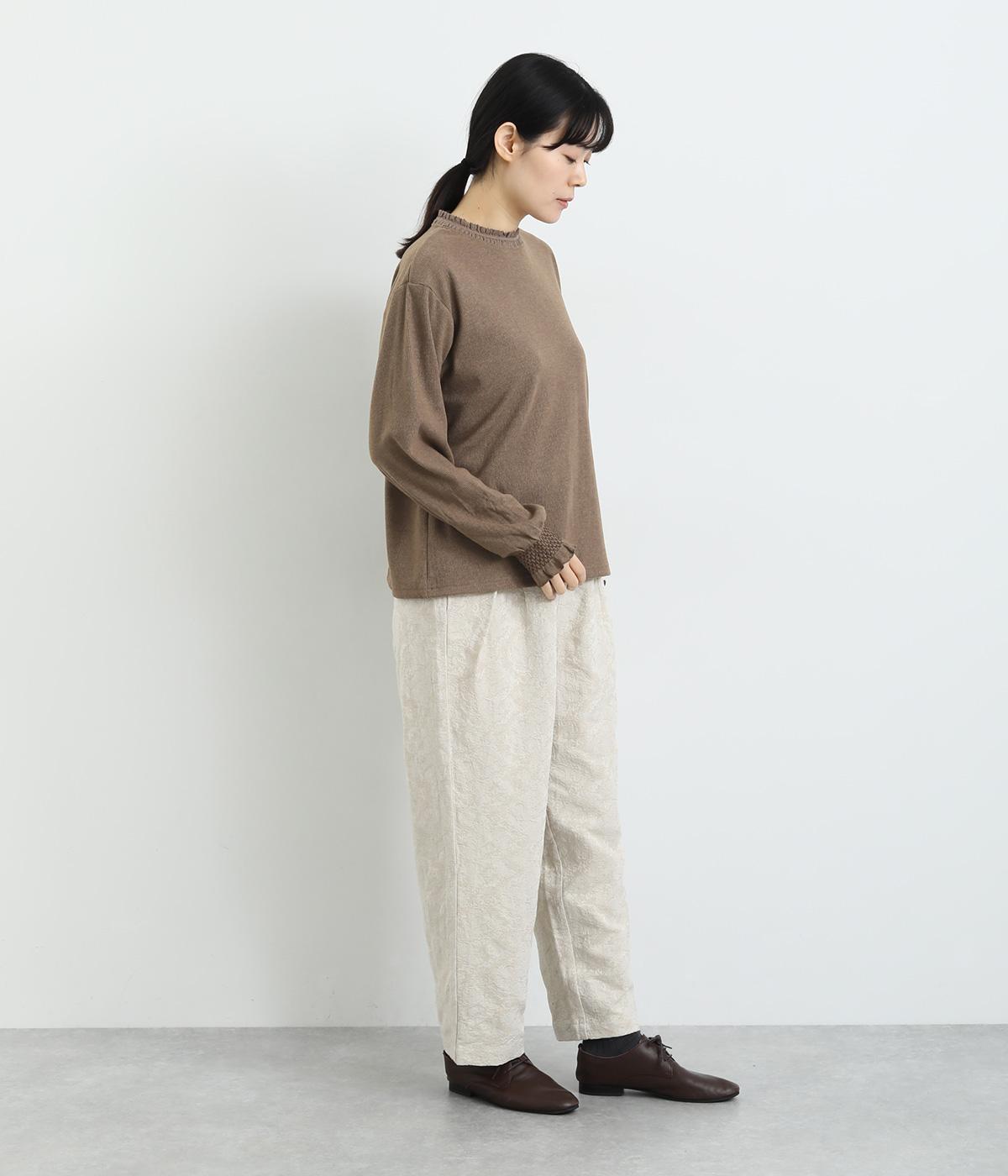 襟ぐりのレースや袖口のスモッキング刺しゅうでフェミニンなディテールを取り入れつつも、シンプルにまとめたプルオーバー。メイン使いはもちろん、サロペットなどのインナーなど脇役としても活躍するので一枚持っていると重宝します。