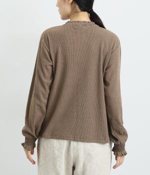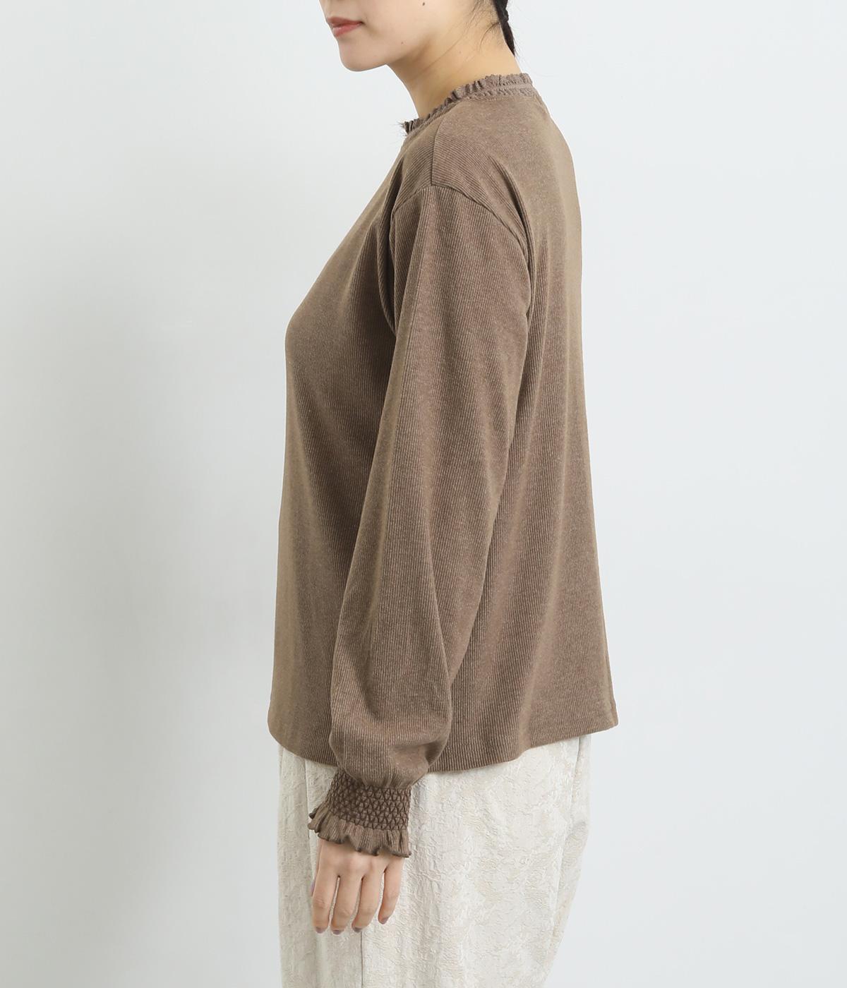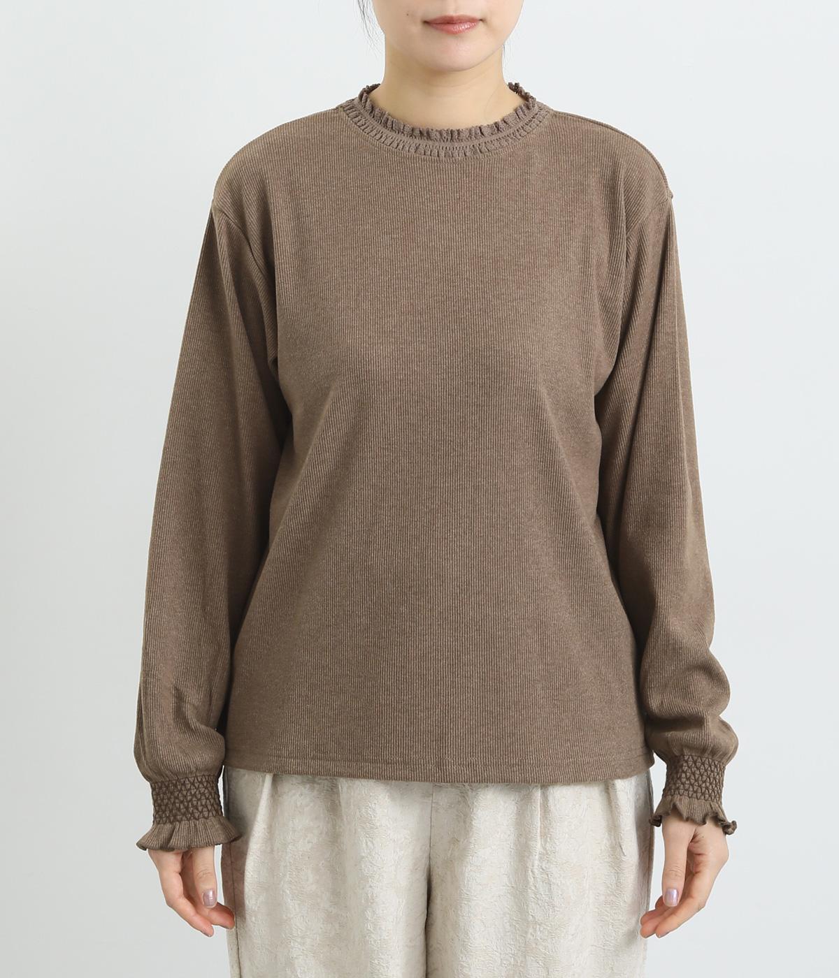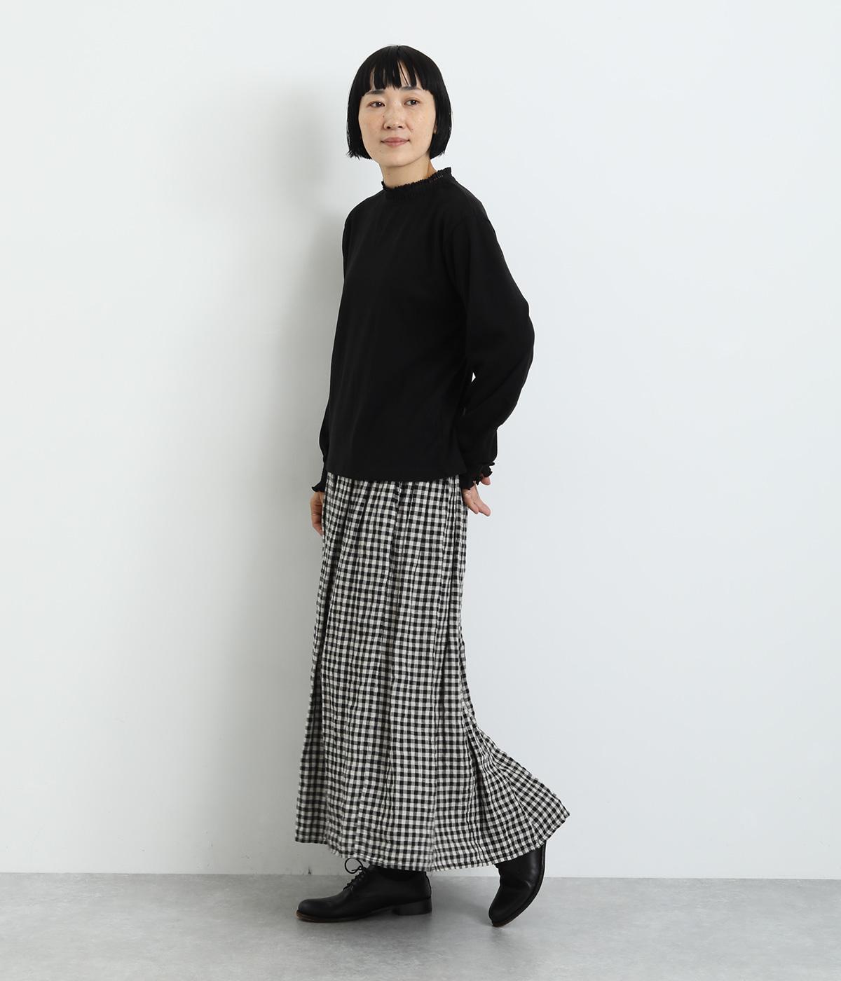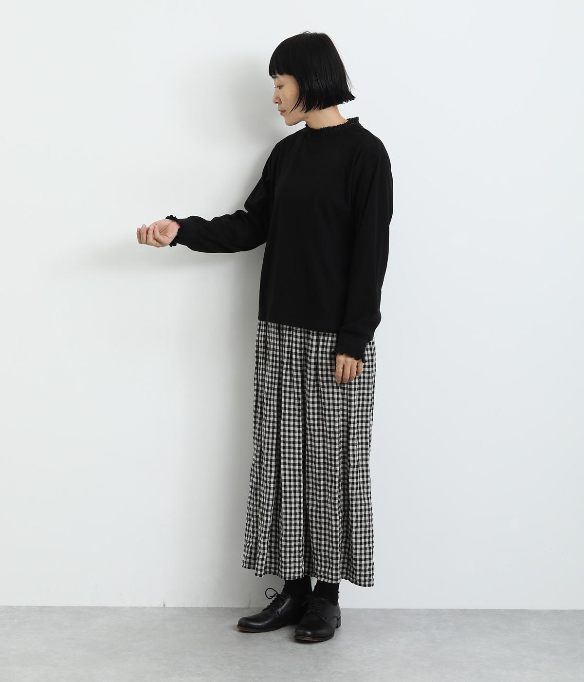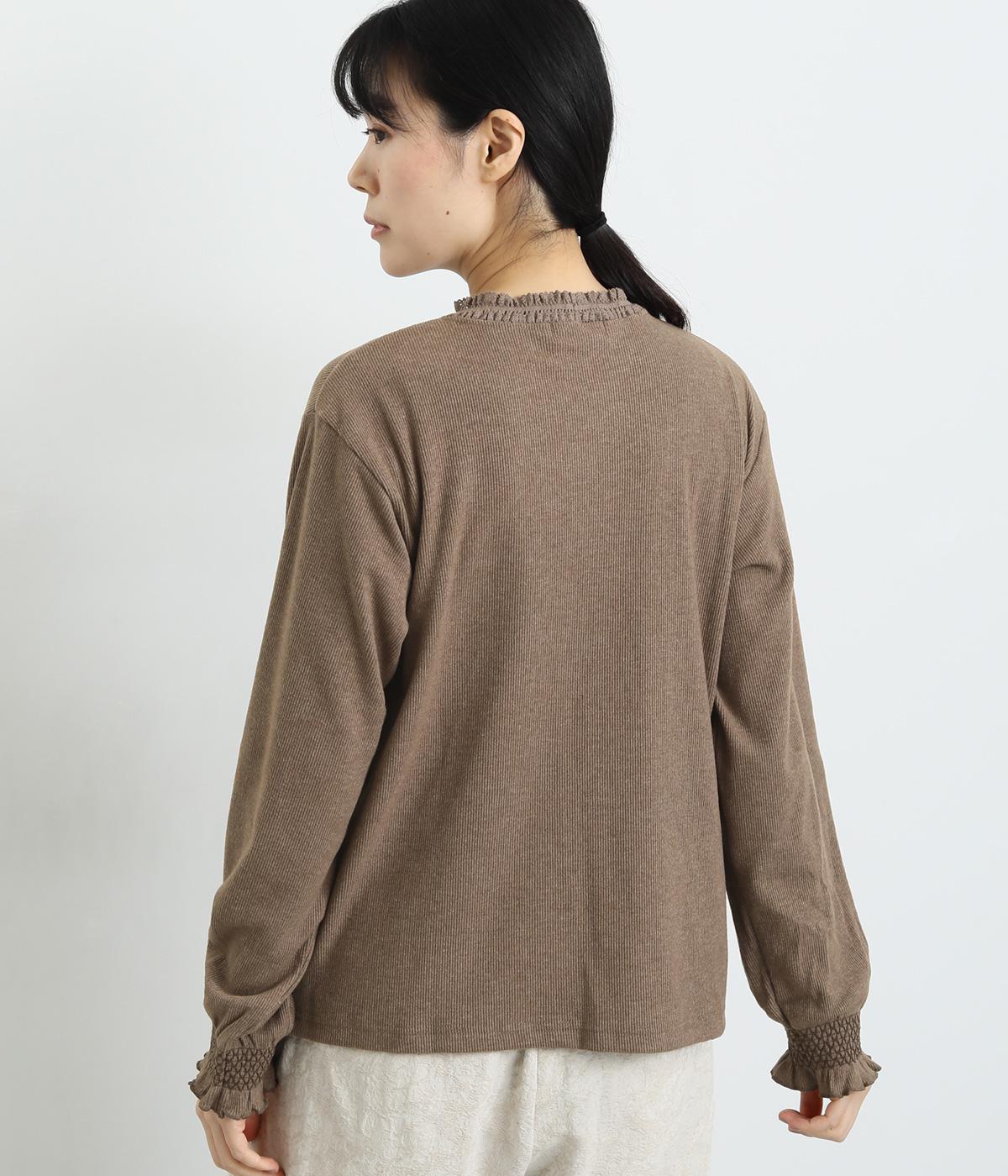 襟ぐりのレースや袖口のスモッキング刺しゅうでフェミニンなディテールを取り入れつつも、シンプルにまとめたプルオーバー。メイン使いはもちろん、サロペットなどのインナーなど脇役としても活躍するので一枚持っていると重宝します。