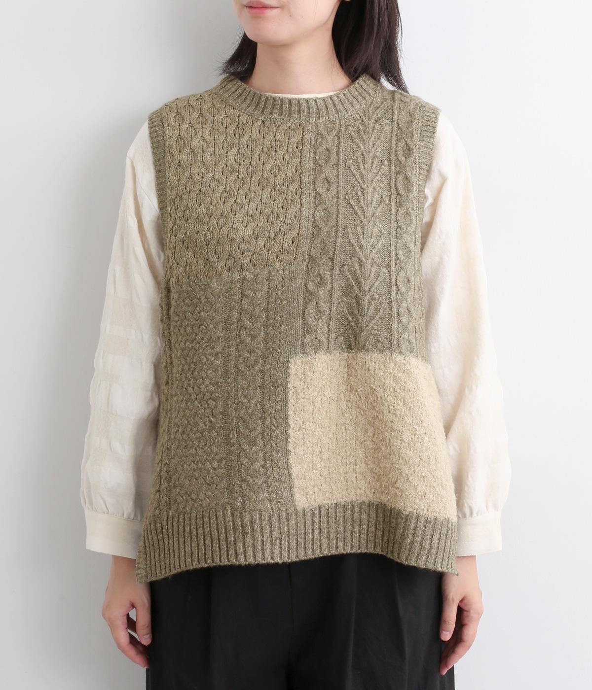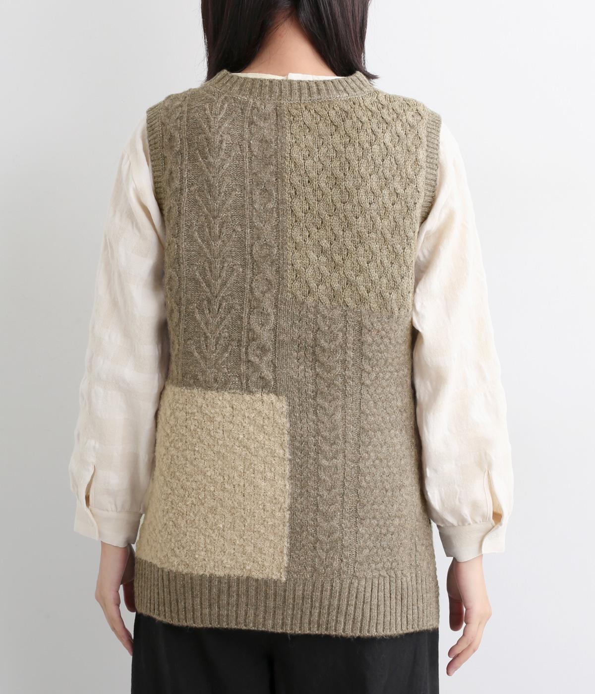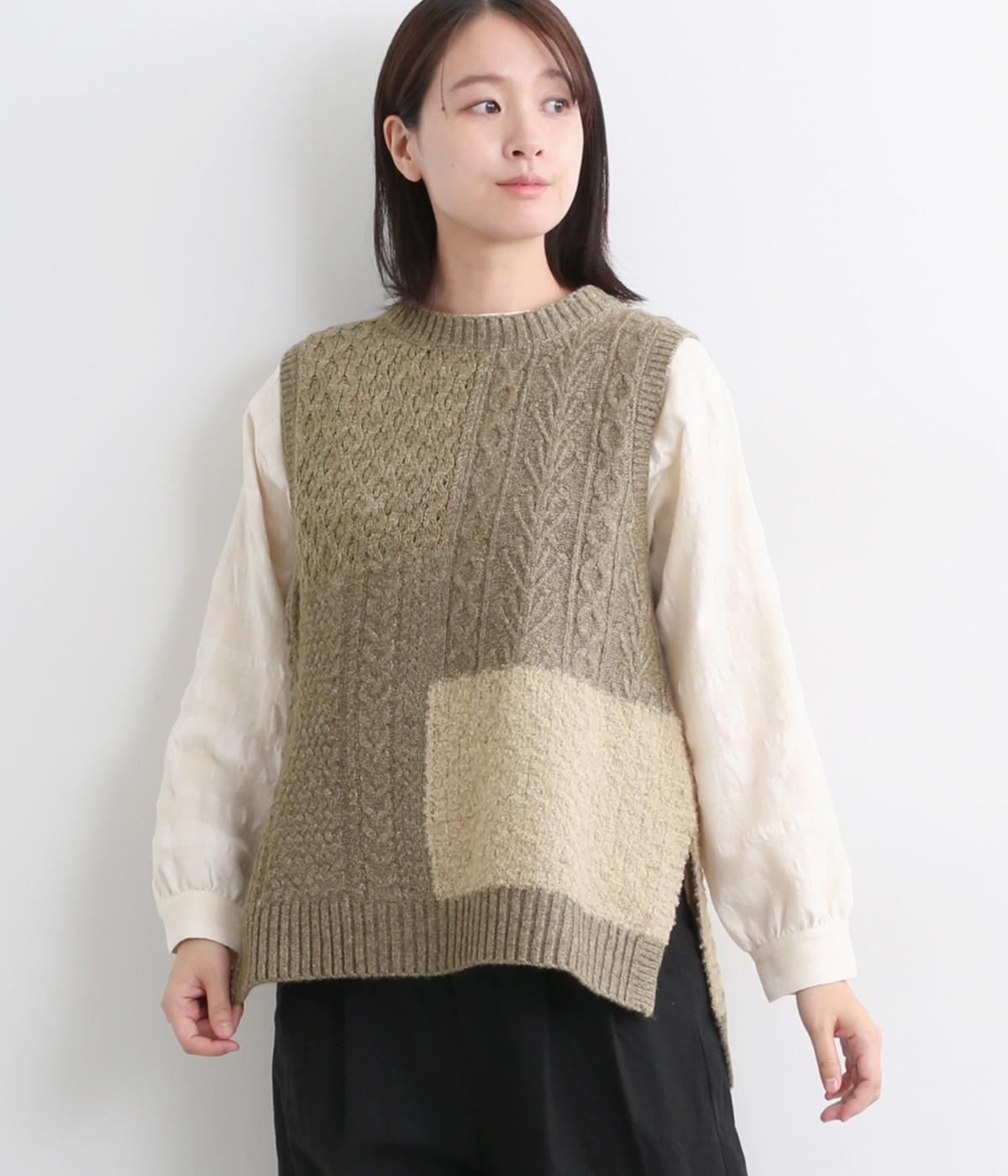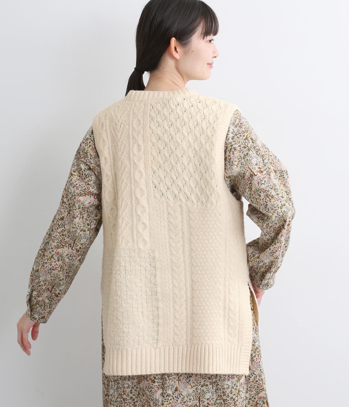 様々な編み柄を切り替えた、表情豊かなニットベストです。ゆったりしたシルエットで、締め付け感なく快適な着心地。ワンピースやシャツの上に重ねるだけで、防寒はもちろん個性と季節感あるコーディネートが完成します。