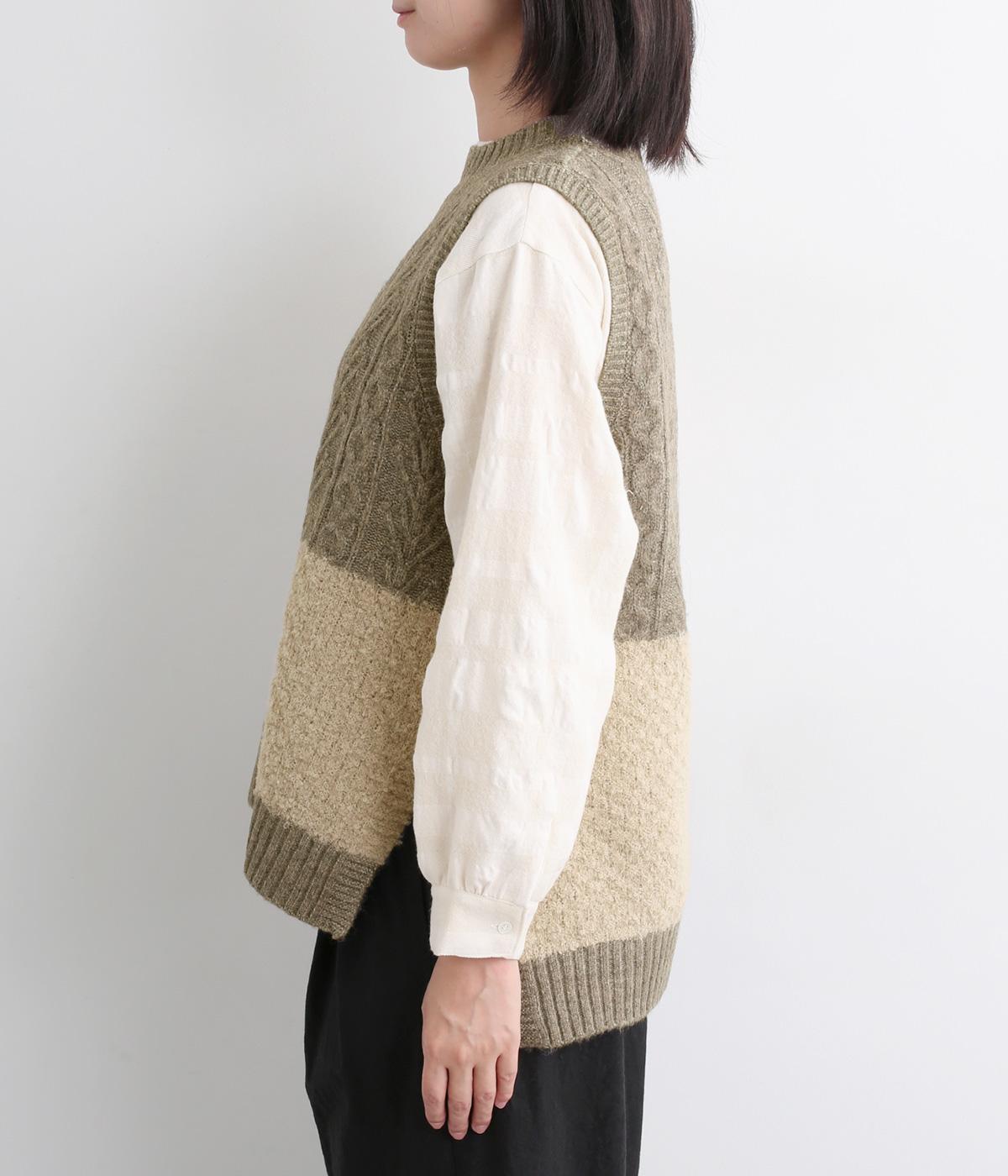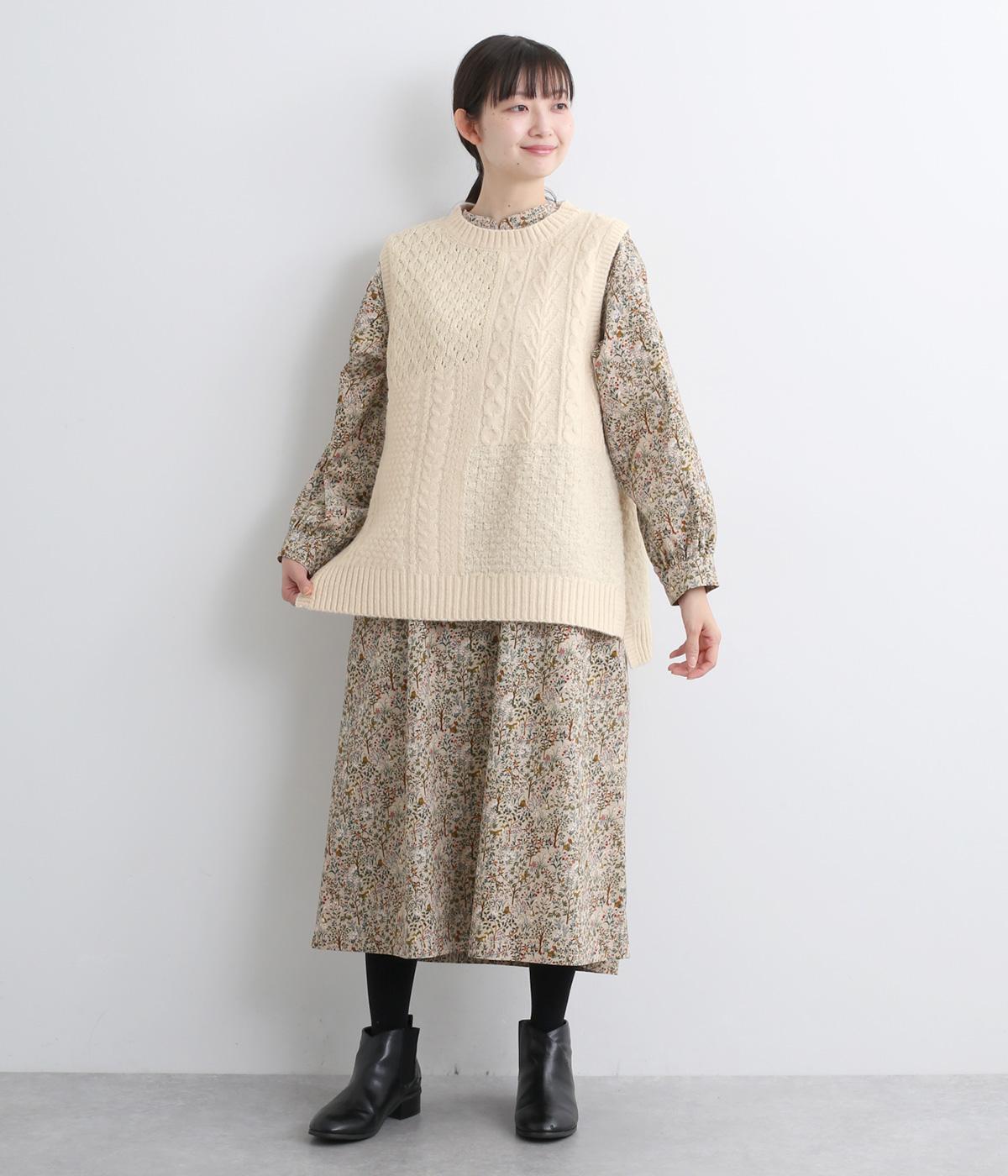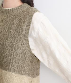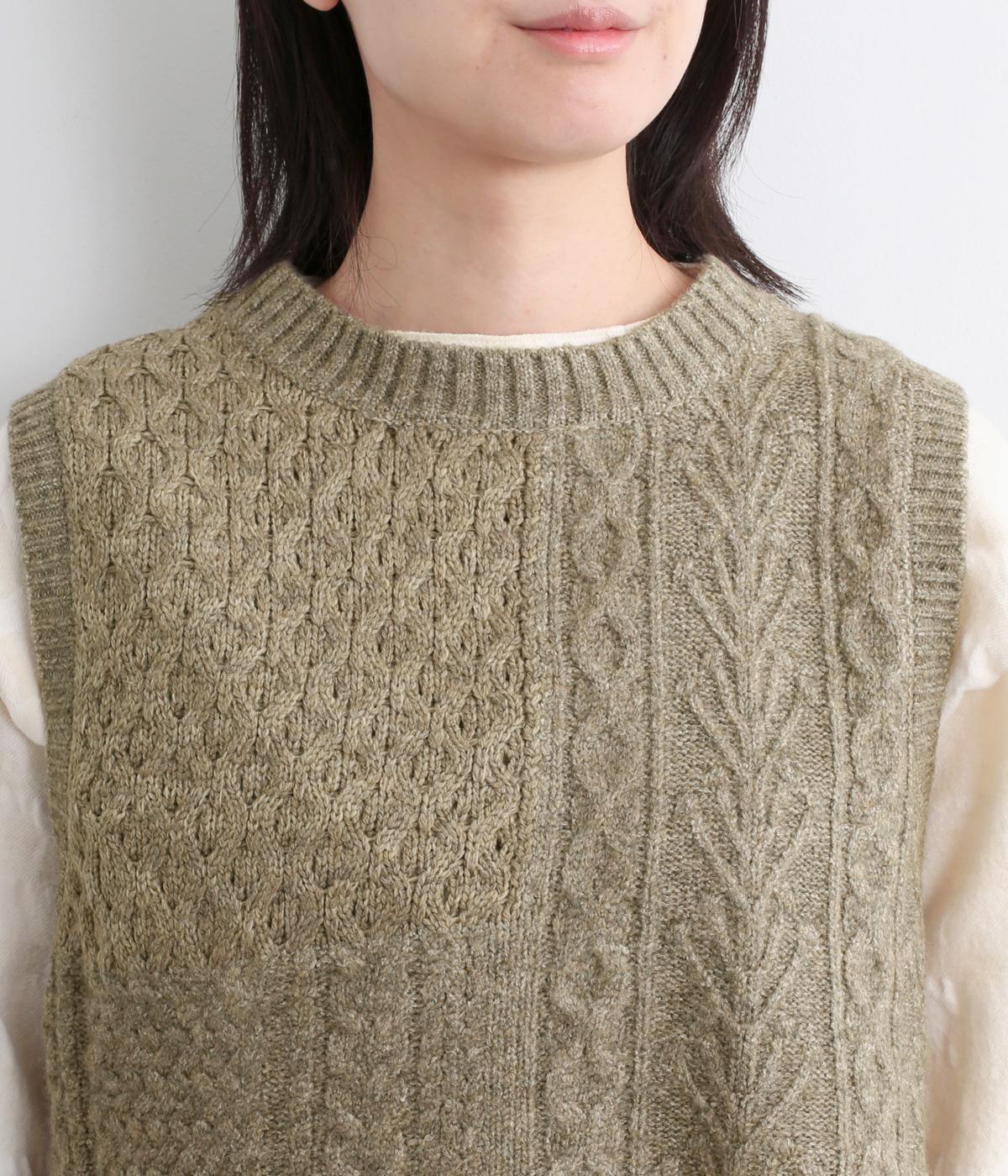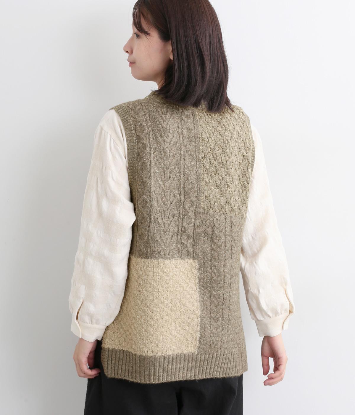 様々な編み柄を切り替えた、表情豊かなニットベストです。ゆったりしたシルエットで、締め付け感なく快適な着心地。ワンピースやシャツの上に重ねるだけで、防寒はもちろん個性と季節感あるコーディネートが完成します。