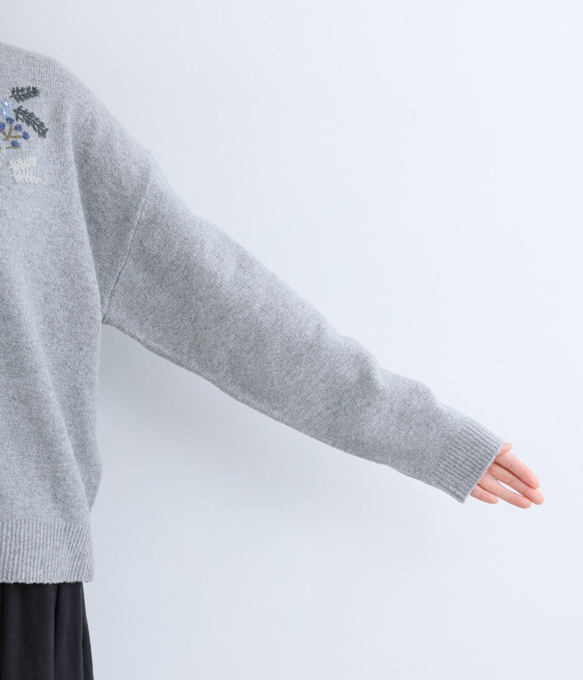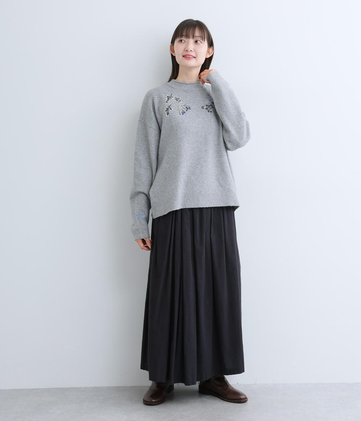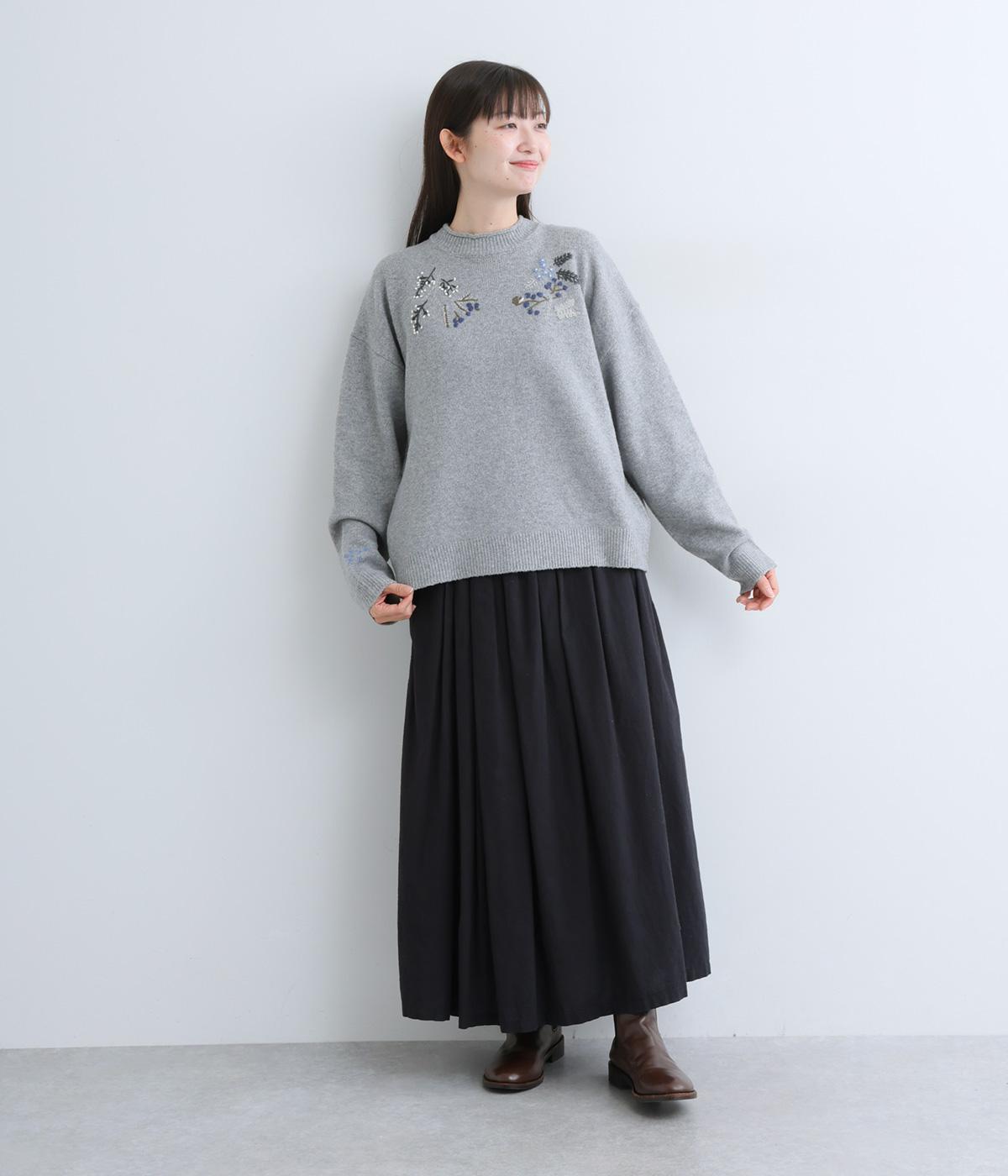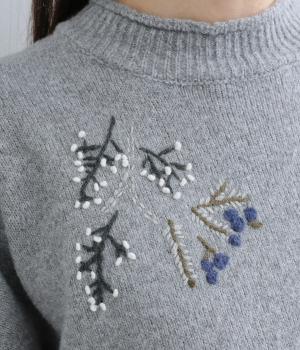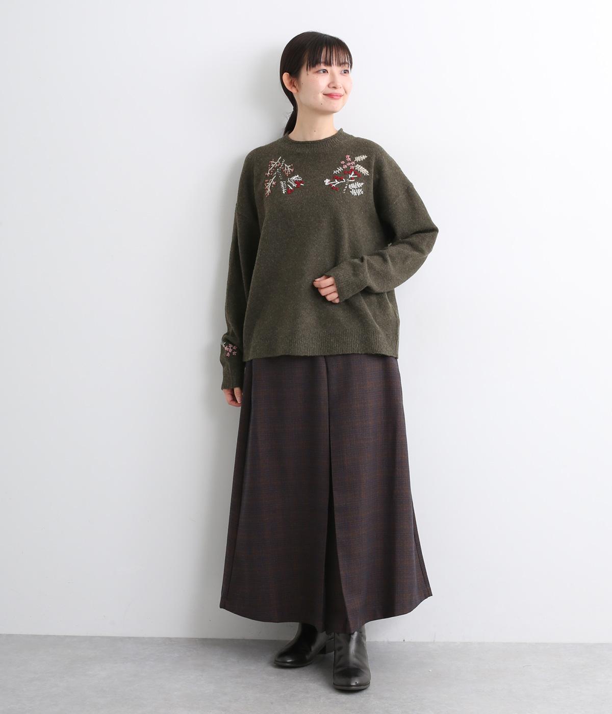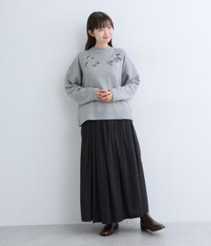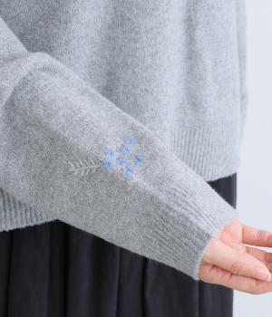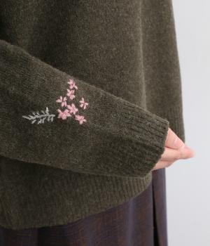 前身頃と右袖にお花の刺しゅうをほどこした大人かわいいニットです。立体的な刺しゅうが存在感を放ち、視線を上に集めるのでスタイルを整える効果も。サロペットなどを合わせて、デザインをちらりと覗かせたスタイルも素敵です。