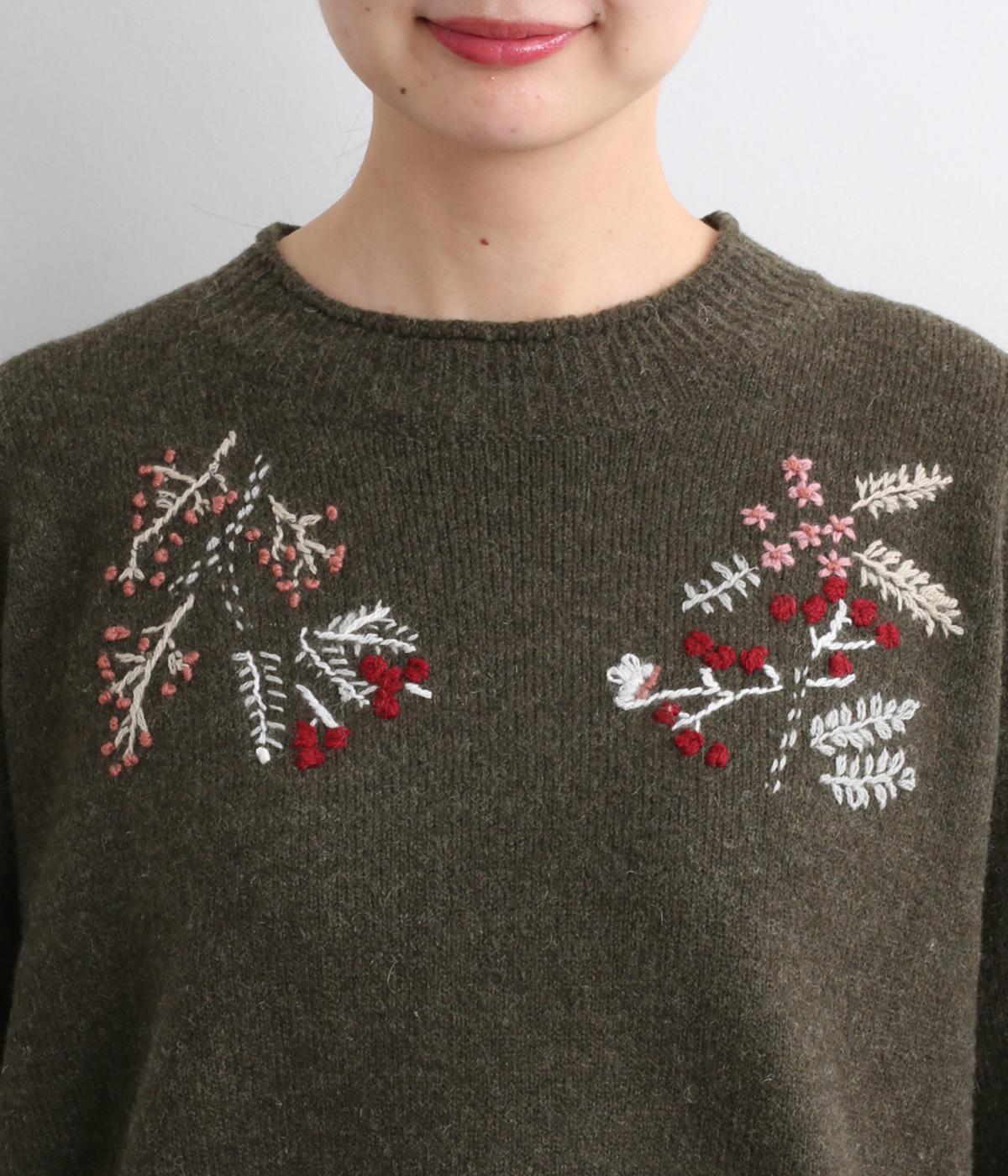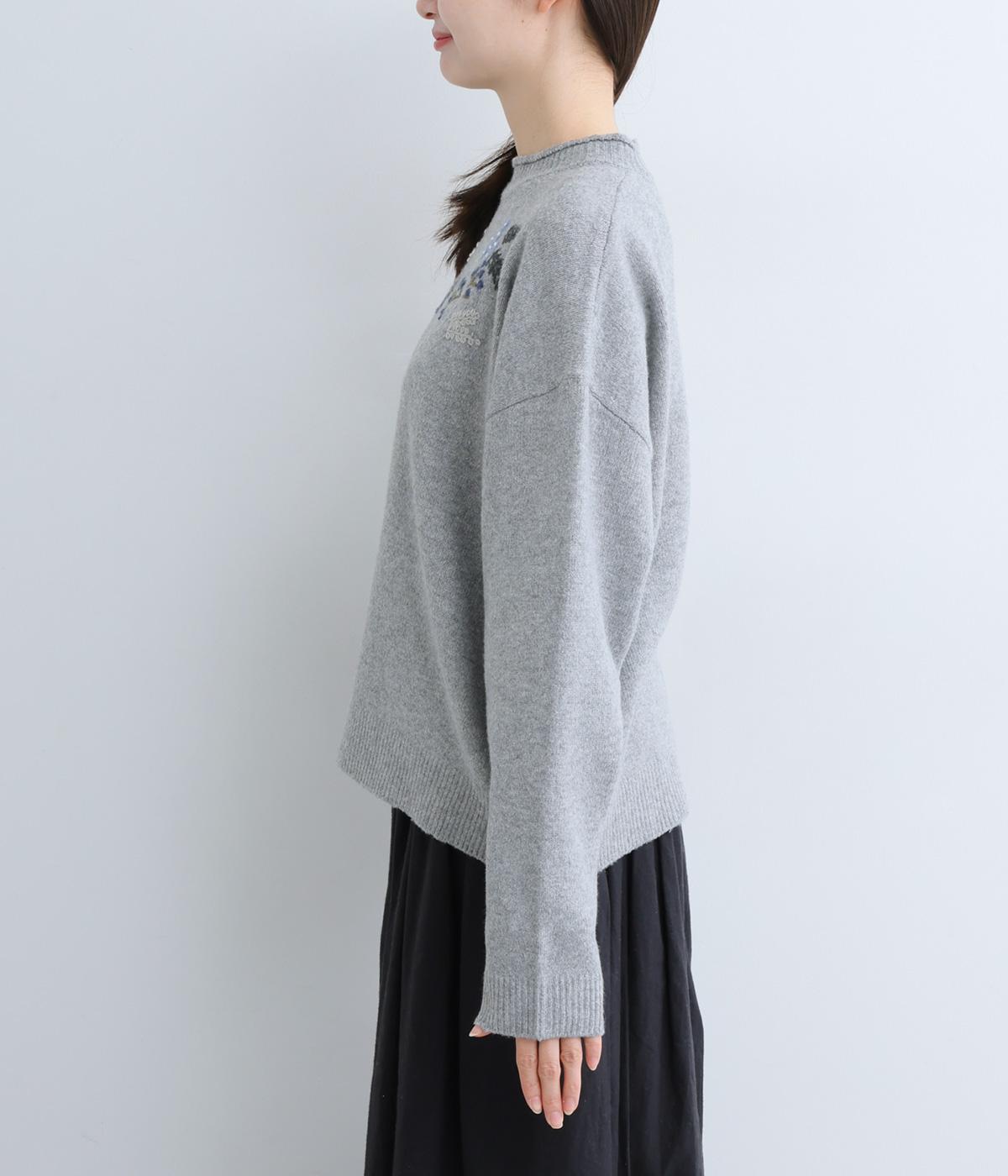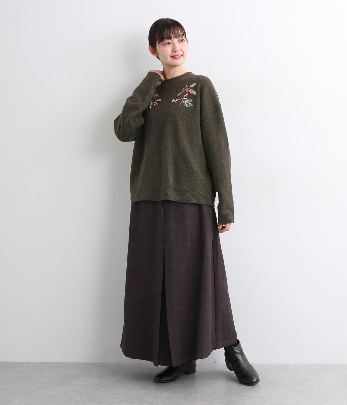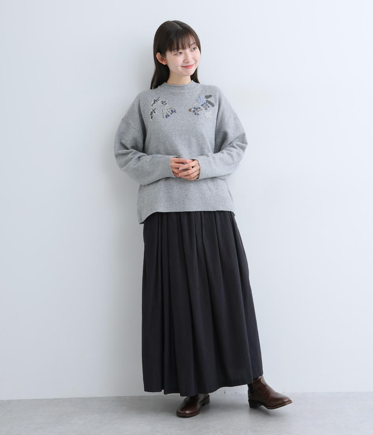 前身頃と右袖にお花の刺しゅうをほどこした大人かわいいニットです。立体的な刺しゅうが存在感を放ち、視線を上に集めるのでスタイルを整える効果も。サロペットなどを合わせて、デザインをちらりと覗かせたスタイルも素敵です。
