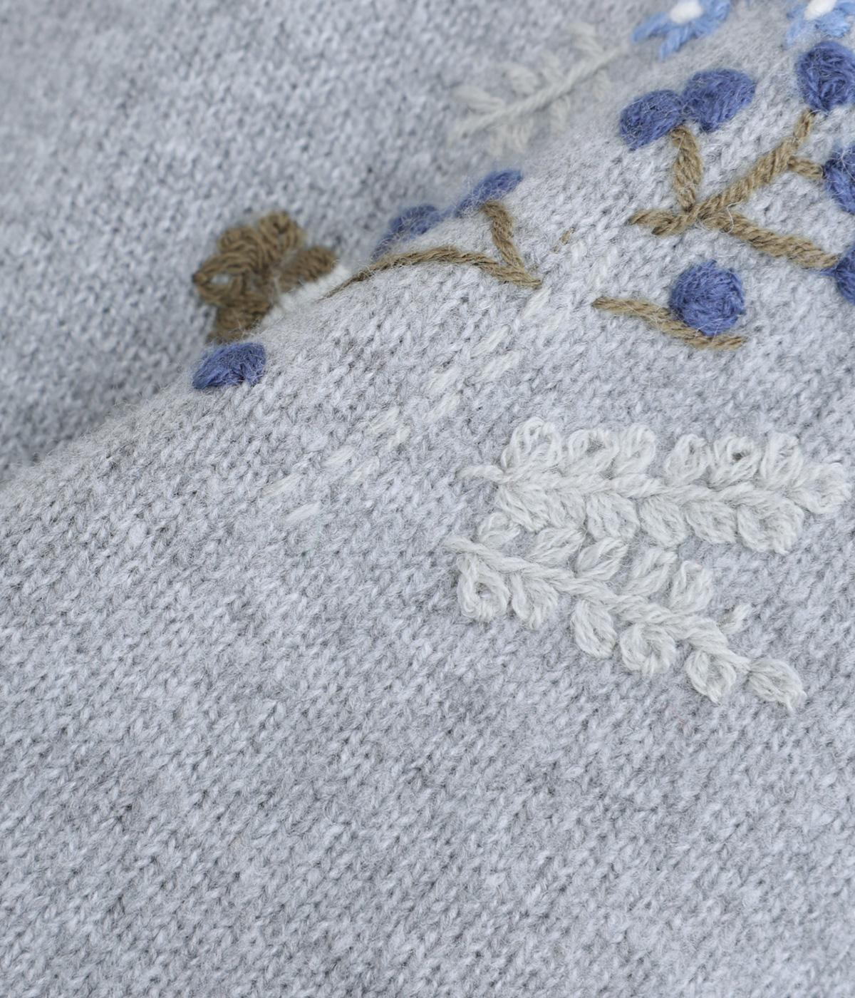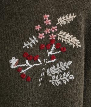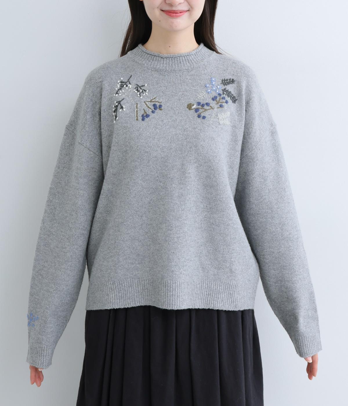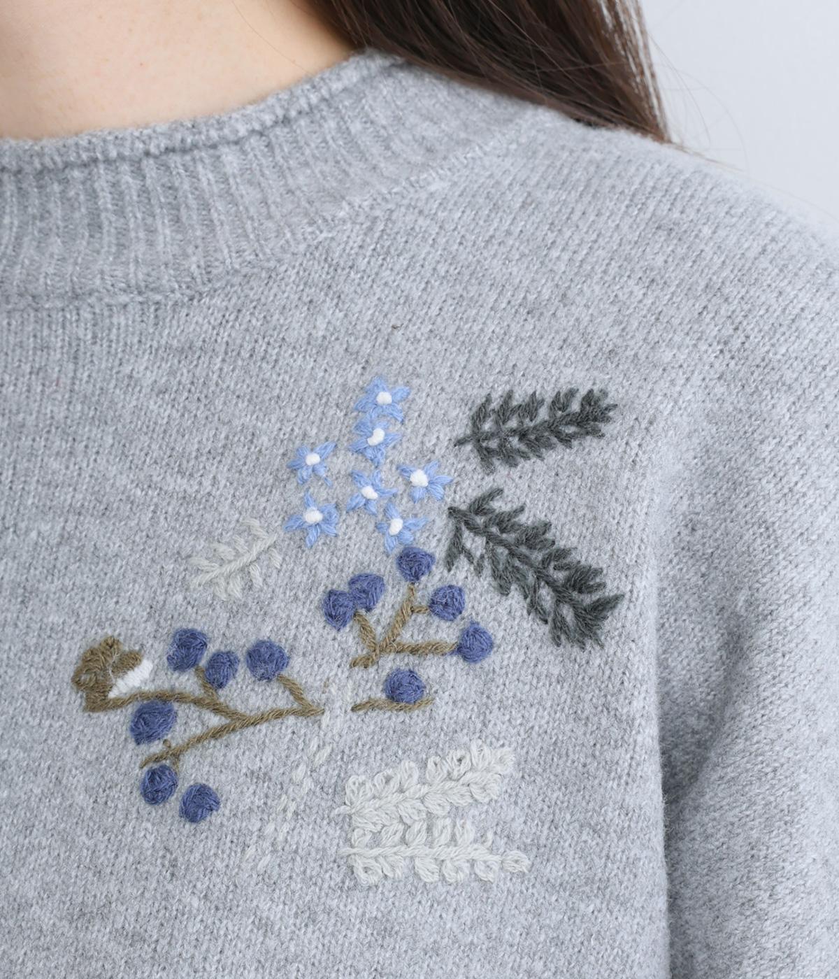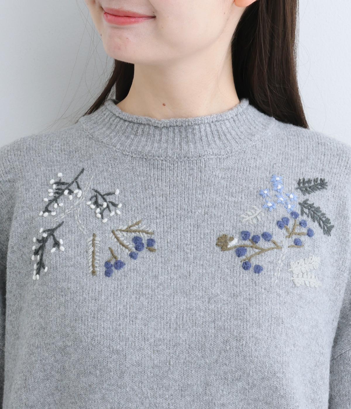 前身頃と右袖にお花の刺しゅうをほどこした大人かわいいニットです。立体的な刺しゅうが存在感を放ち、視線を上に集めるのでスタイルを整える効果も。サロペットなどを合わせて、デザインをちらりと覗かせたスタイルも素敵です。