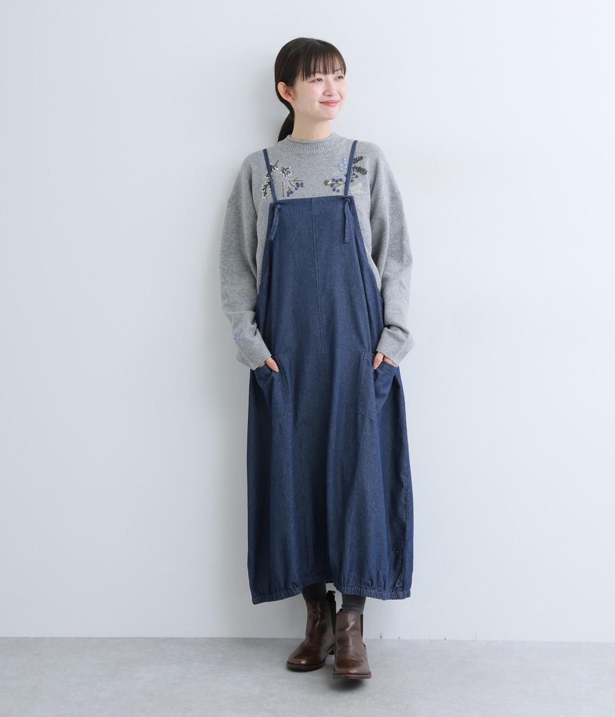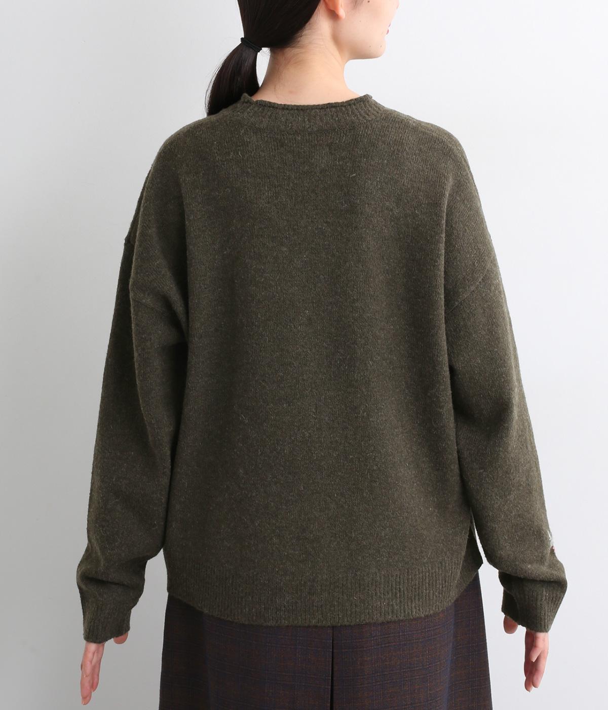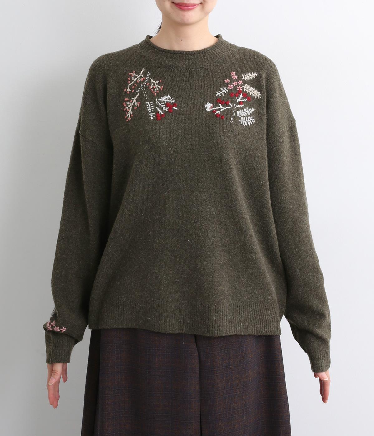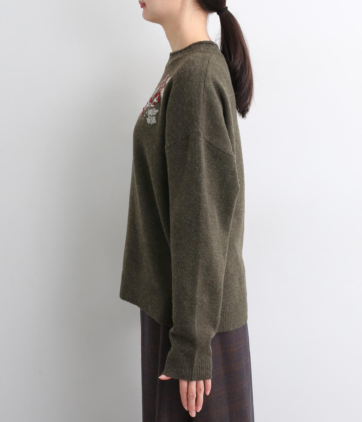 前身頃と右袖にお花の刺しゅうをほどこした大人かわいいニットです。立体的な刺しゅうが存在感を放ち、視線を上に集めるのでスタイルを整える効果も。サロペットなどを合わせて、デザインをちらりと覗かせたスタイルも素敵です。