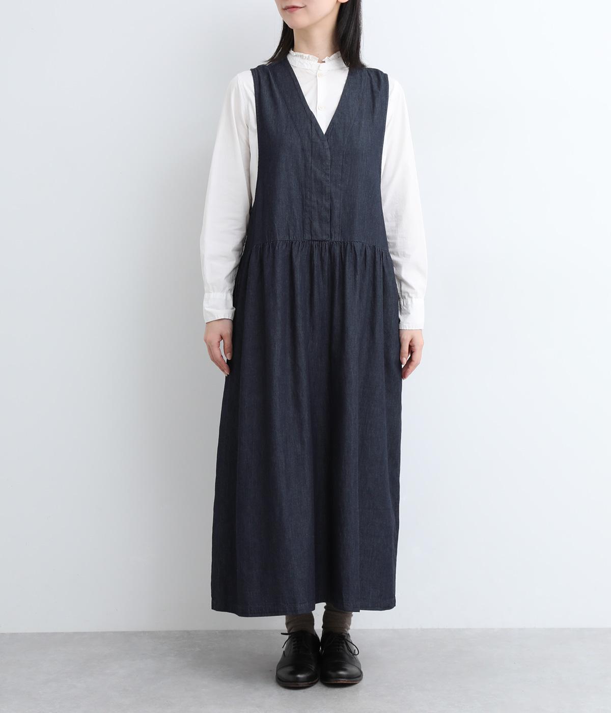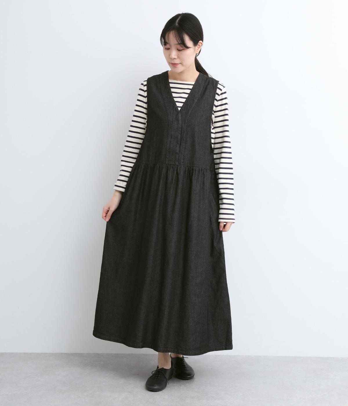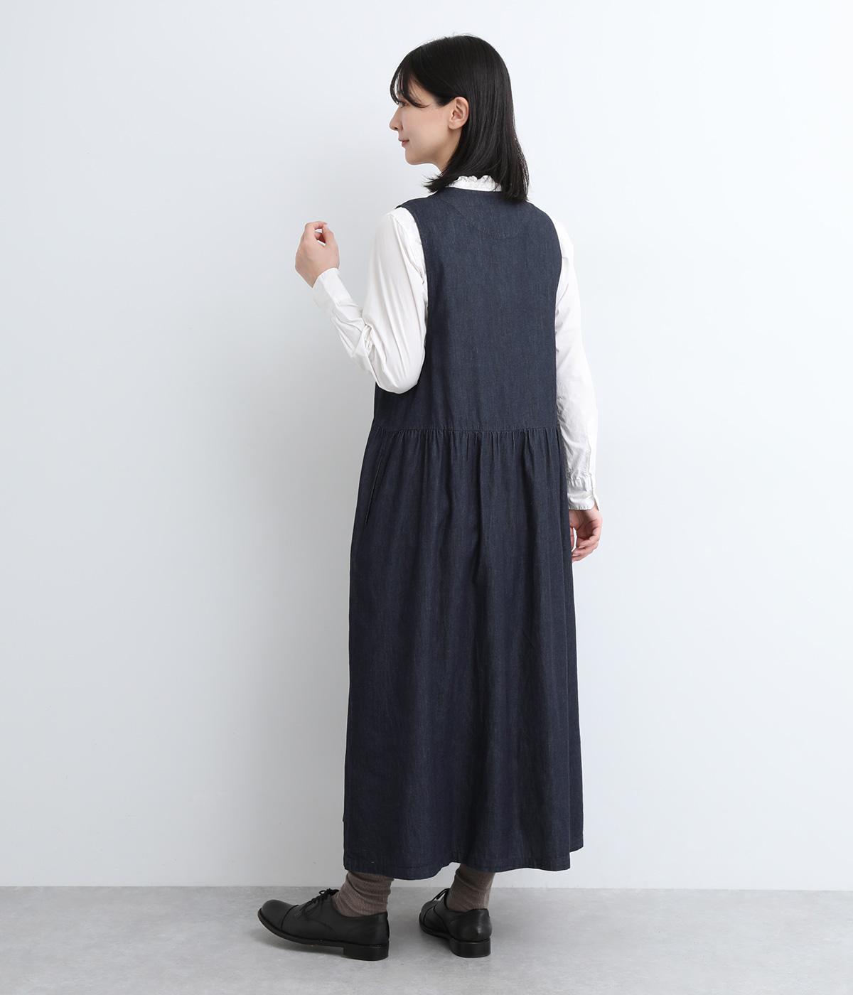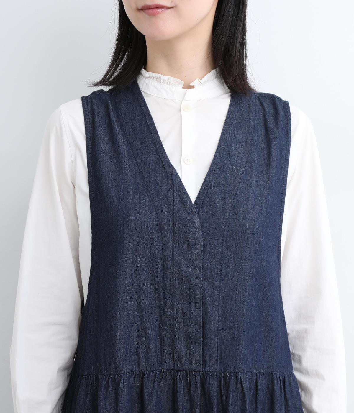 Vネックに比翼のボタンで、カジュアルなデニムを大人仕様にアップデート。すとんと落ちるシルエットがきれいなノースリーブワンピースです。アームホールのあきが広いので、インナーを選ばないのもうれしいポイント。