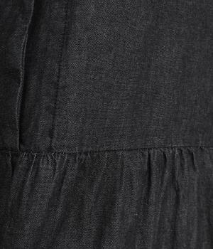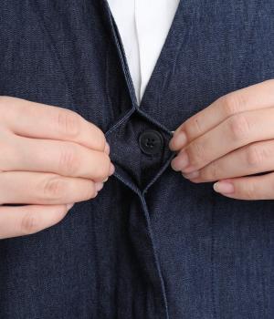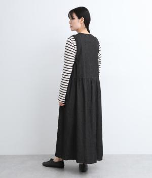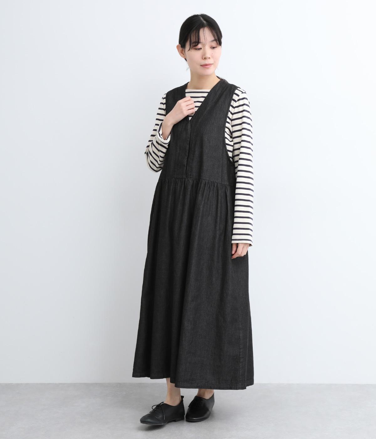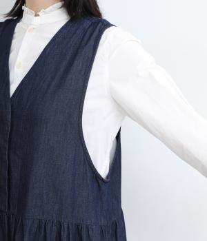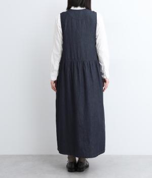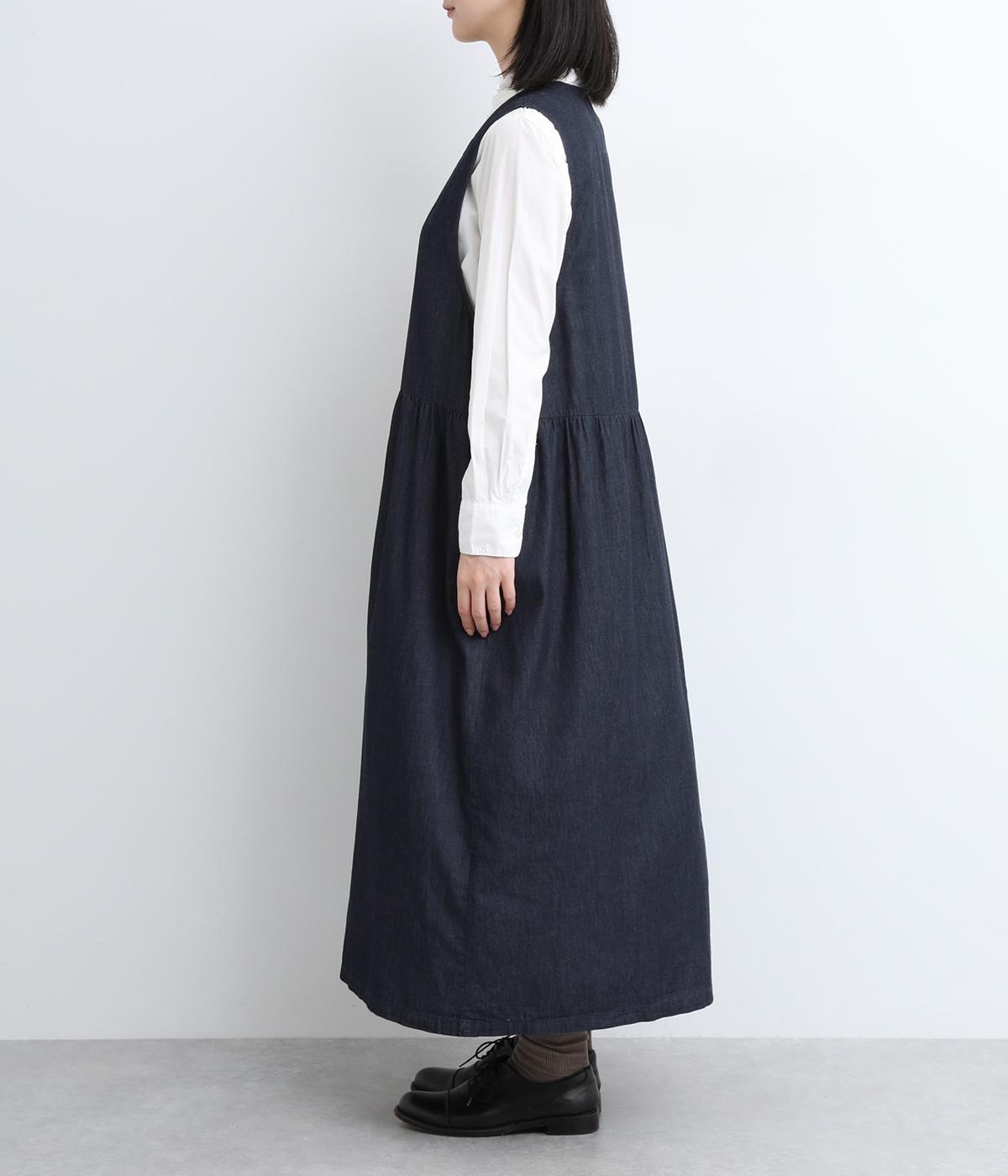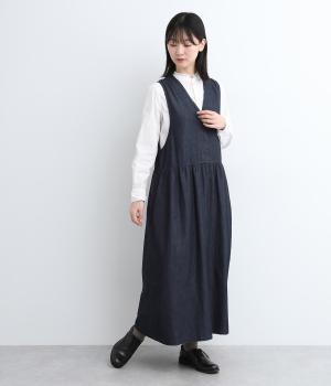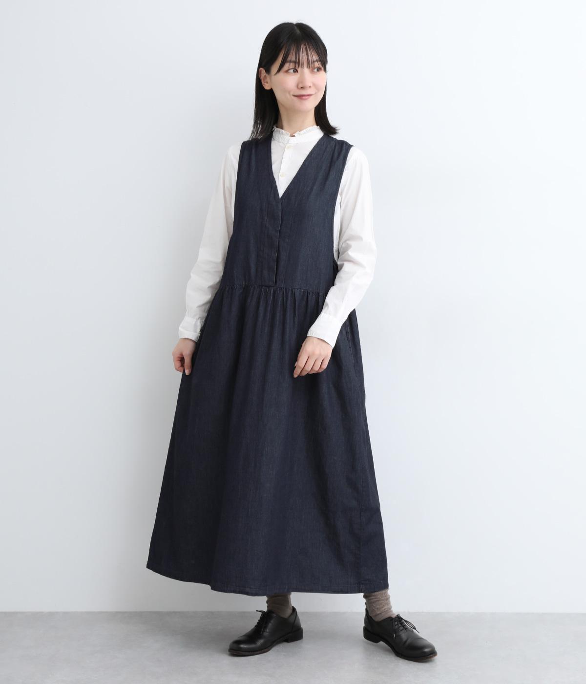 Vネックに比翼のボタンで、カジュアルなデニムを大人仕様にアップデート。すとんと落ちるシルエットがきれいなノースリーブワンピースです。アームホールのあきが広いので、インナーを選ばないのもうれしいポイント。