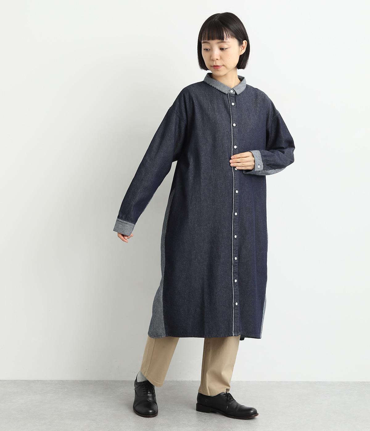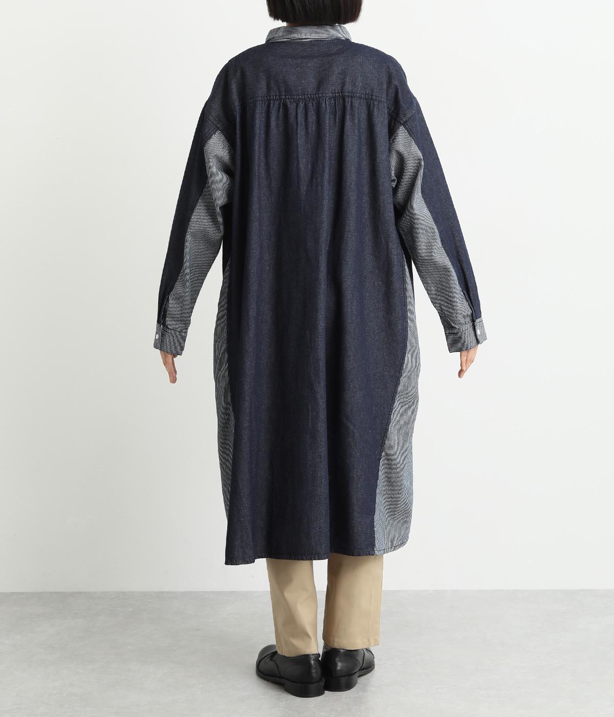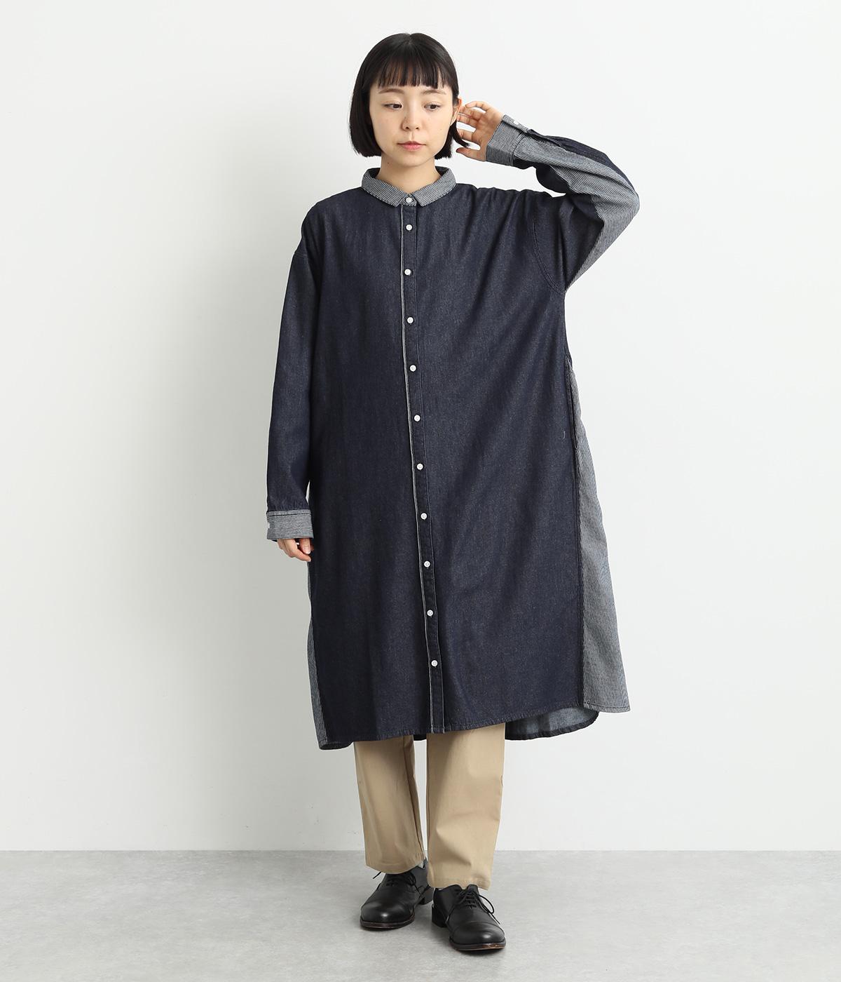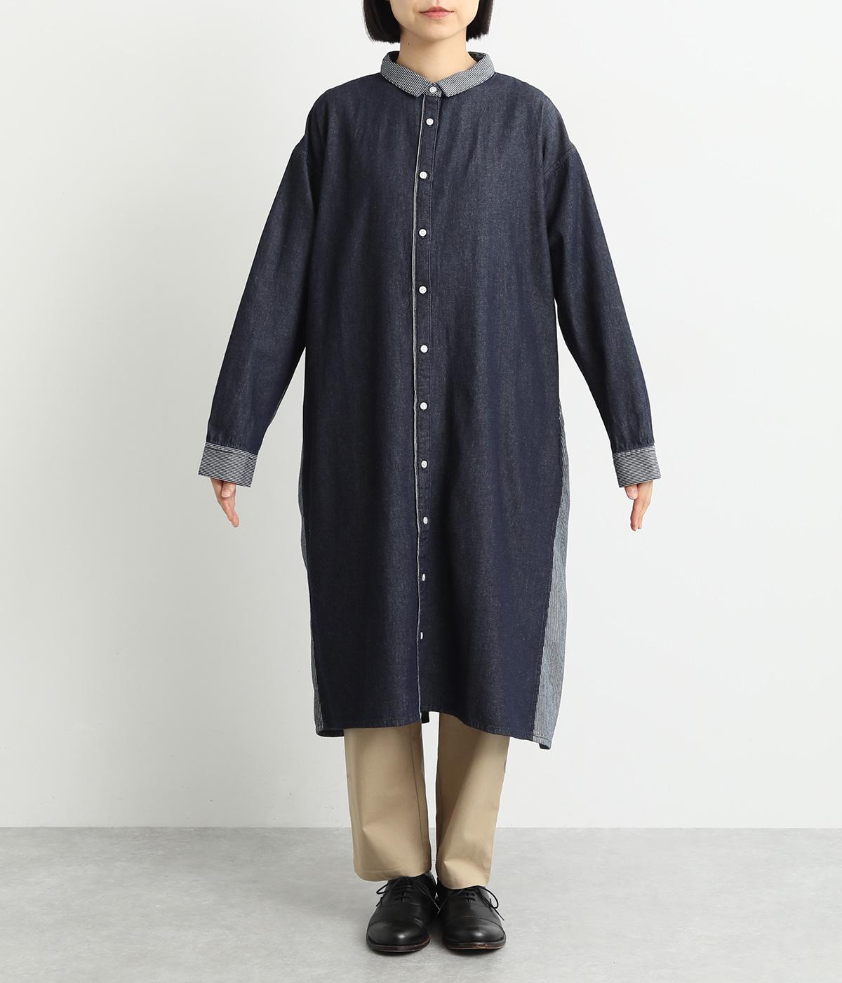 部分的に異素材を組み合わせた切り替えデザインが特徴的で目を惹くワンピース。襟や袖カフスでシャツのようなきちんと感のあるディテールも取り入れています。ジャケット感覚の羽織り使いもおすすめで、着こなし次第でロングシーズン活躍します。