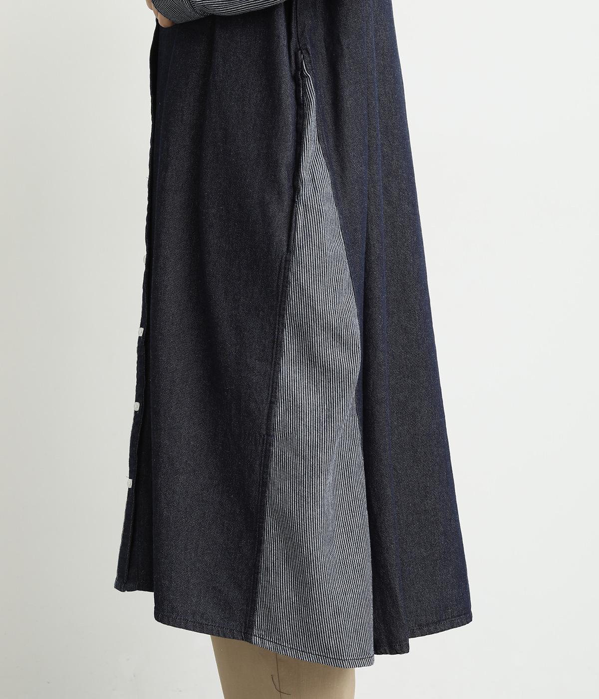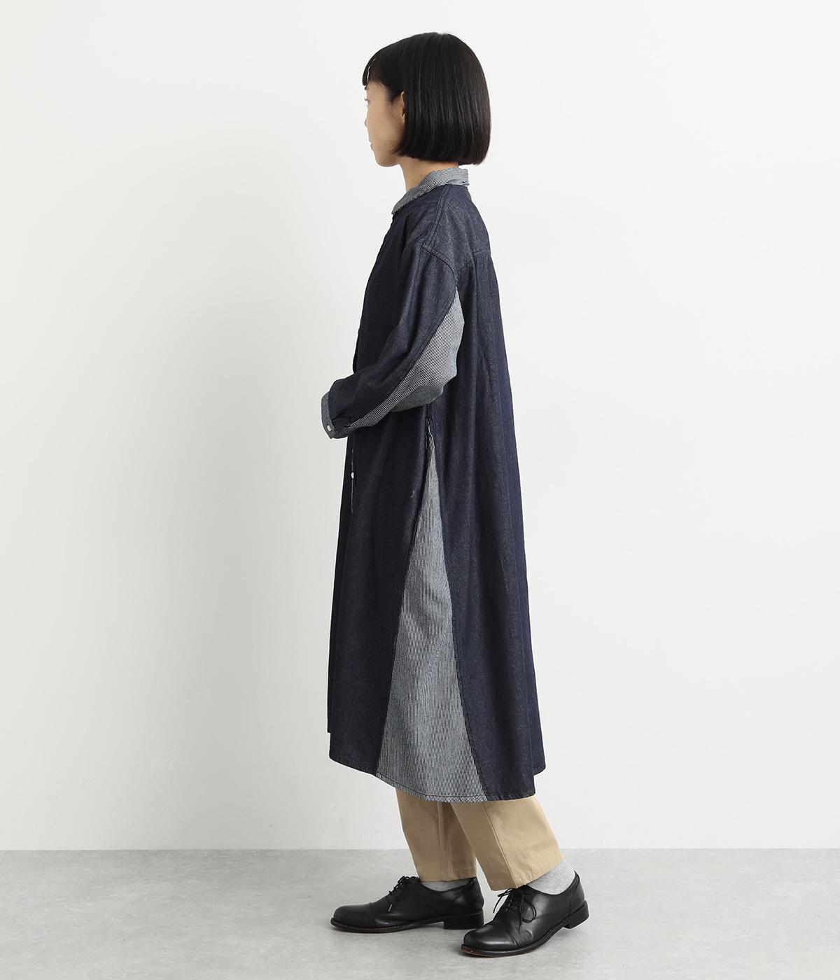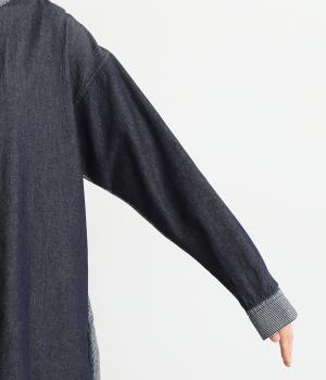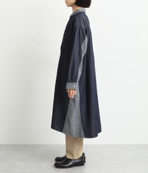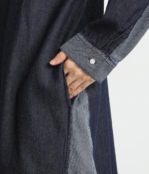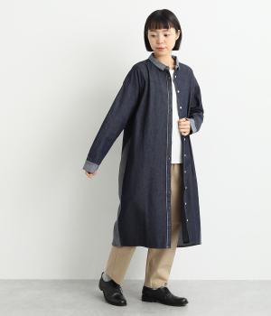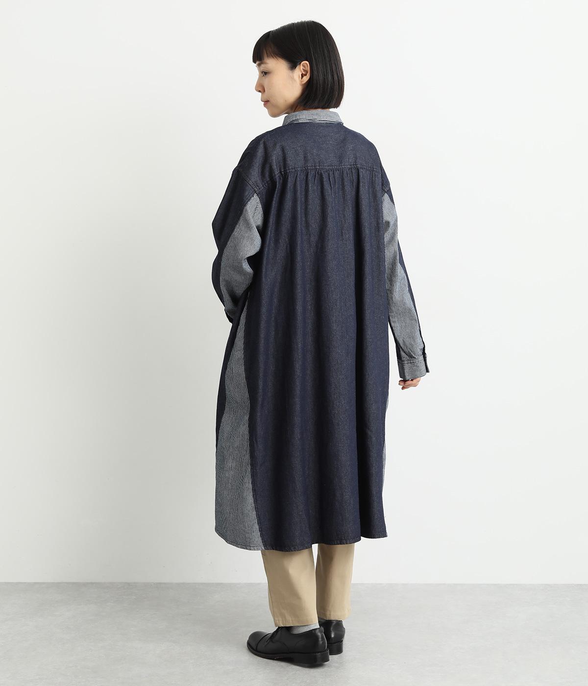 部分的に異素材を組み合わせた切り替えデザインが特徴的で目を惹くワンピース。襟や袖カフスでシャツのようなきちんと感のあるディテールも取り入れています。ジャケット感覚の羽織り使いもおすすめで、着こなし次第でロングシーズン活躍します。