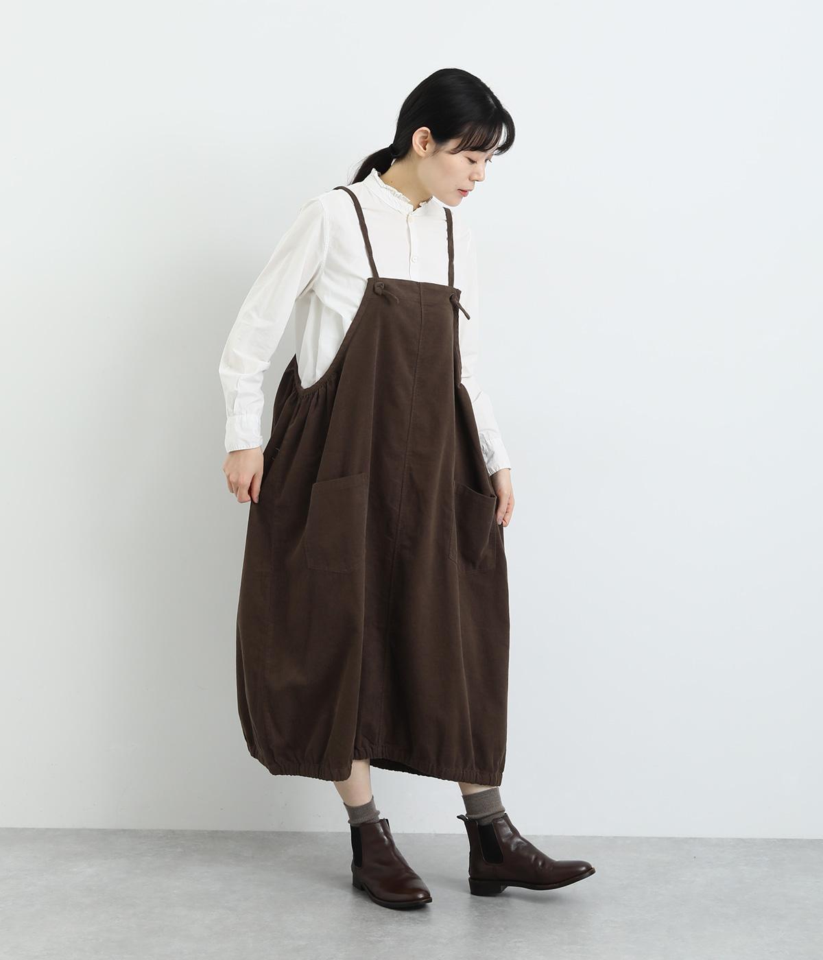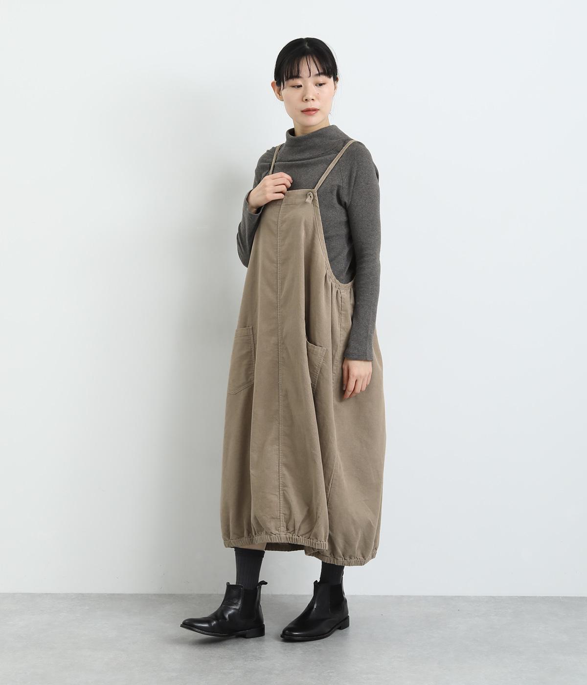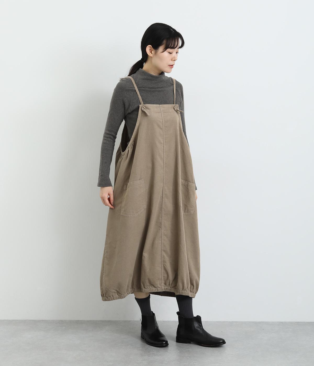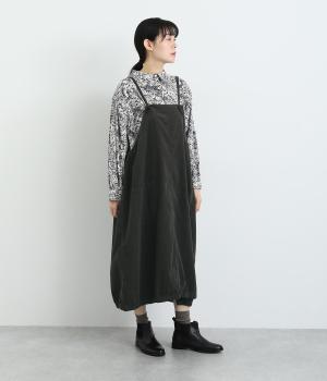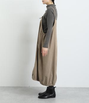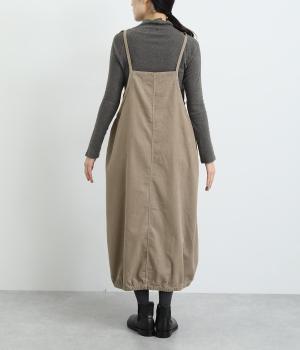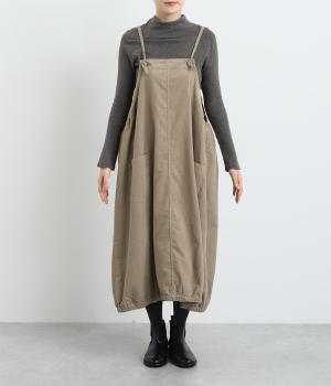 裾のゴムギャザーでバルーンシルエットに仕立てたエプロンワンピースです。スカート部分のボリューム感と細ストラップのバランスが◎。襟ぐりや脇も広くあいているのでさまざまなトップスと合わせられます。結び加減で肩紐の長さ調整も可能。