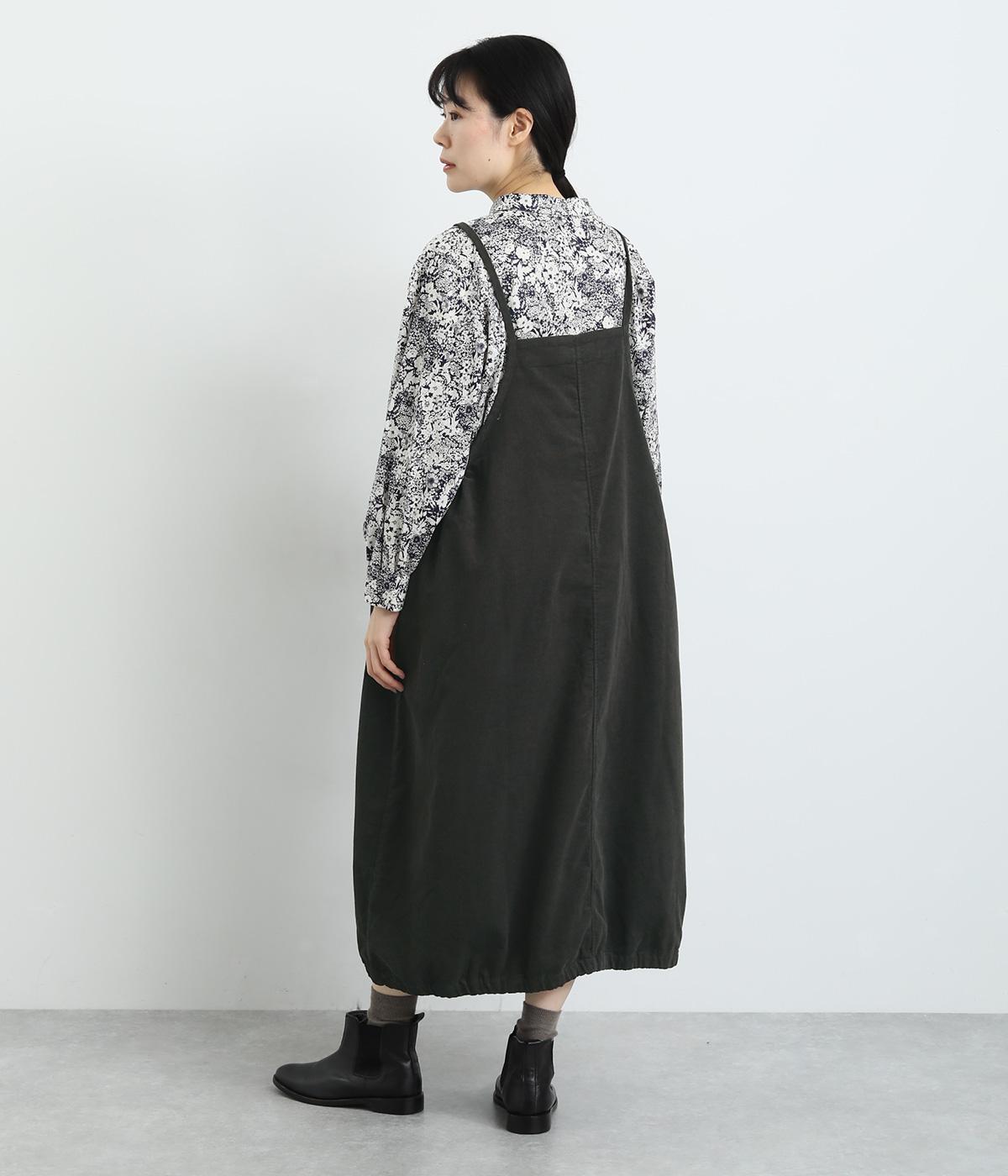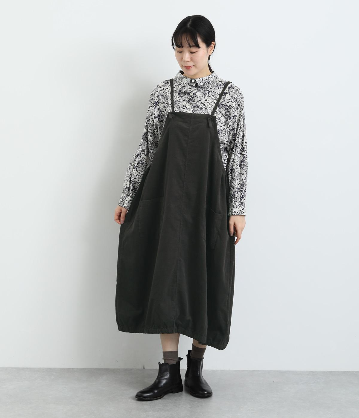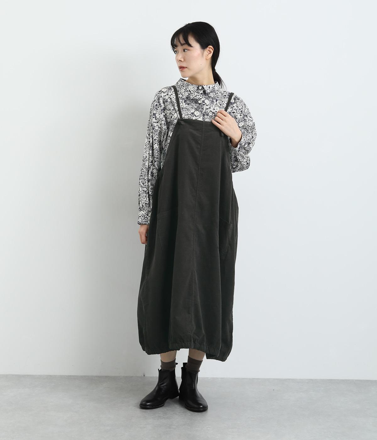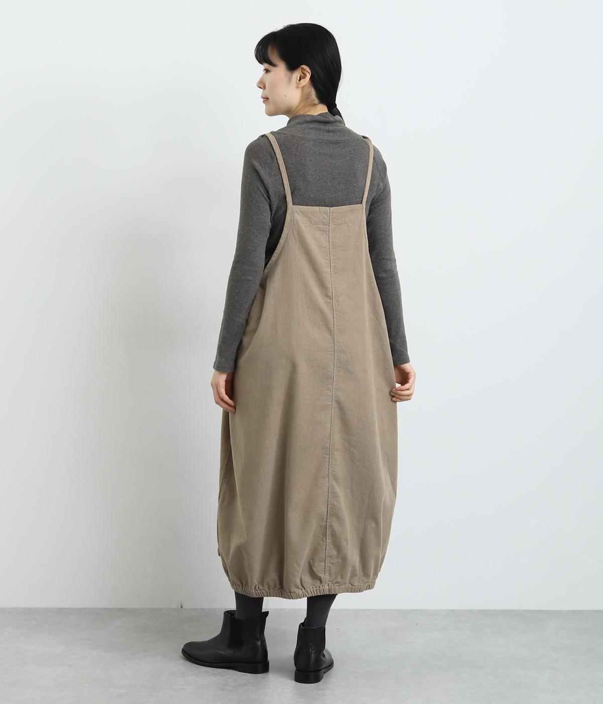 裾のゴムギャザーでバルーンシルエットに仕立てたエプロンワンピースです。スカート部分のボリューム感と細ストラップのバランスが◎。襟ぐりや脇も広くあいているのでさまざまなトップスと合わせられます。結び加減で肩紐の長さ調整も可能。
