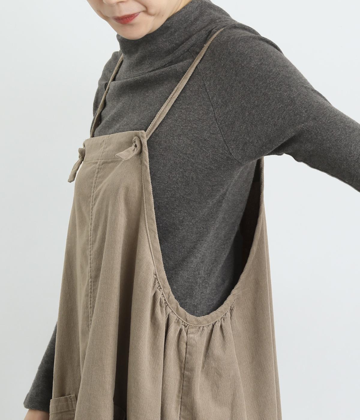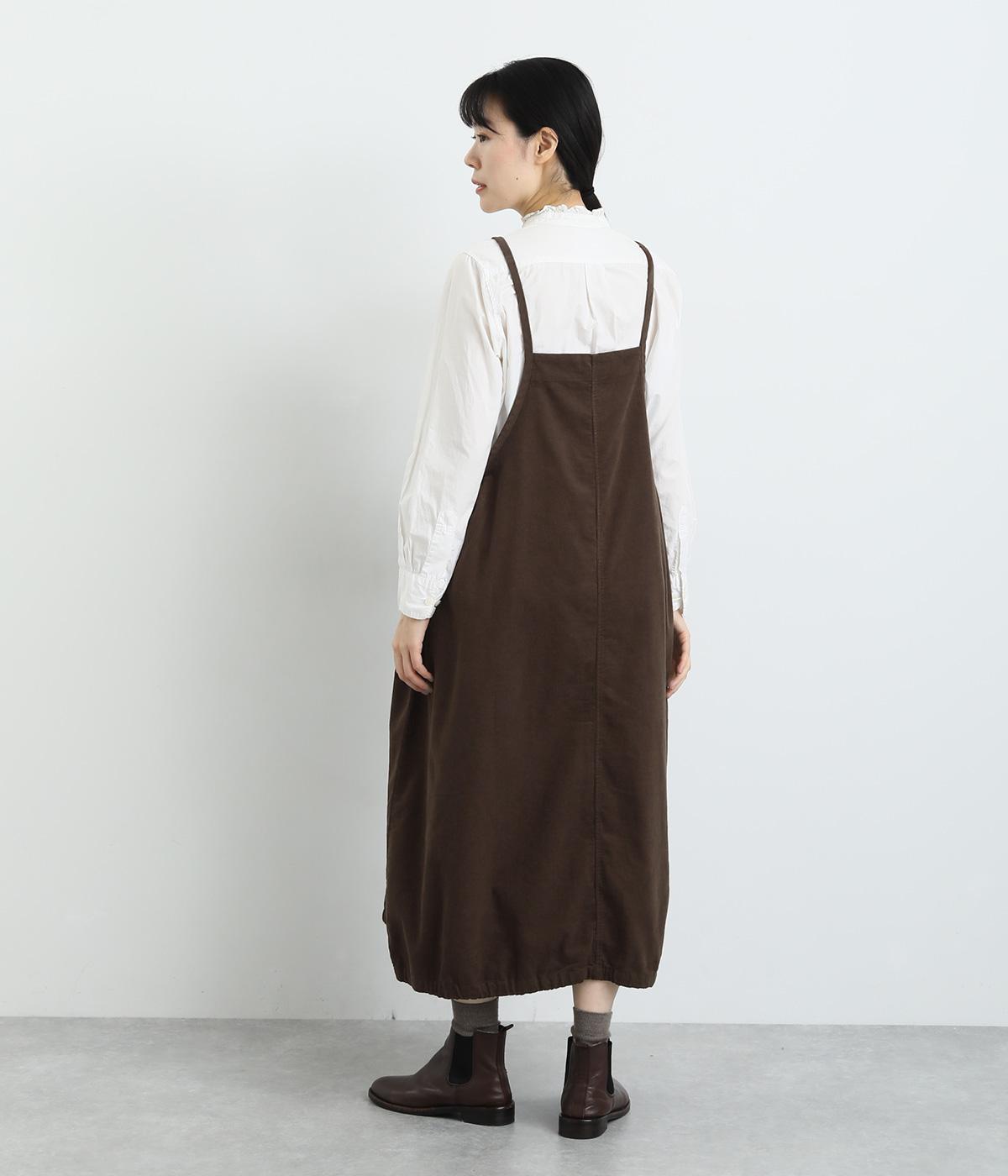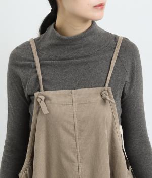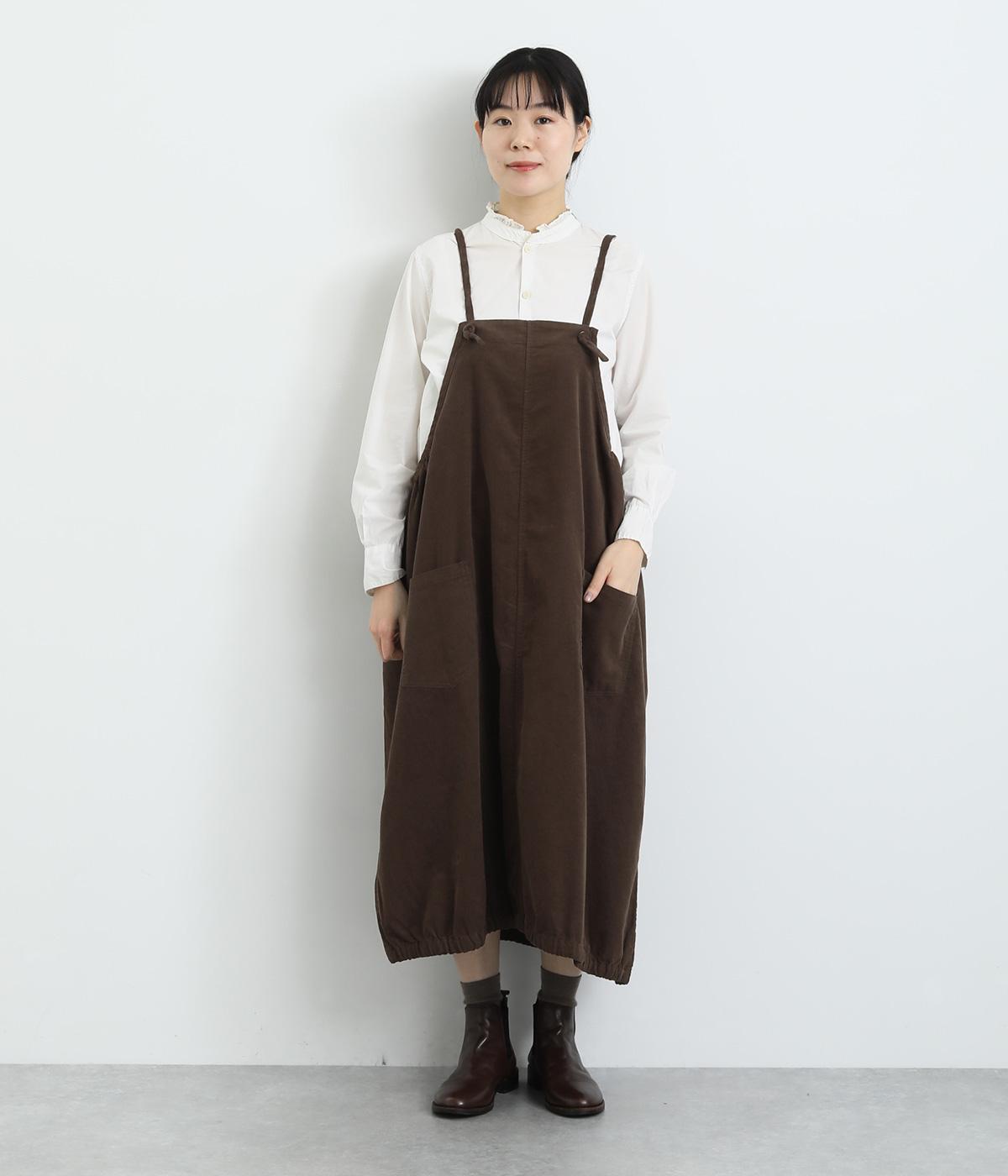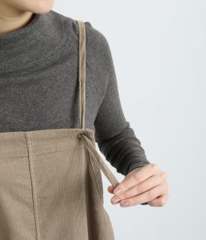 裾のゴムギャザーでバルーンシルエットに仕立てたエプロンワンピースです。スカート部分のボリューム感と細ストラップのバランスが◎。襟ぐりや脇も広くあいているのでさまざまなトップスと合わせられます。結び加減で肩紐の長さ調整も可能。