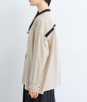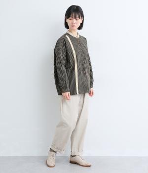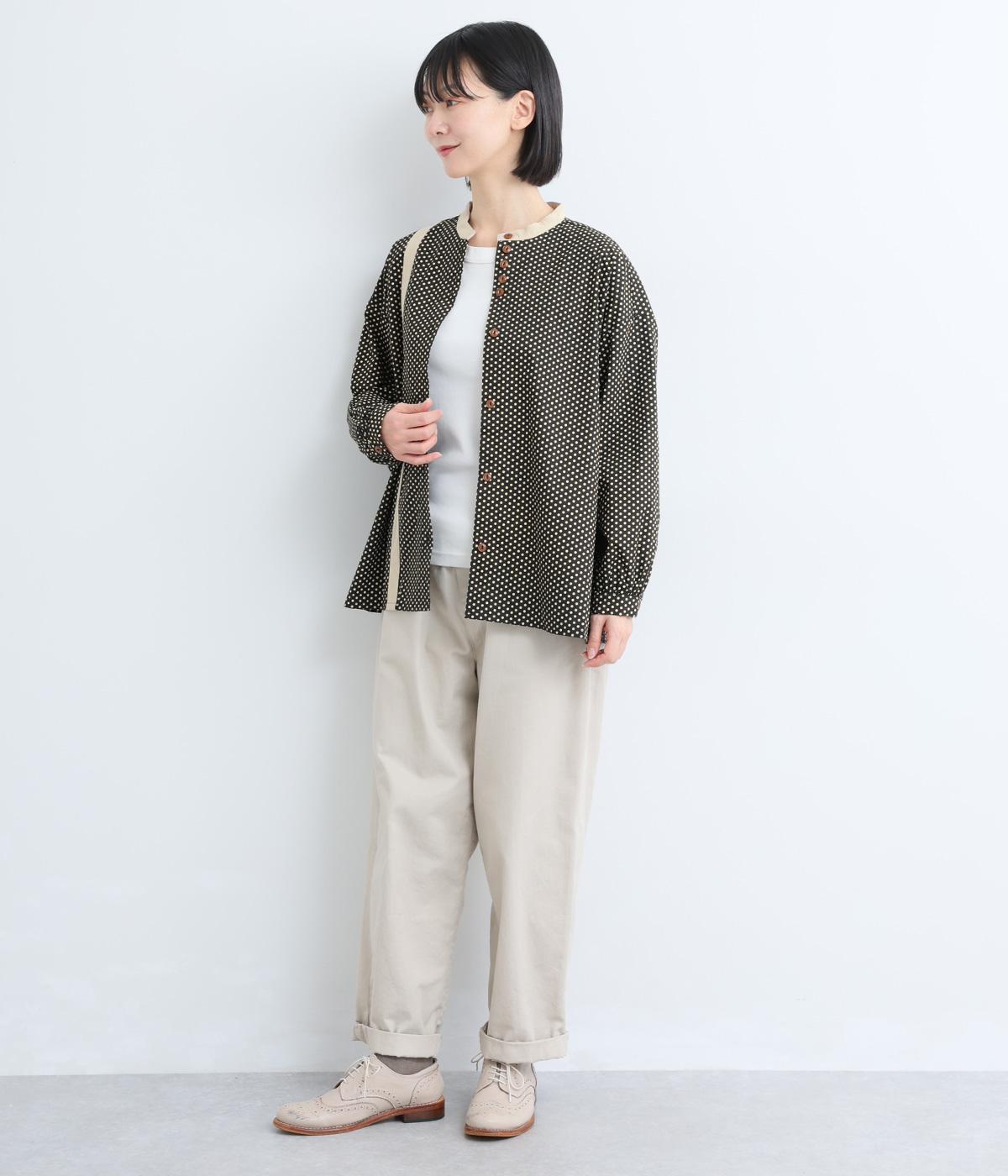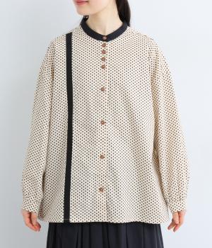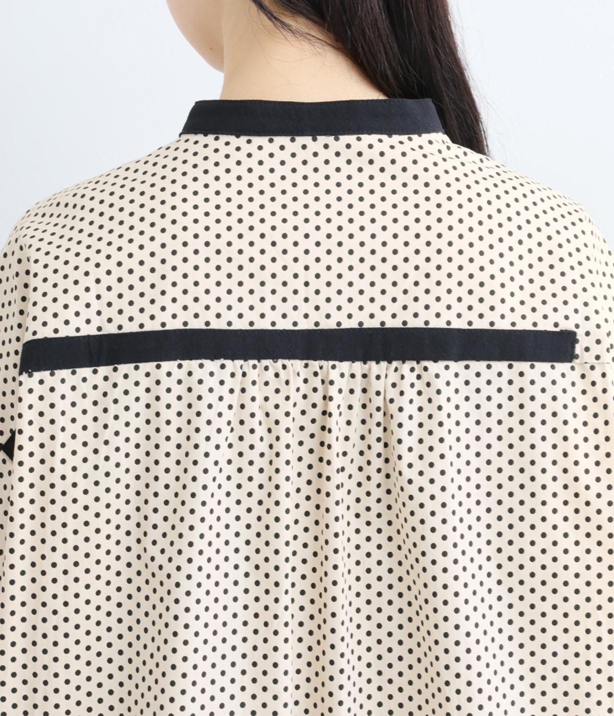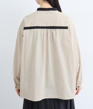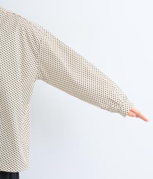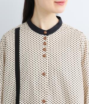 ややハリのある、さらりとした肌ざわりのコットン素材を使用しています。甘くなりすぎない、小さめのドットプリントが大人顔に。