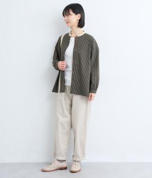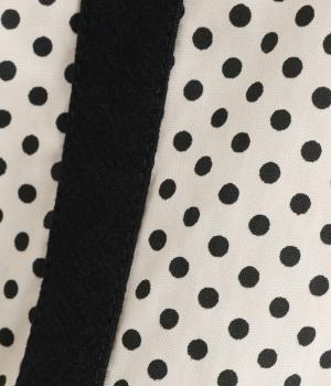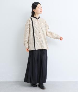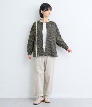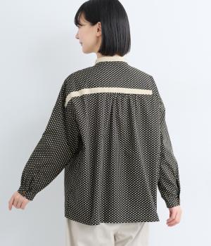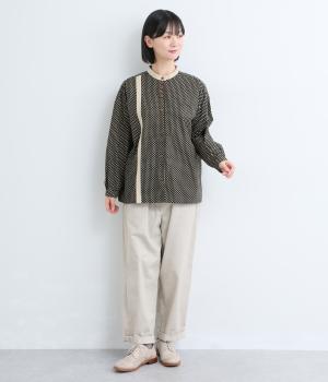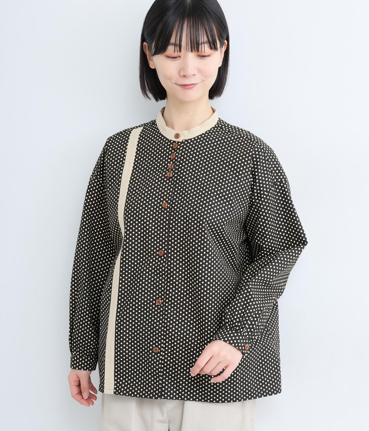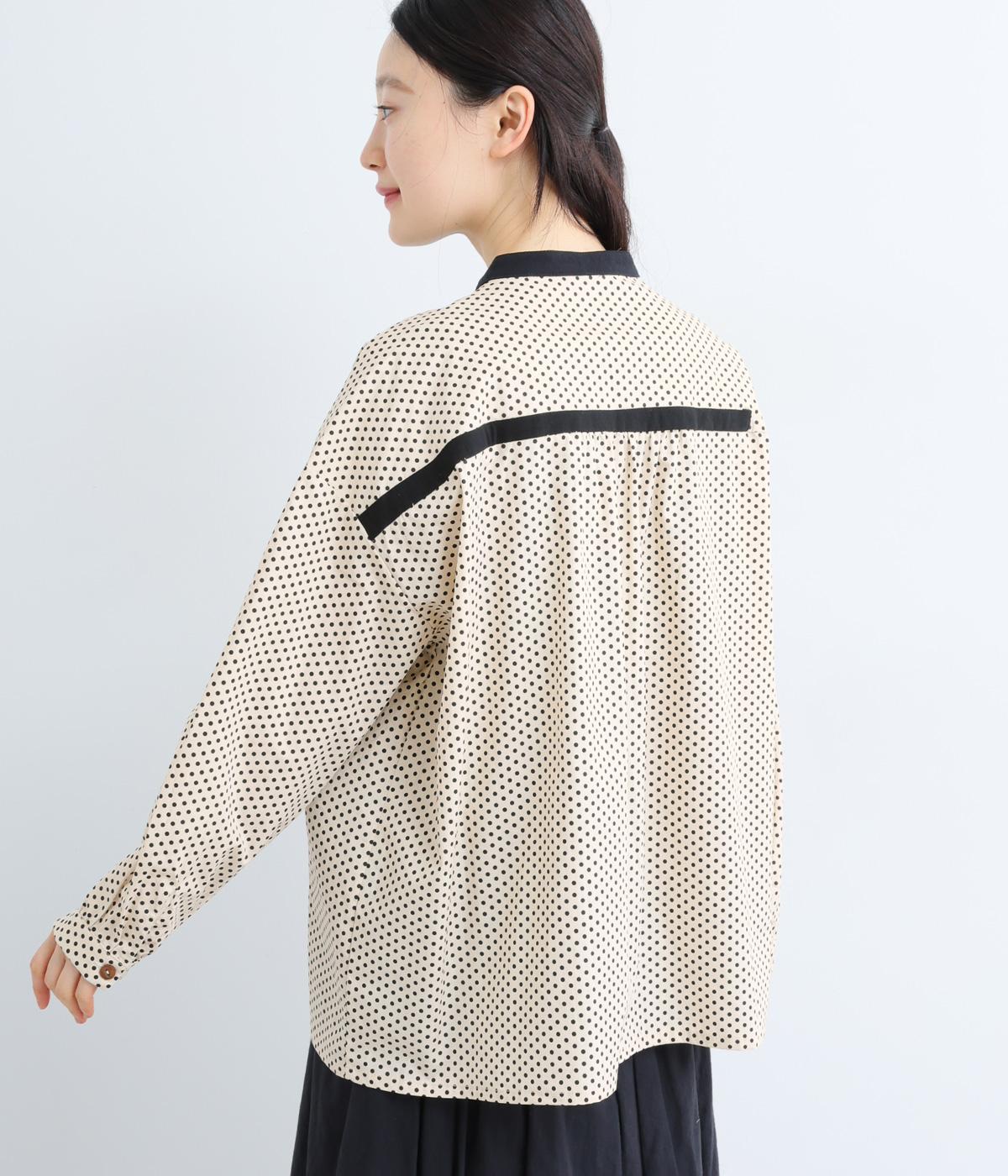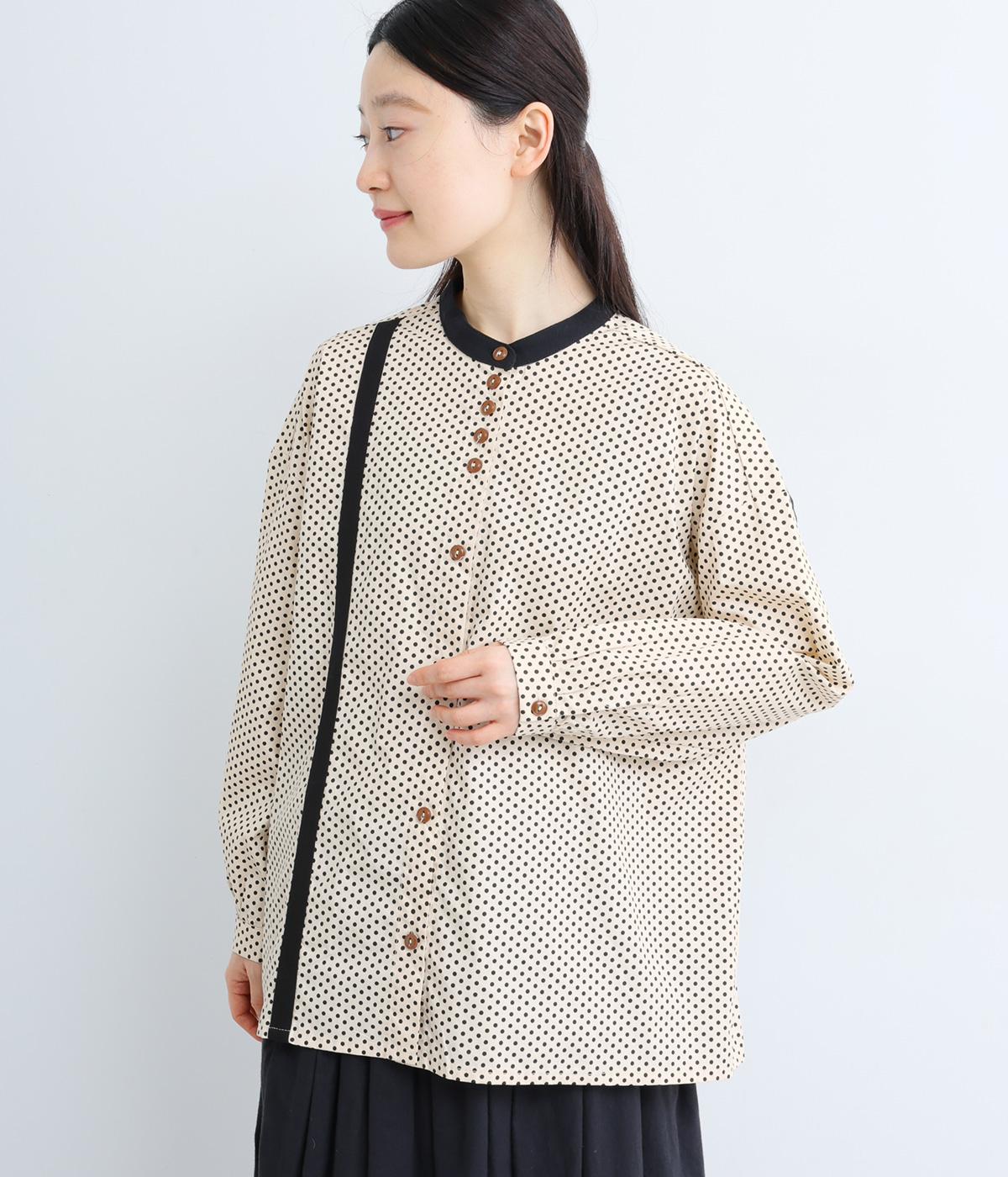 ややハリのある、さらりとした肌ざわりのコットン素材を使用しています。甘くなりすぎない、小さめのドットプリントが大人顔に。
