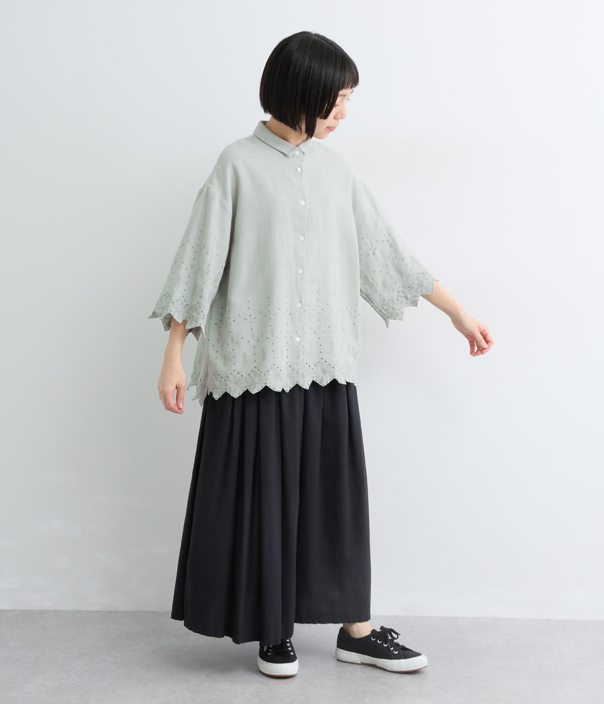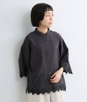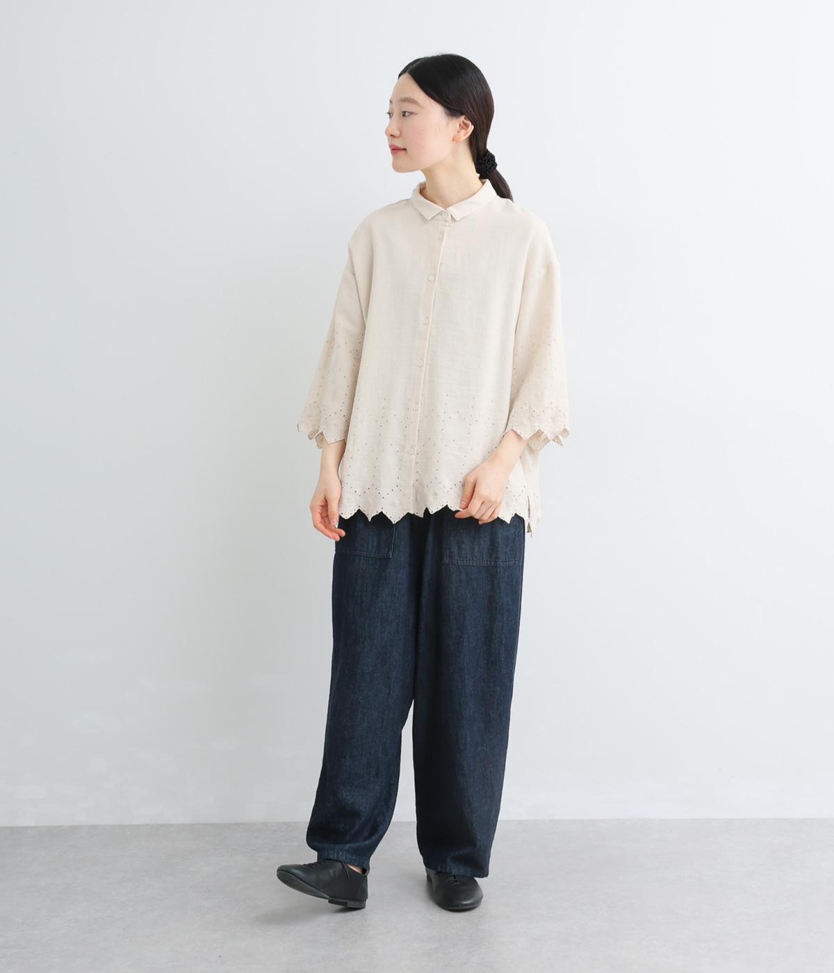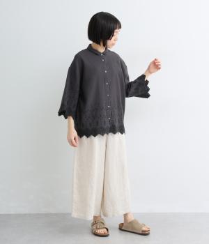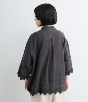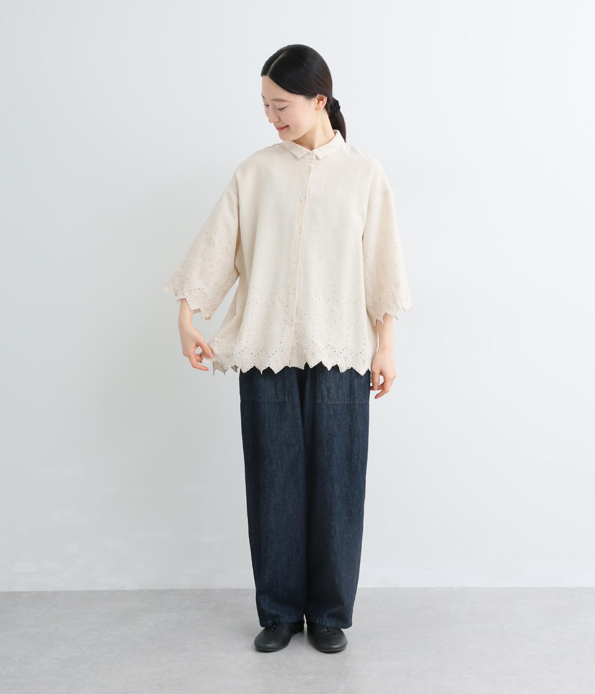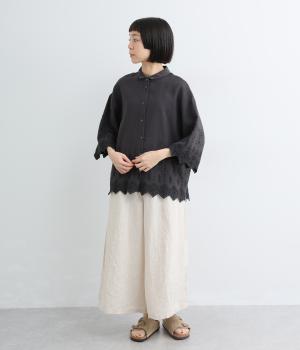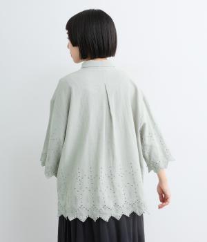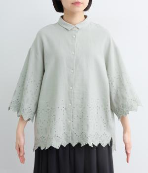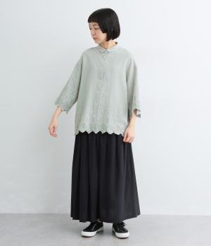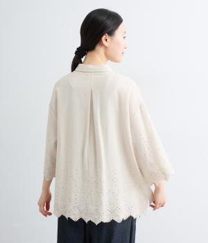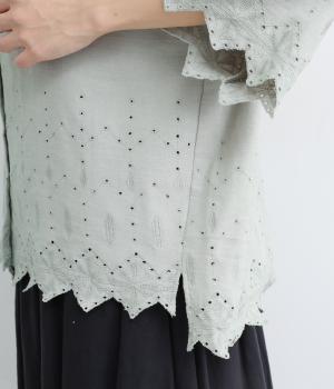 裾に施されたスカラップ刺しゅうが、上品な華やかさを演出するブラウスです。袖と裾の繊細なレースの透け感は、装いに奥行きと軽やかさをプラス。裾に向かって広がるシルエットが、腰まわりを自然にカバーしてくれます。