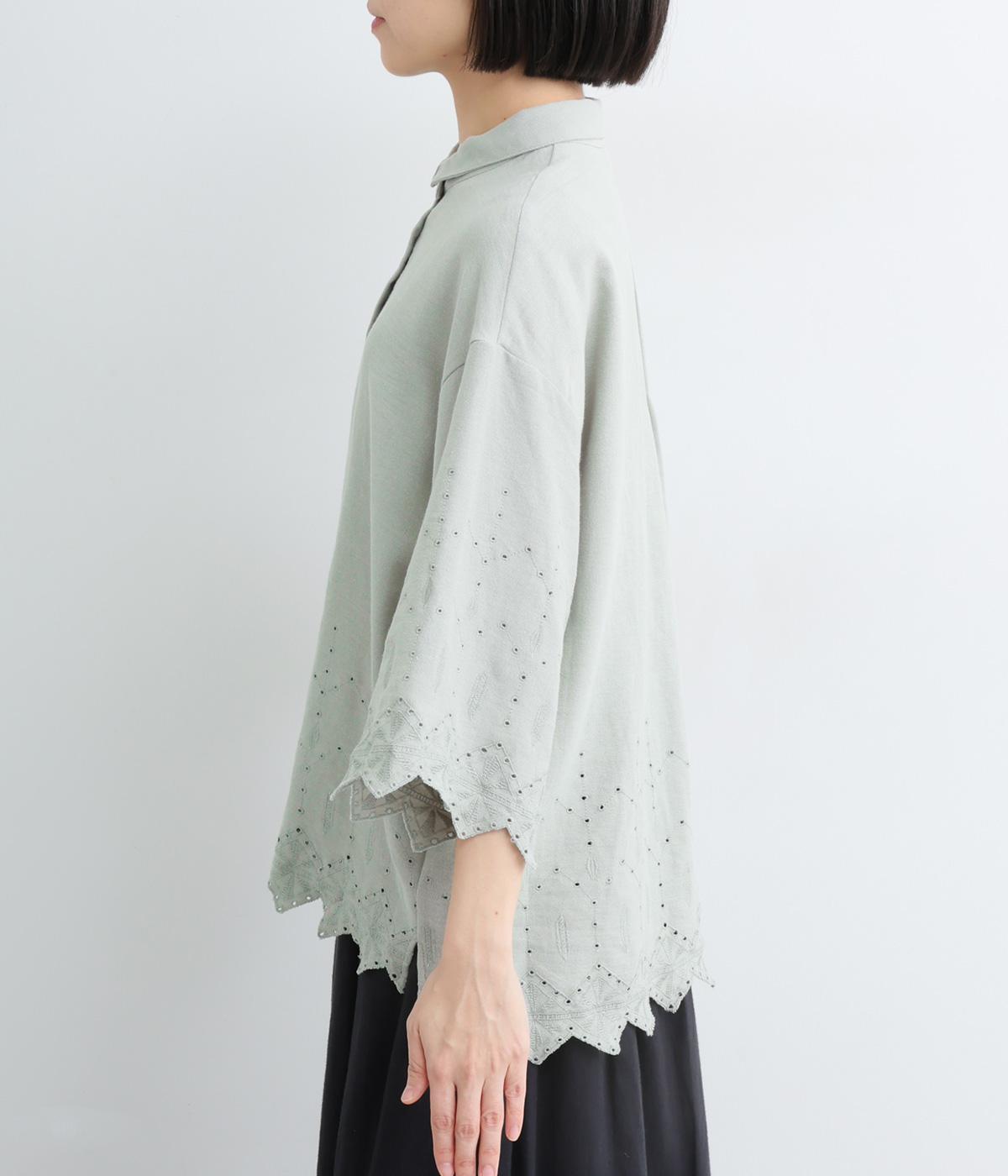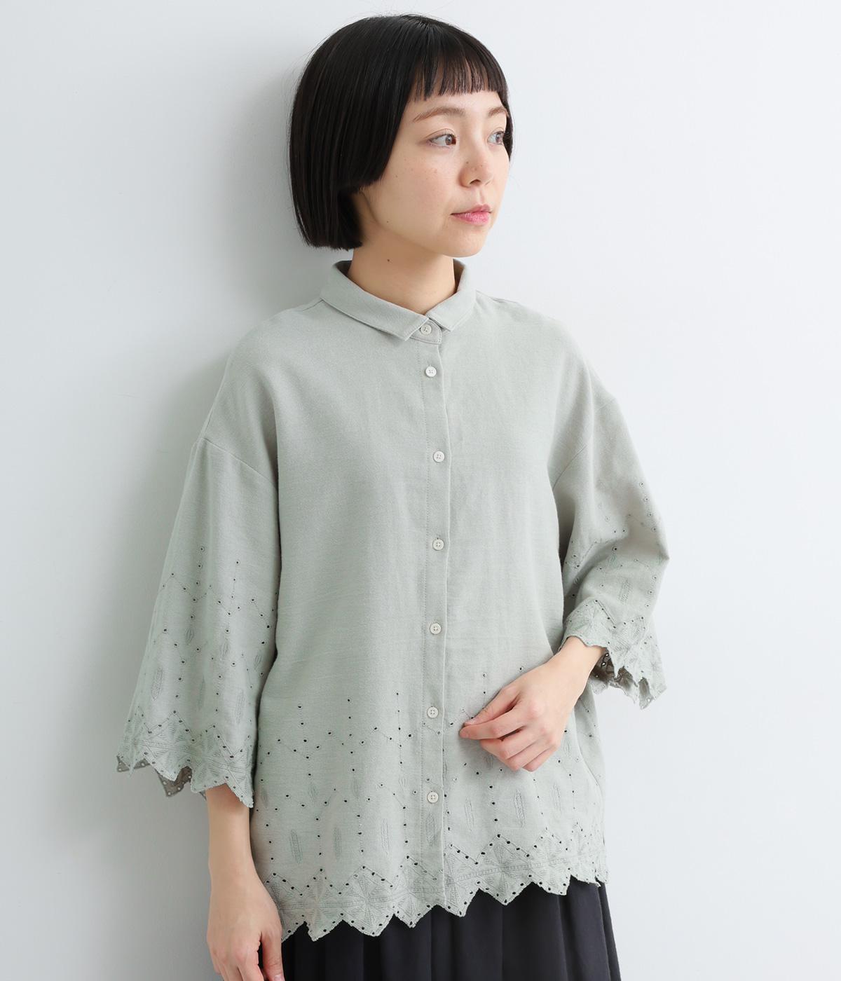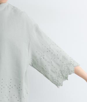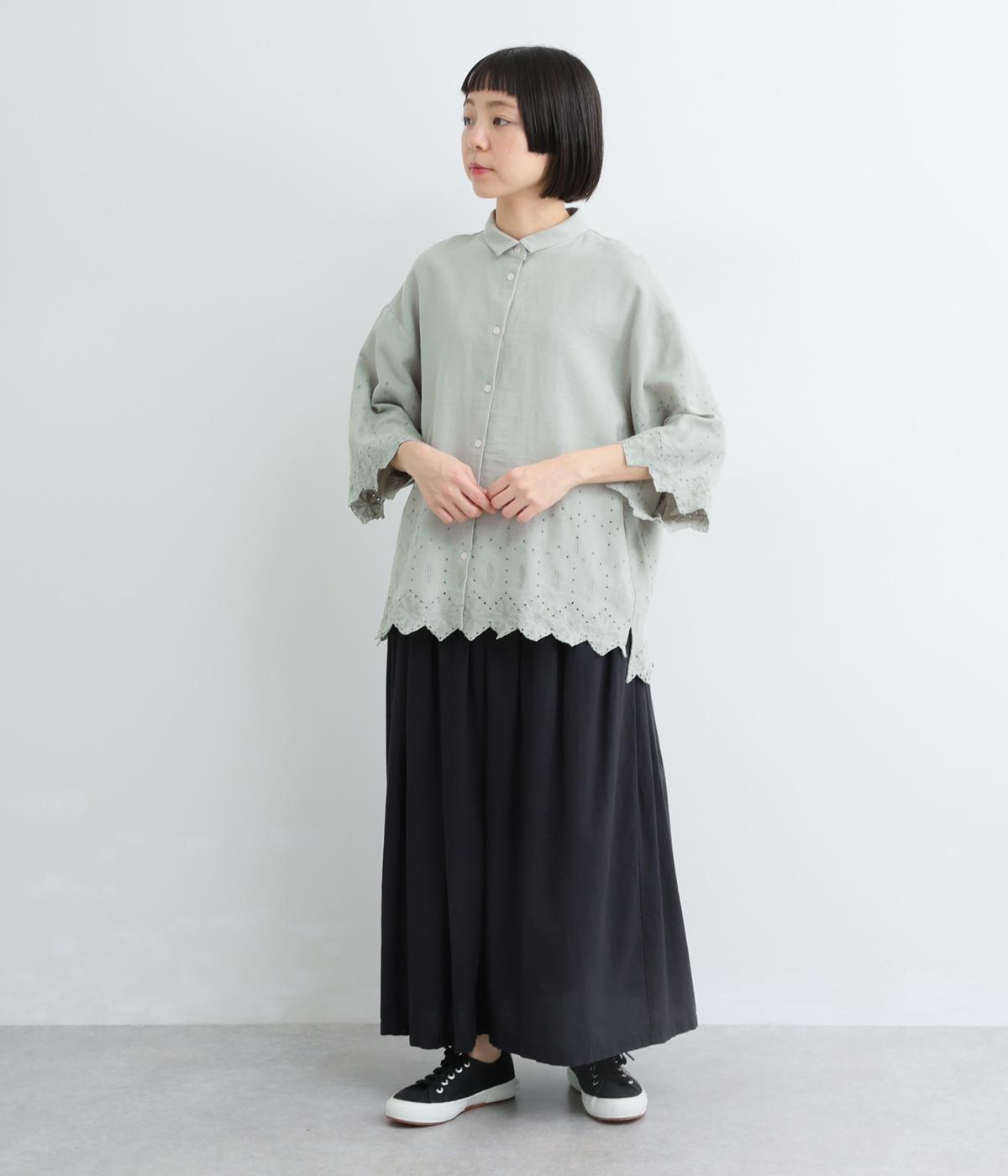 裾に施されたスカラップ刺しゅうが、上品な華やかさを演出するブラウスです。袖と裾の繊細なレースの透け感は、装いに奥行きと軽やかさをプラス。裾に向かって広がるシルエットが、腰まわりを自然にカバーしてくれます。