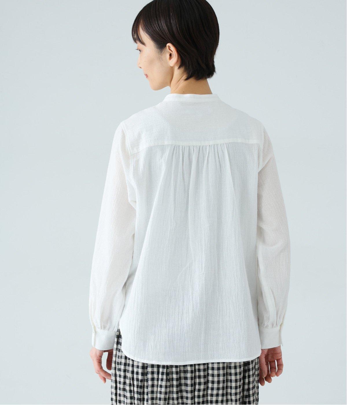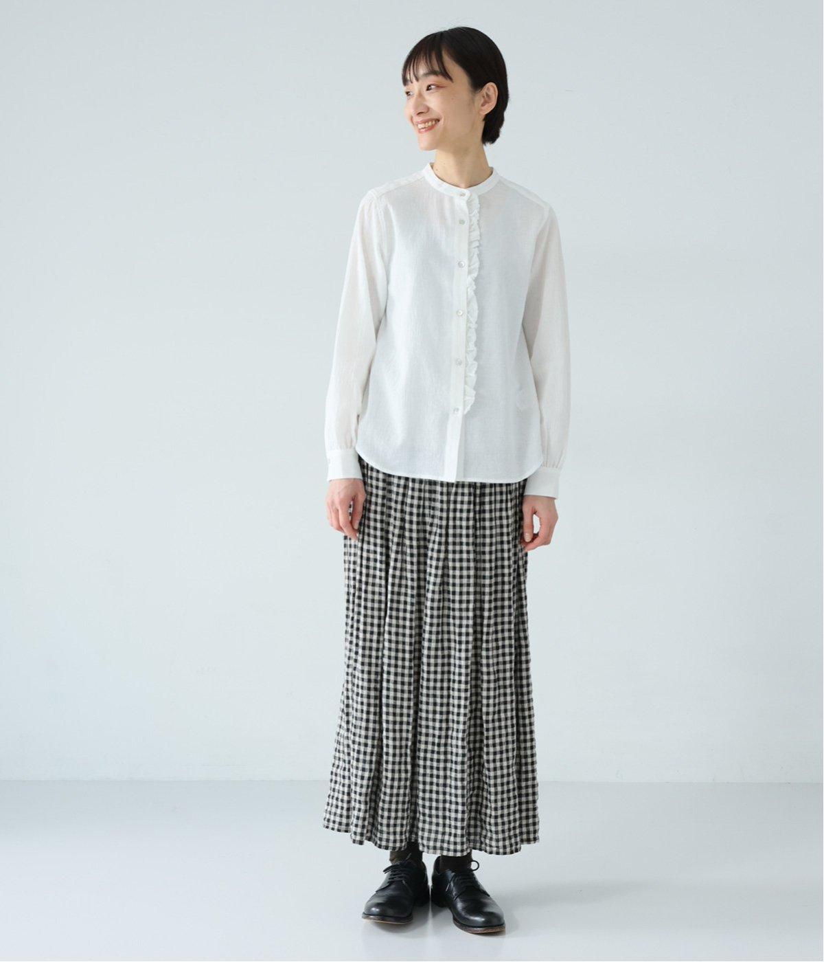 きちんと感ただようバンドカラーシャツのフロントにフリルをあしらって甘さをプラス。フリル部分は取り外し可能で、気分やスタイルに合わせて異なる表情をたのしめます。背中や袖口のギャザー、ラウンドヘムなど細かなディテールにもこだわりました。