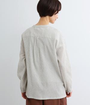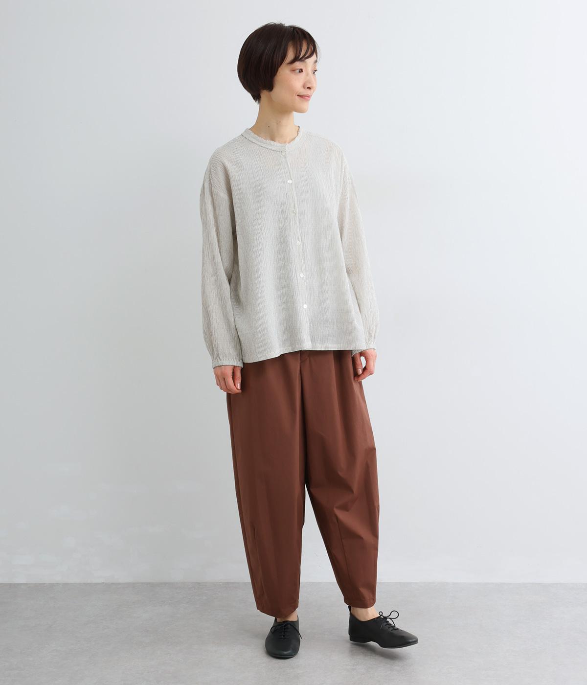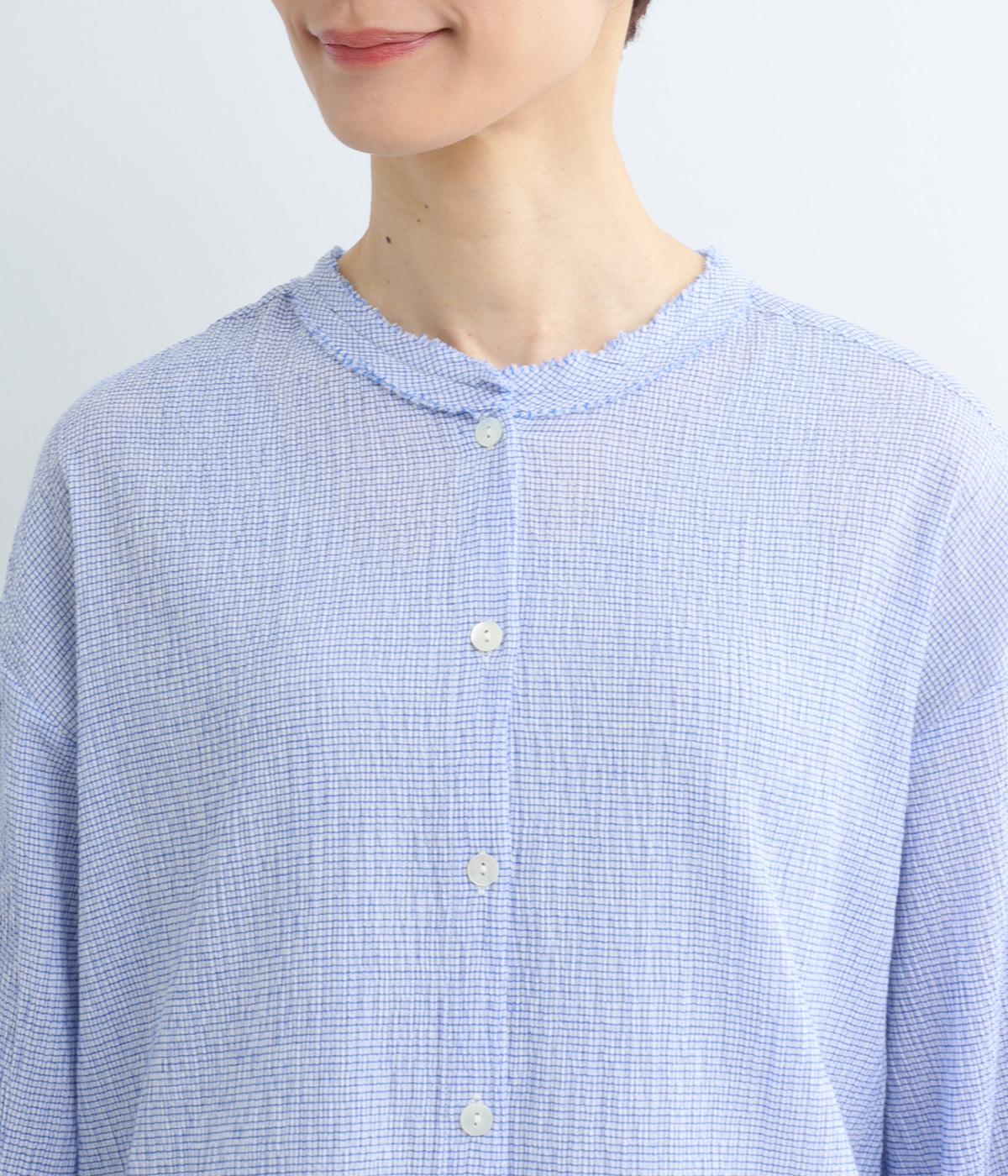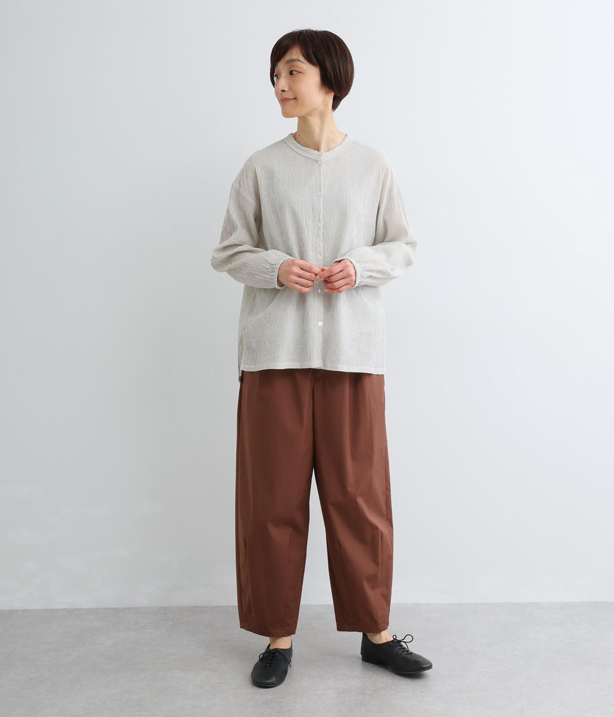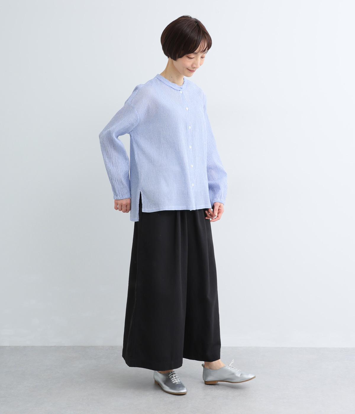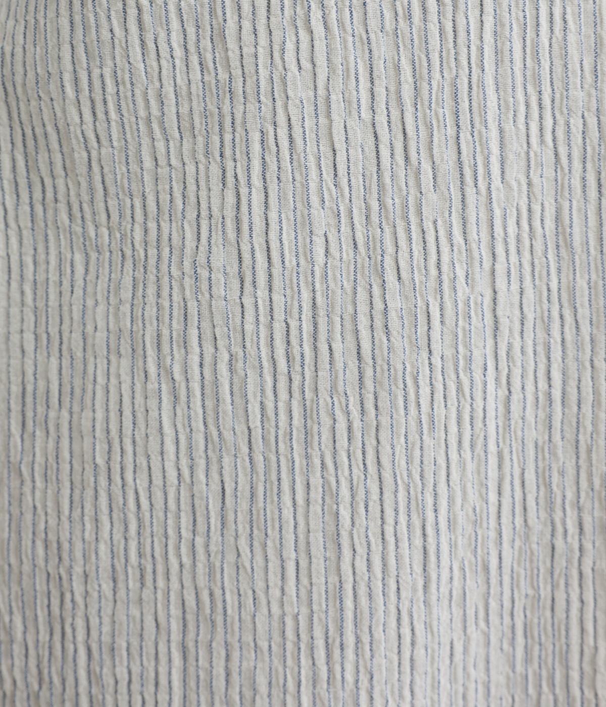 強撚糸のコットンにストレッチ糸を織り込み、自然なシワ感を表現した素材です。シャリ感のあるドライなタッチで、さらりとした肌ざわりに。扱いやすく、日常使いに取り入れやすい仕上がりです。