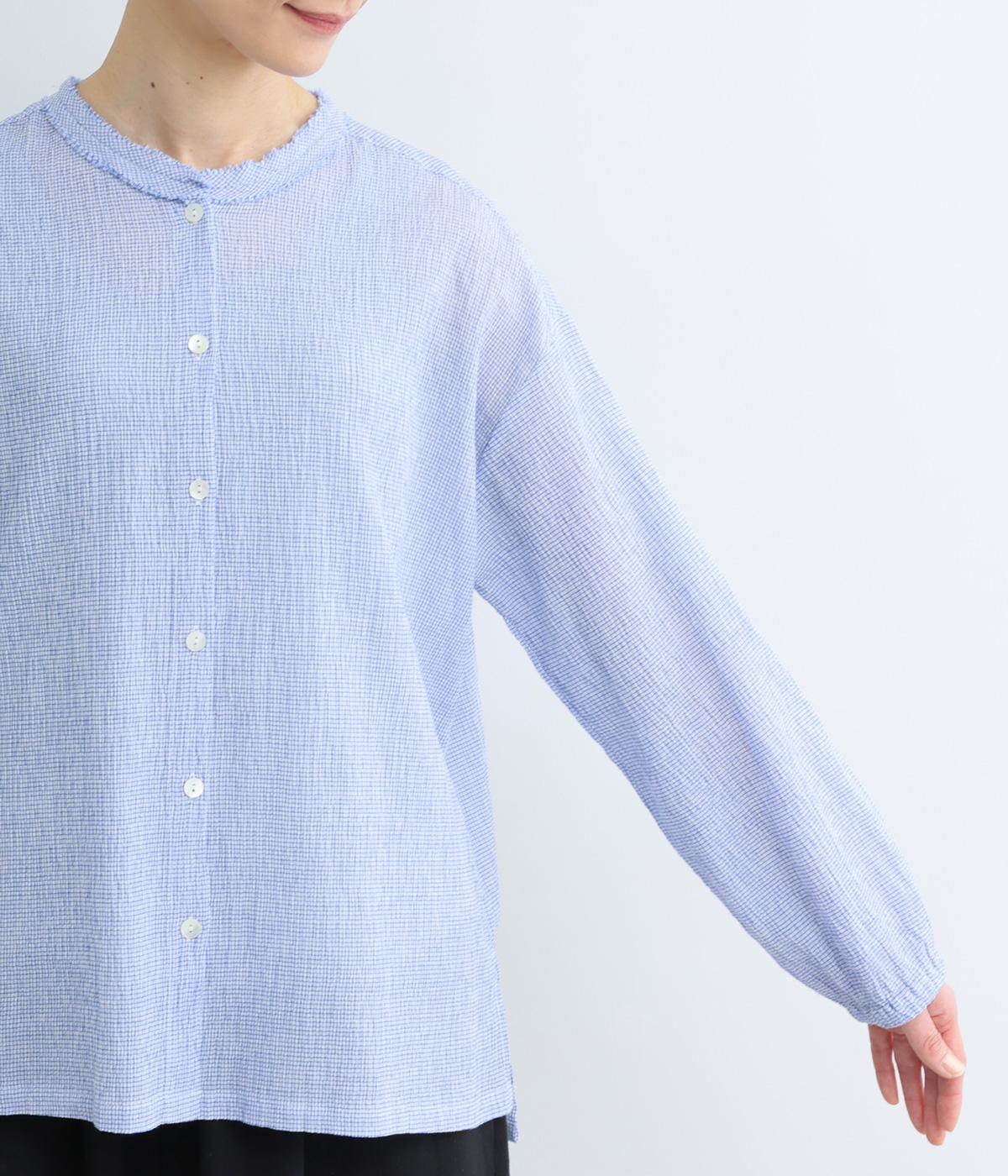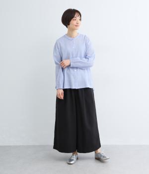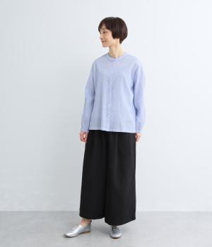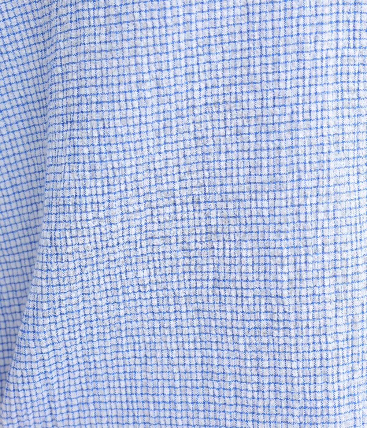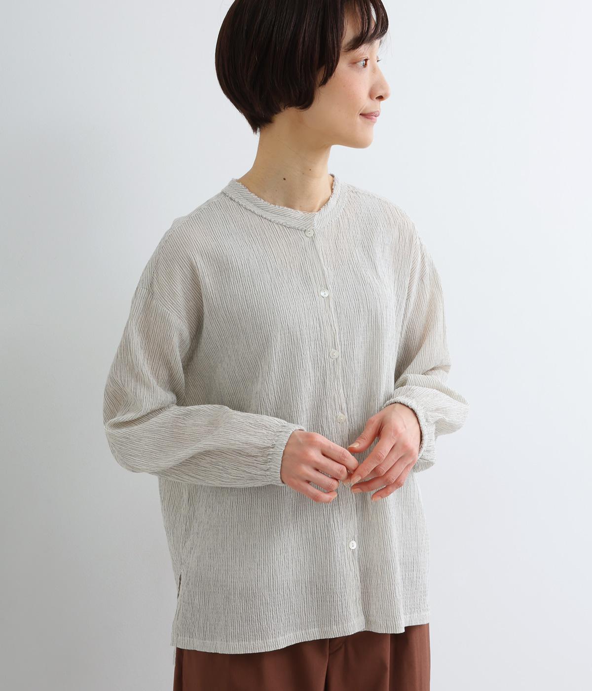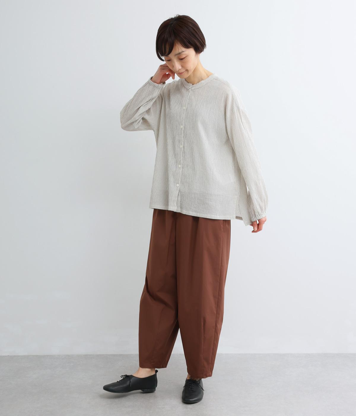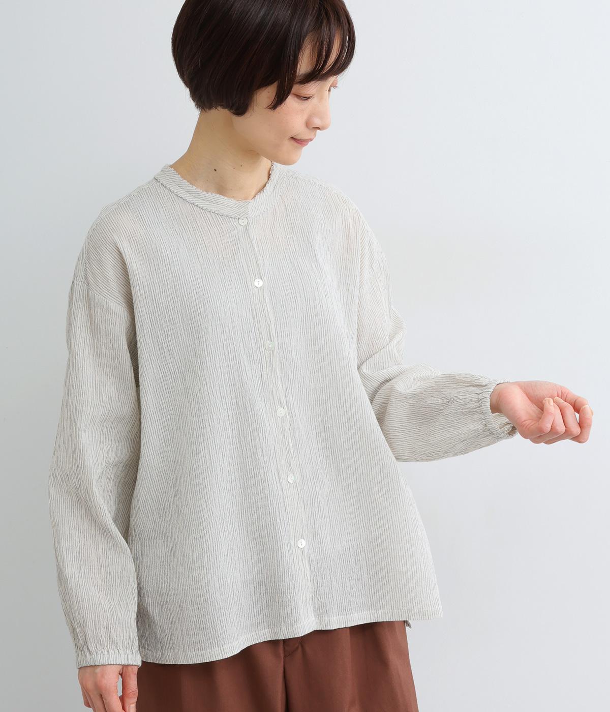 強撚糸のコットンにストレッチ糸を織り込み、自然なシワ感を表現した素材です。シャリ感のあるドライなタッチで、さらりとした肌ざわりに。扱いやすく、日常使いに取り入れやすい仕上がりです。