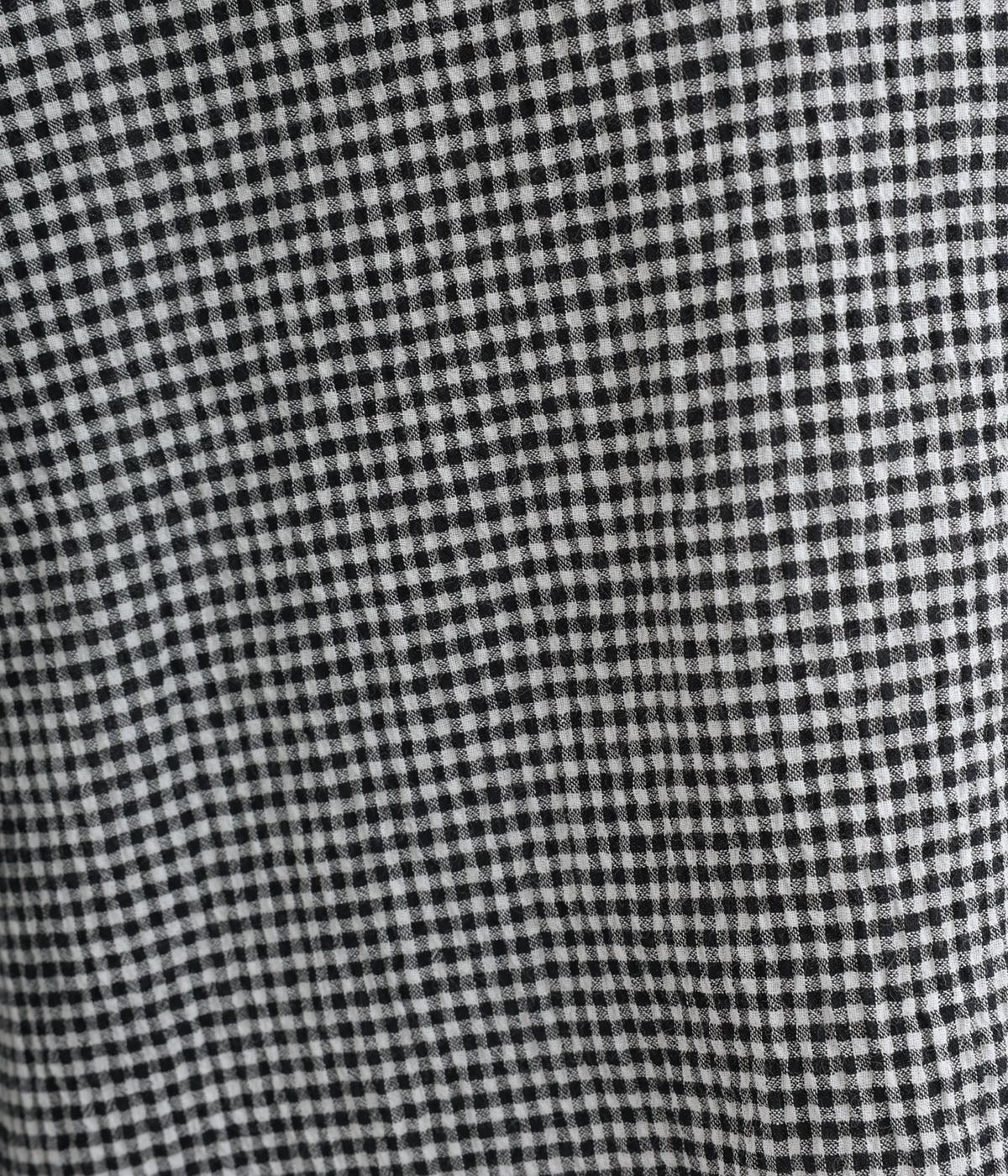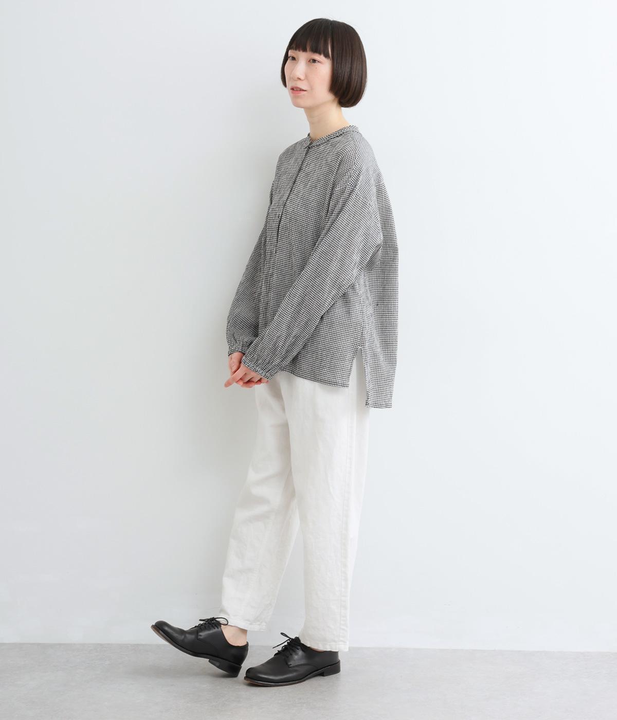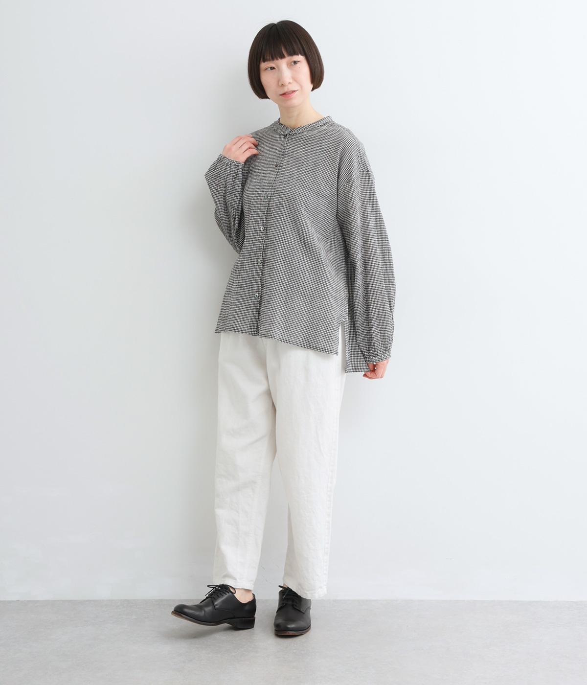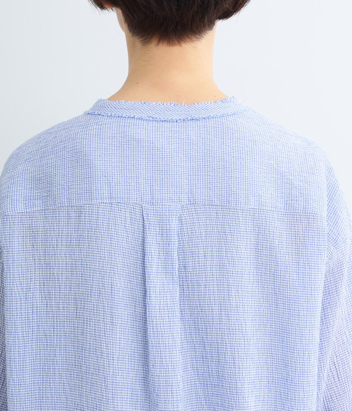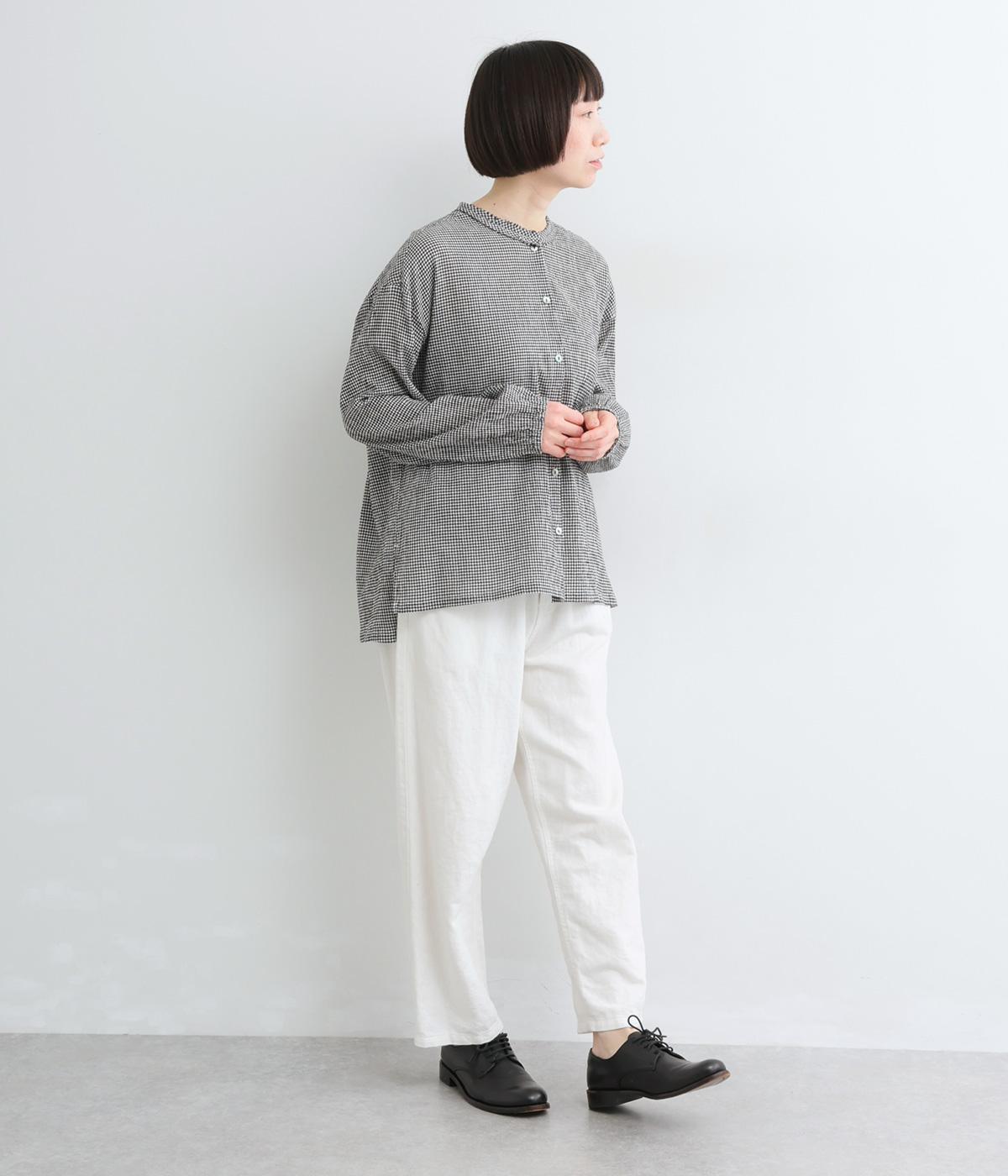 強撚糸のコットンにストレッチ糸を織り込み、自然なシワ感を表現した素材です。シャリ感のあるドライなタッチで、さらりとした肌ざわりに。扱いやすく、日常使いに取り入れやすい仕上がりです。