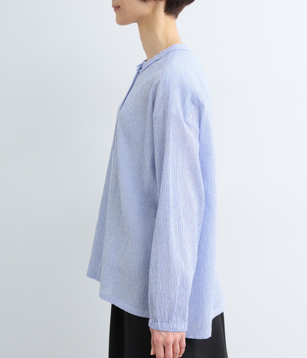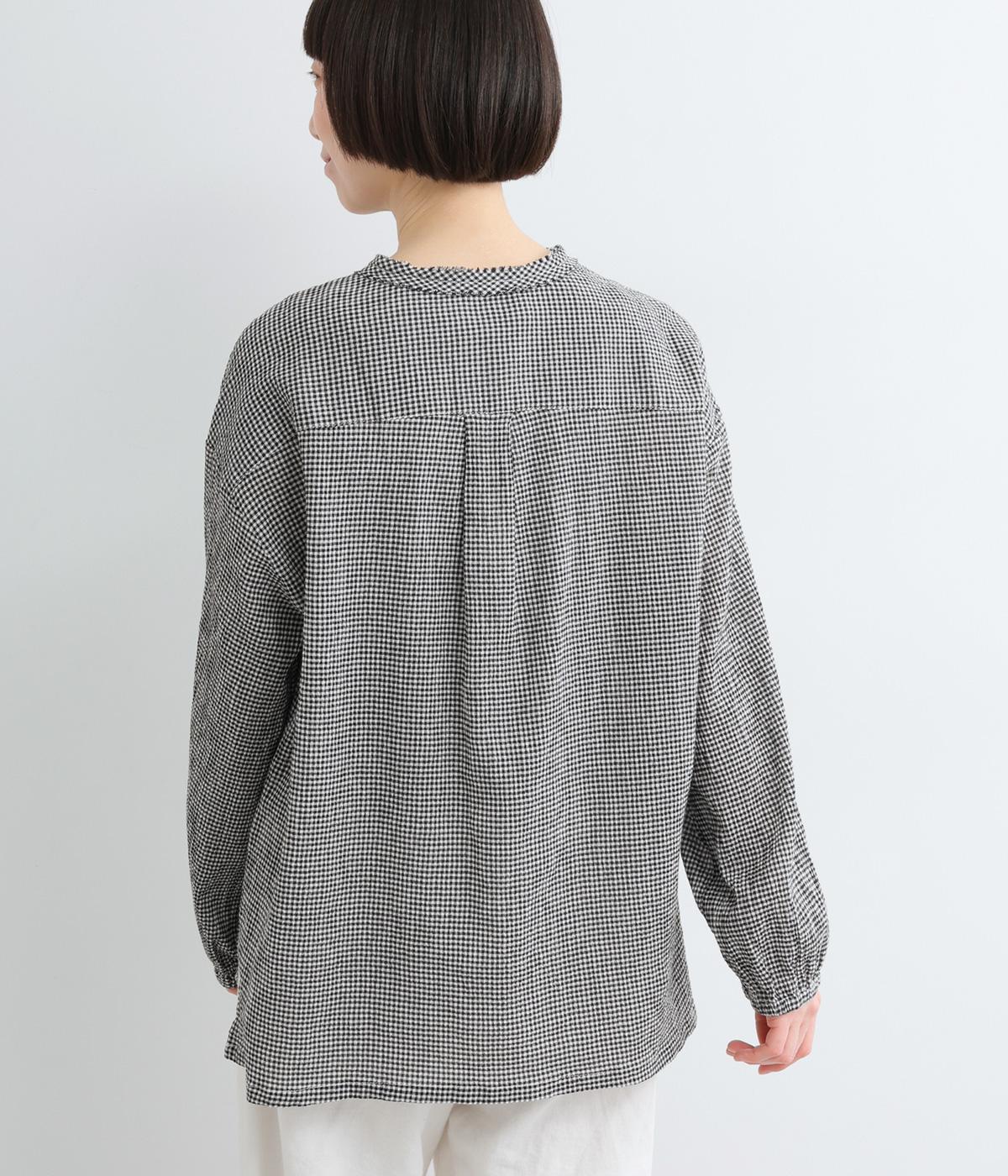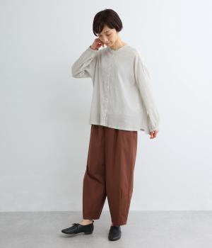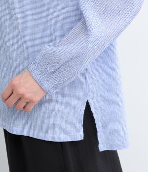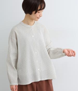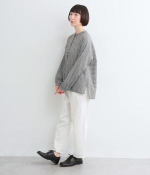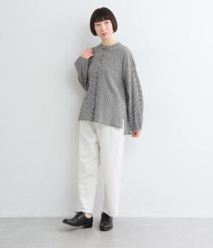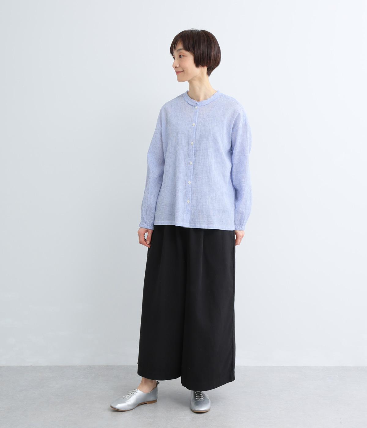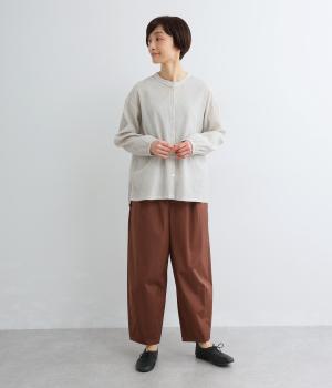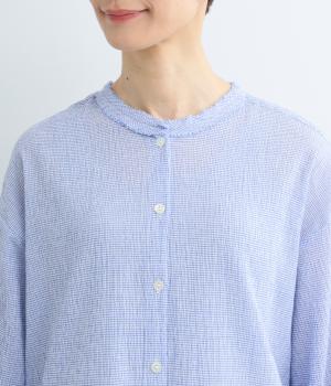 裁ち切り仕様のフリルを襟ぐりにあしらい、上品なアクセントを添えたデザインです。ゆとりのあるシルエットで、やわらかな印象に仕上げています。袖口はゴム入りで、アレンジしやすいのも◎。前をあけて羽織り風の着こなしもおすすめです。
