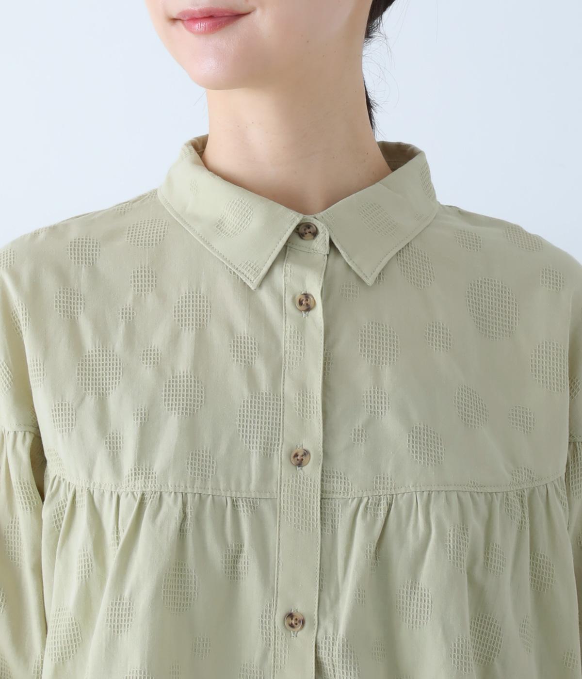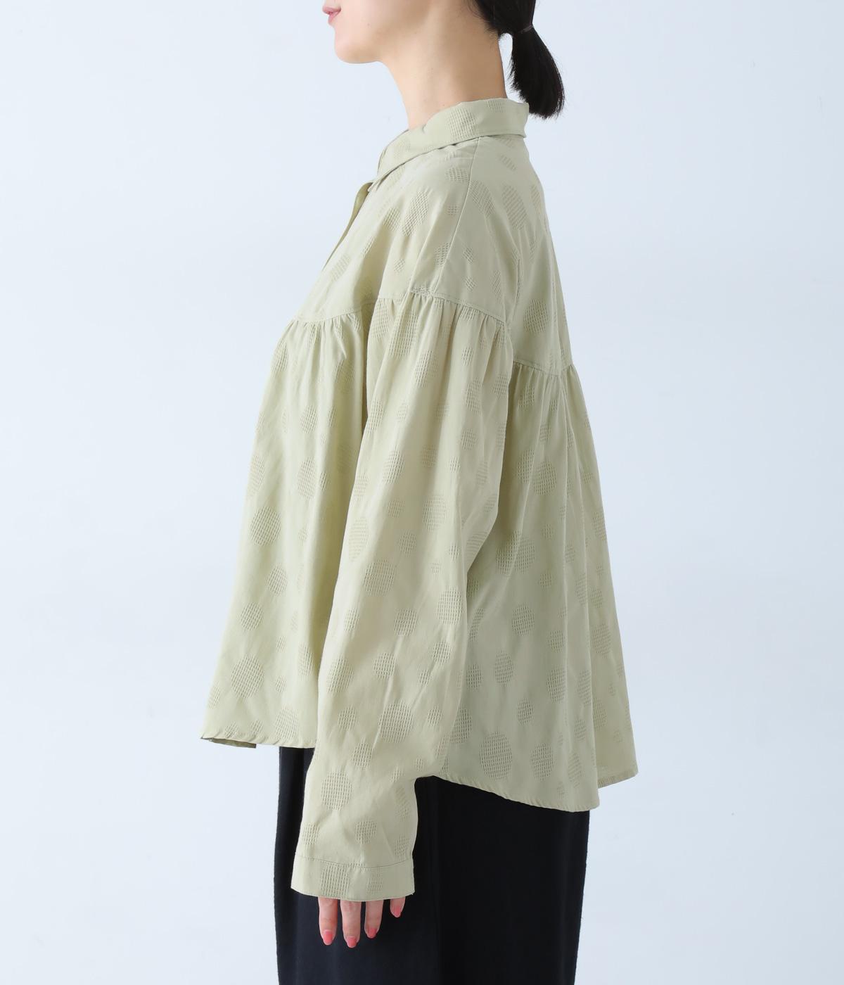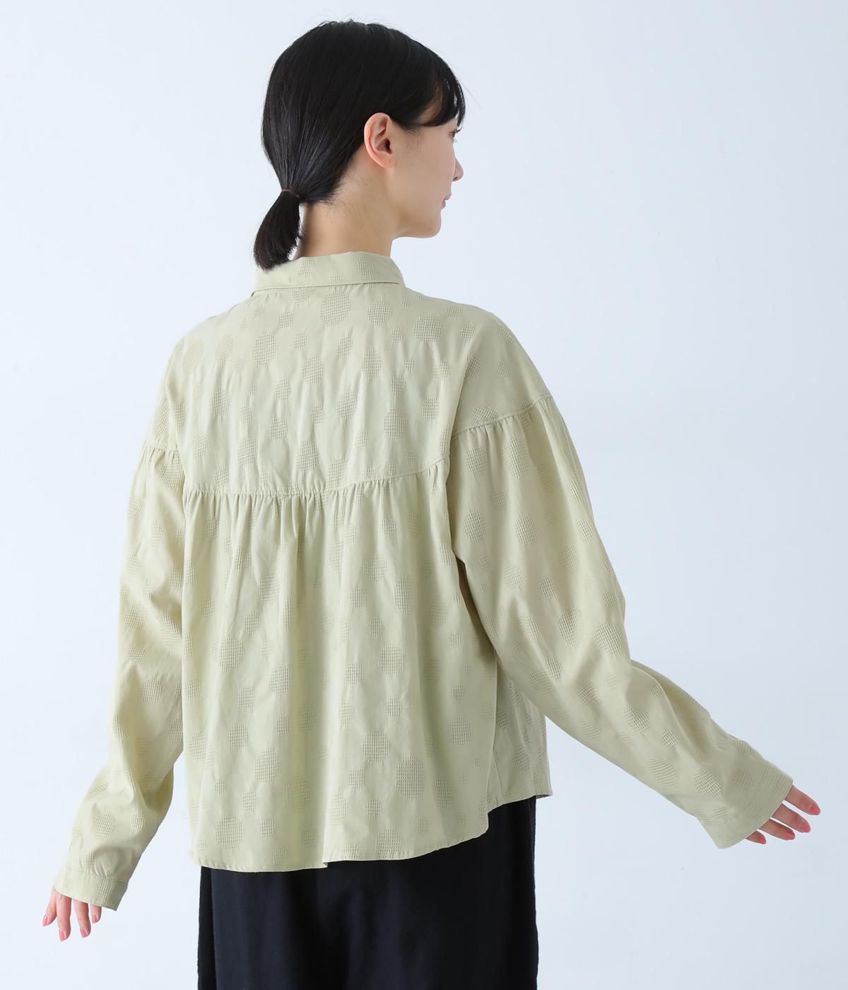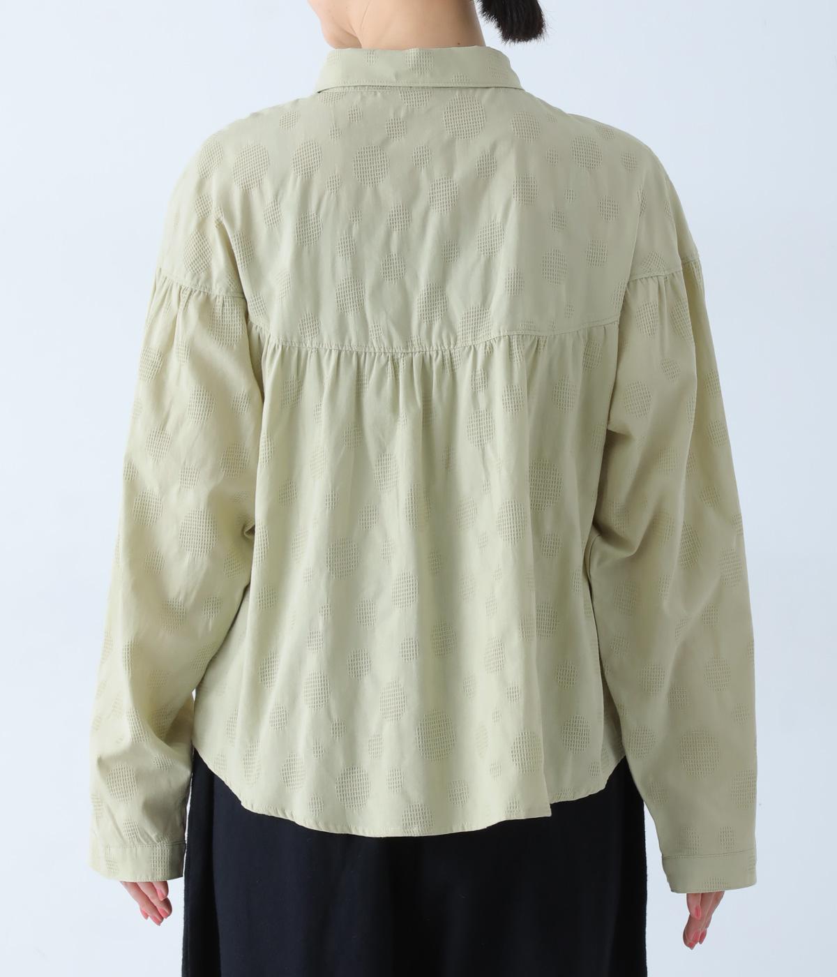 ランダムに配置したドット柄をジャカード織りで立体的に表現したシャツ。胸元と二の腕部分に入れたギャザーが柔らかな表情を添えてくれます。なだらかな前後差のある裾丈で、前裾はやや短めのバランスよいシルエットです。