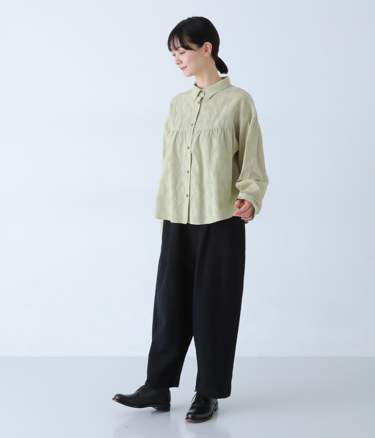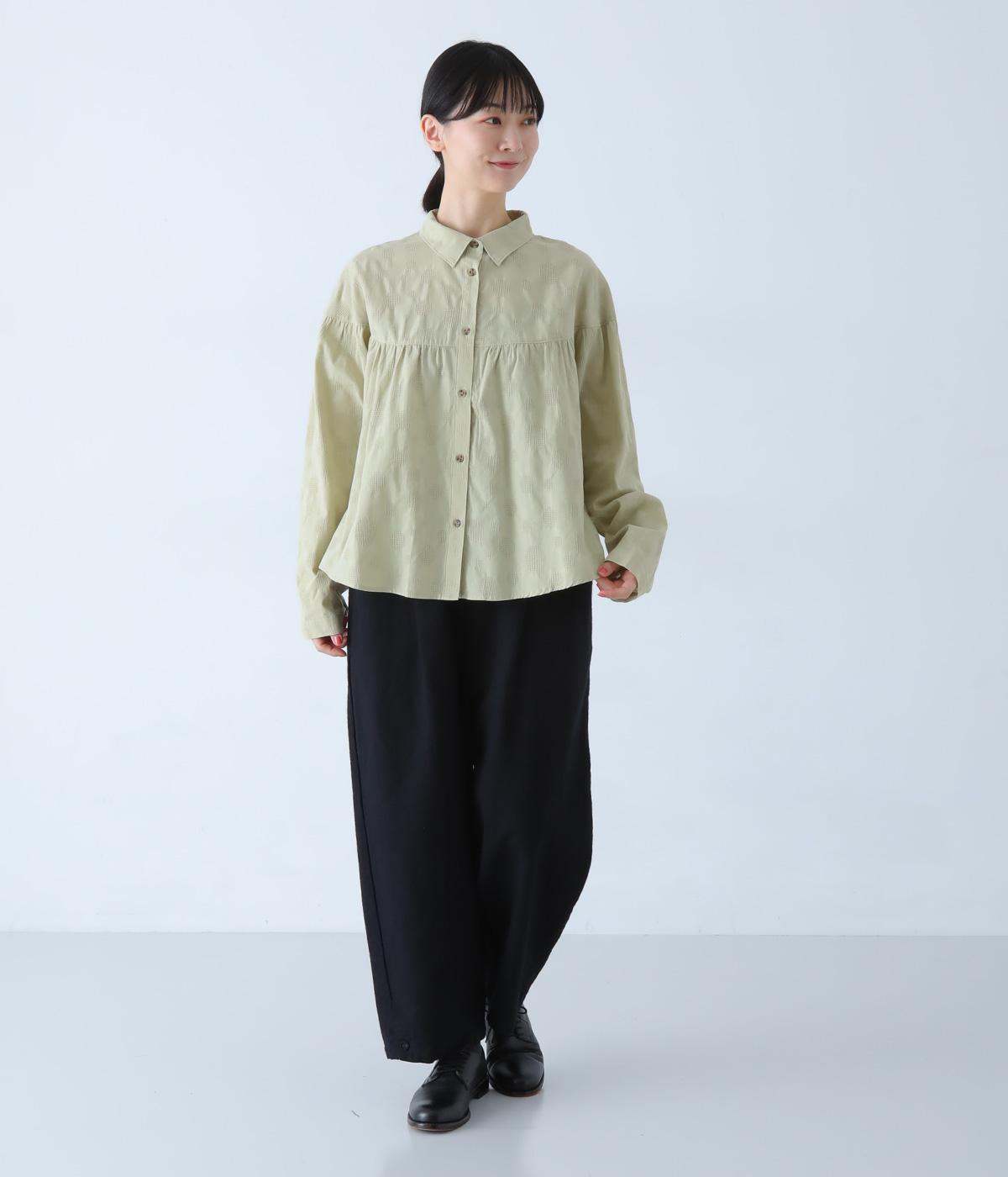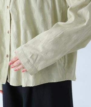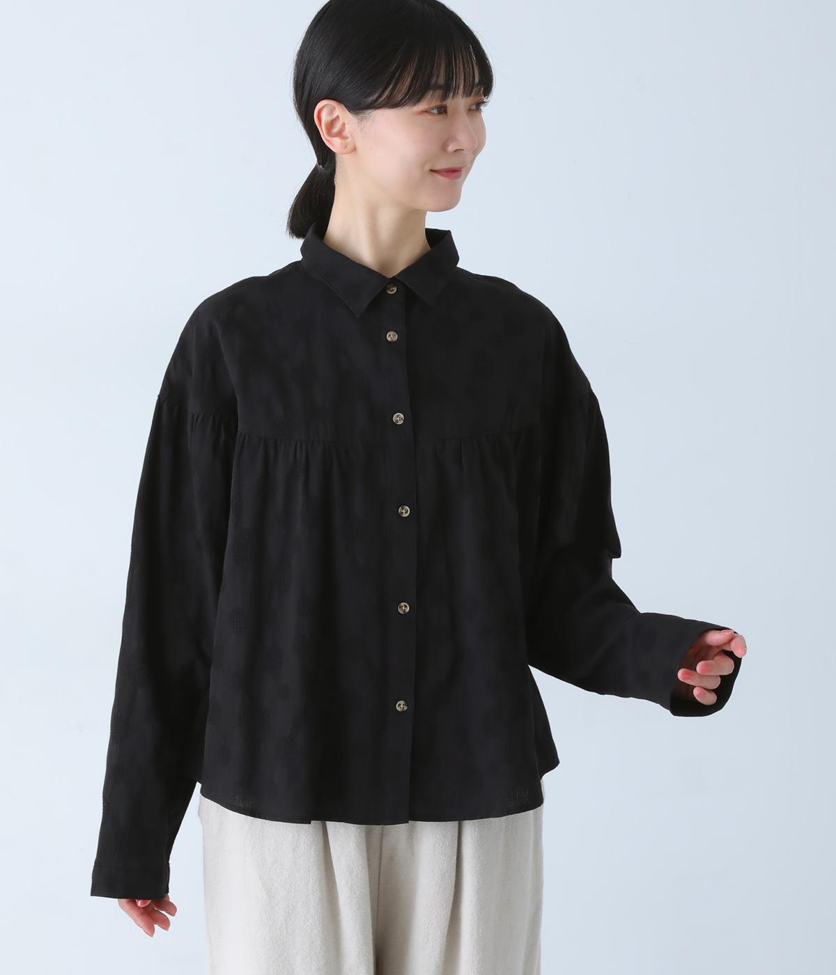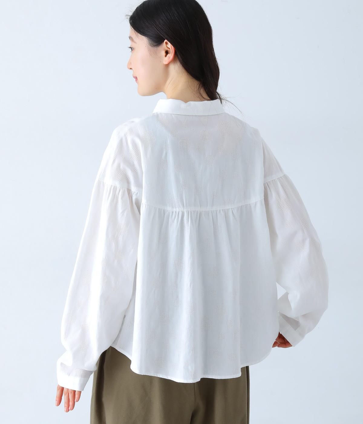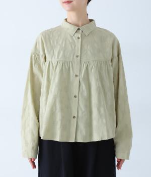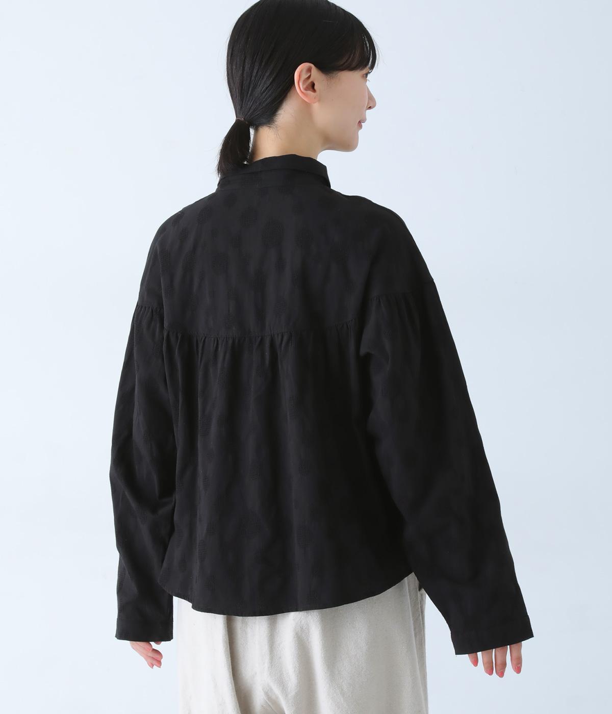 ランダムに配置したドット柄をジャカード織りで立体的に表現したシャツ。胸元と二の腕部分に入れたギャザーが柔らかな表情を添えてくれます。なだらかな前後差のある裾丈で、前裾はやや短めのバランスよいシルエットです。