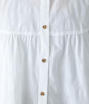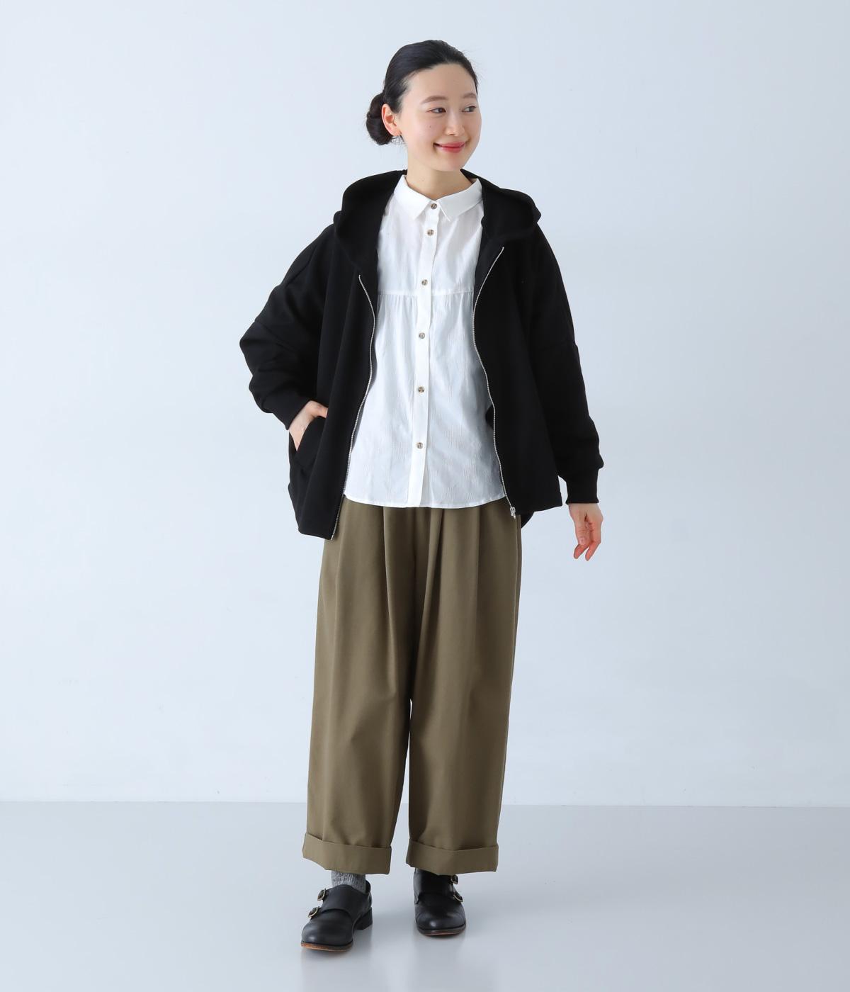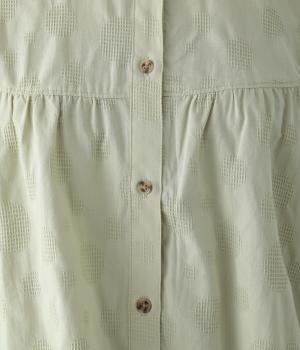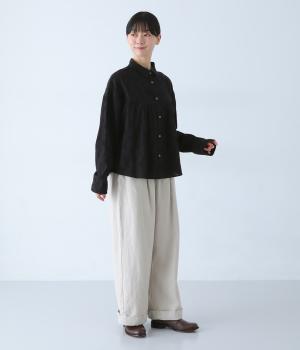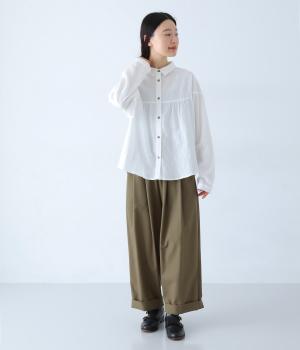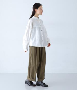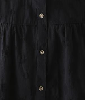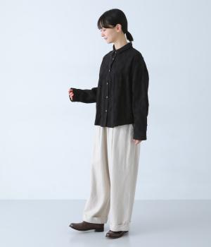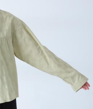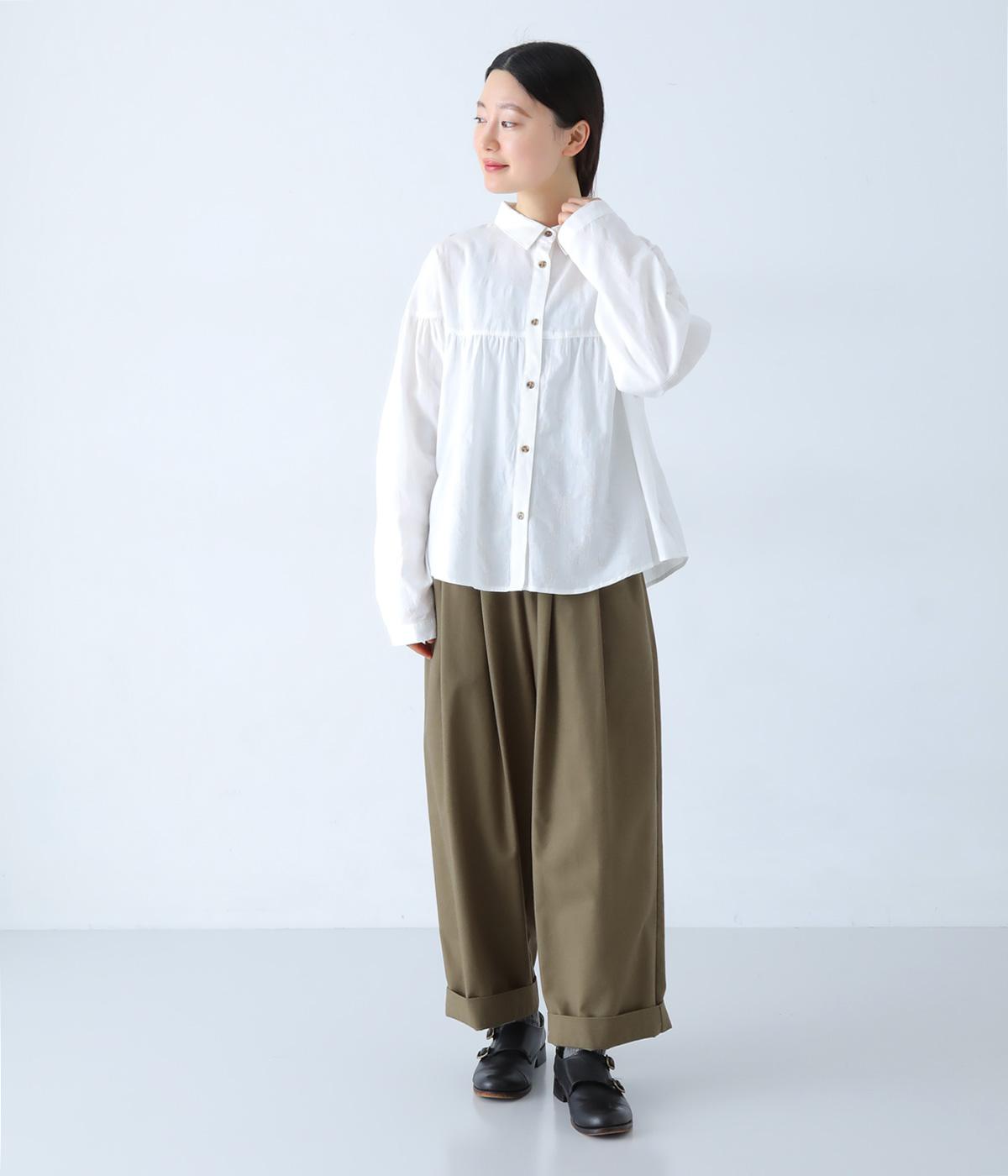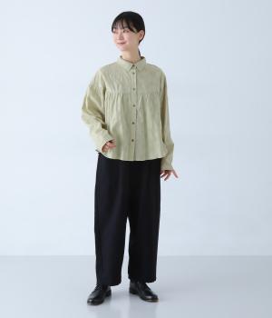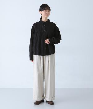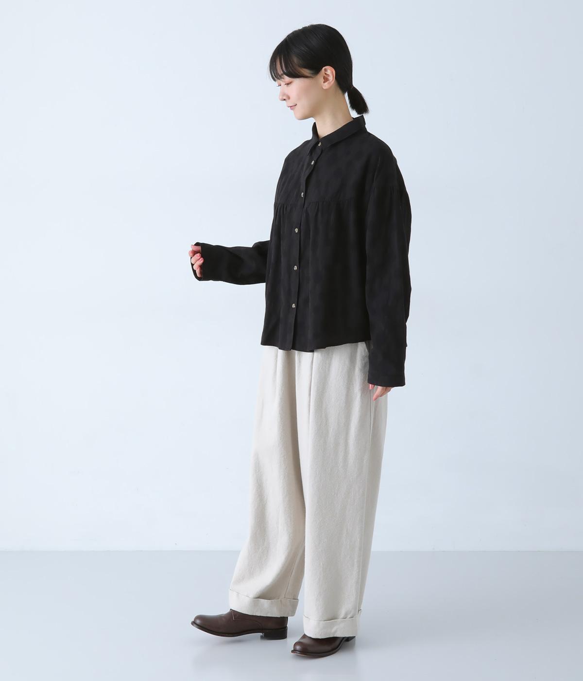 ランダムに配置したドット柄をジャカード織りで立体的に表現したシャツ。胸元と二の腕部分に入れたギャザーが柔らかな表情を添えてくれます。なだらかな前後差のある裾丈で、前裾はやや短めのバランスよいシルエットです。
