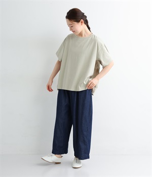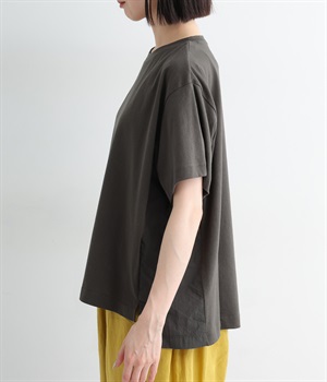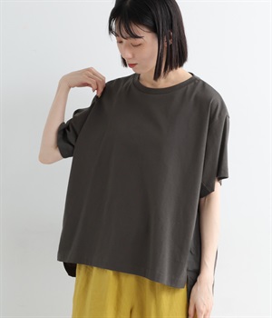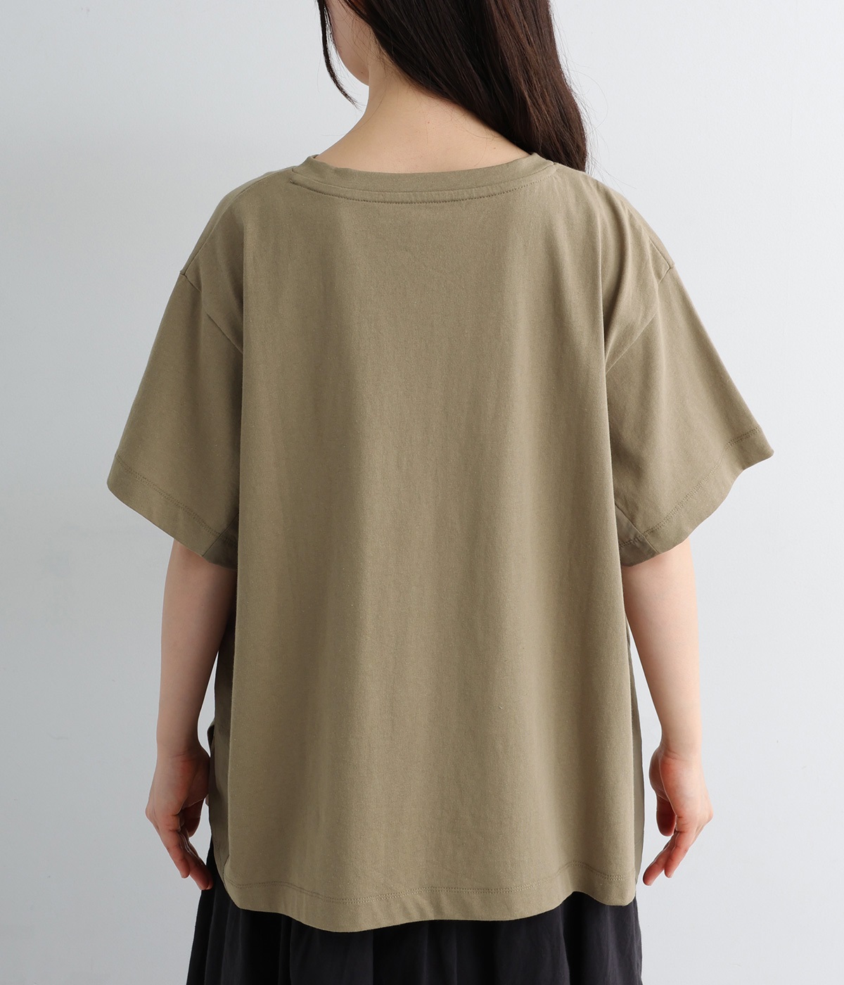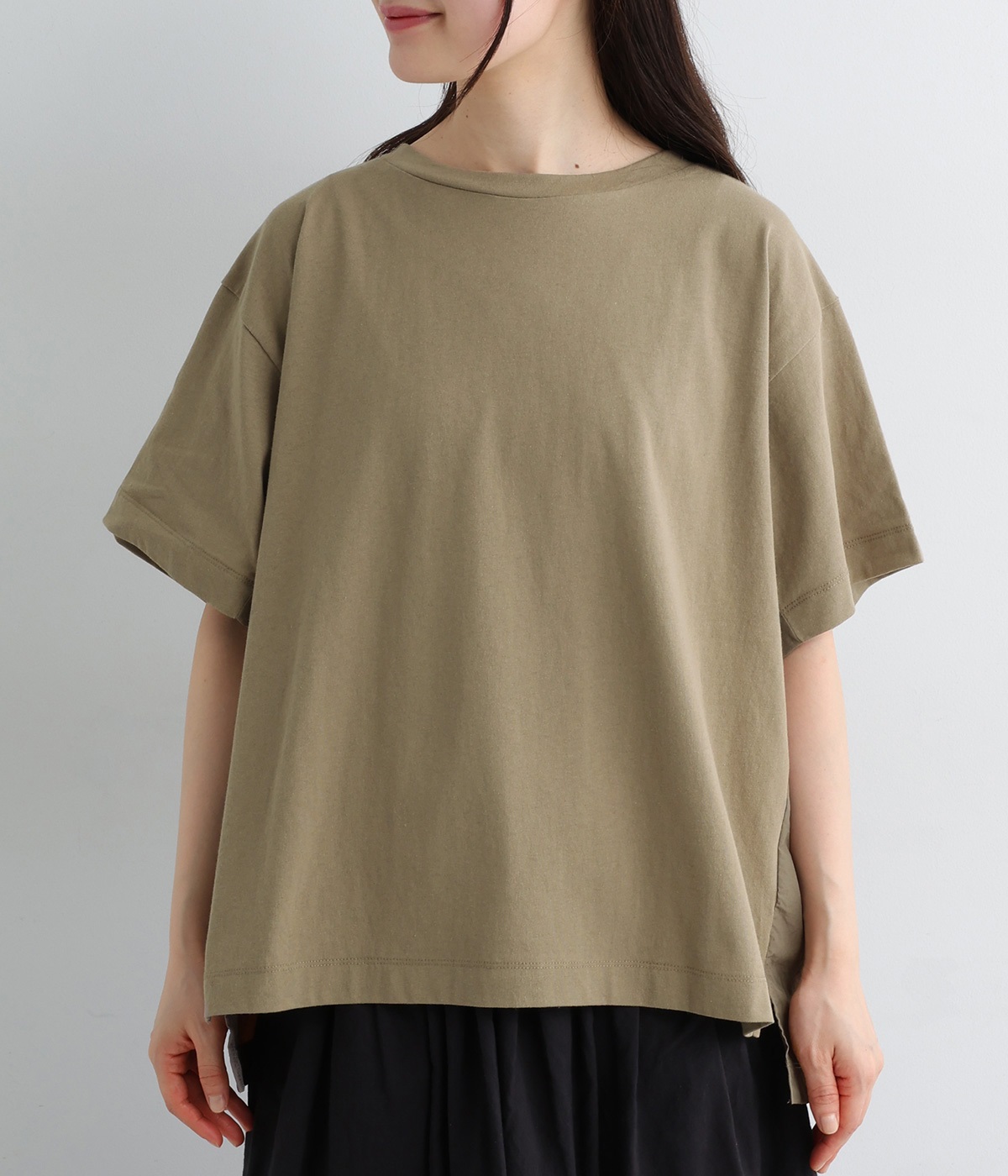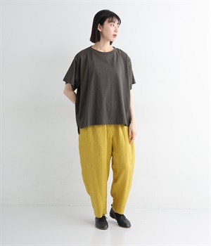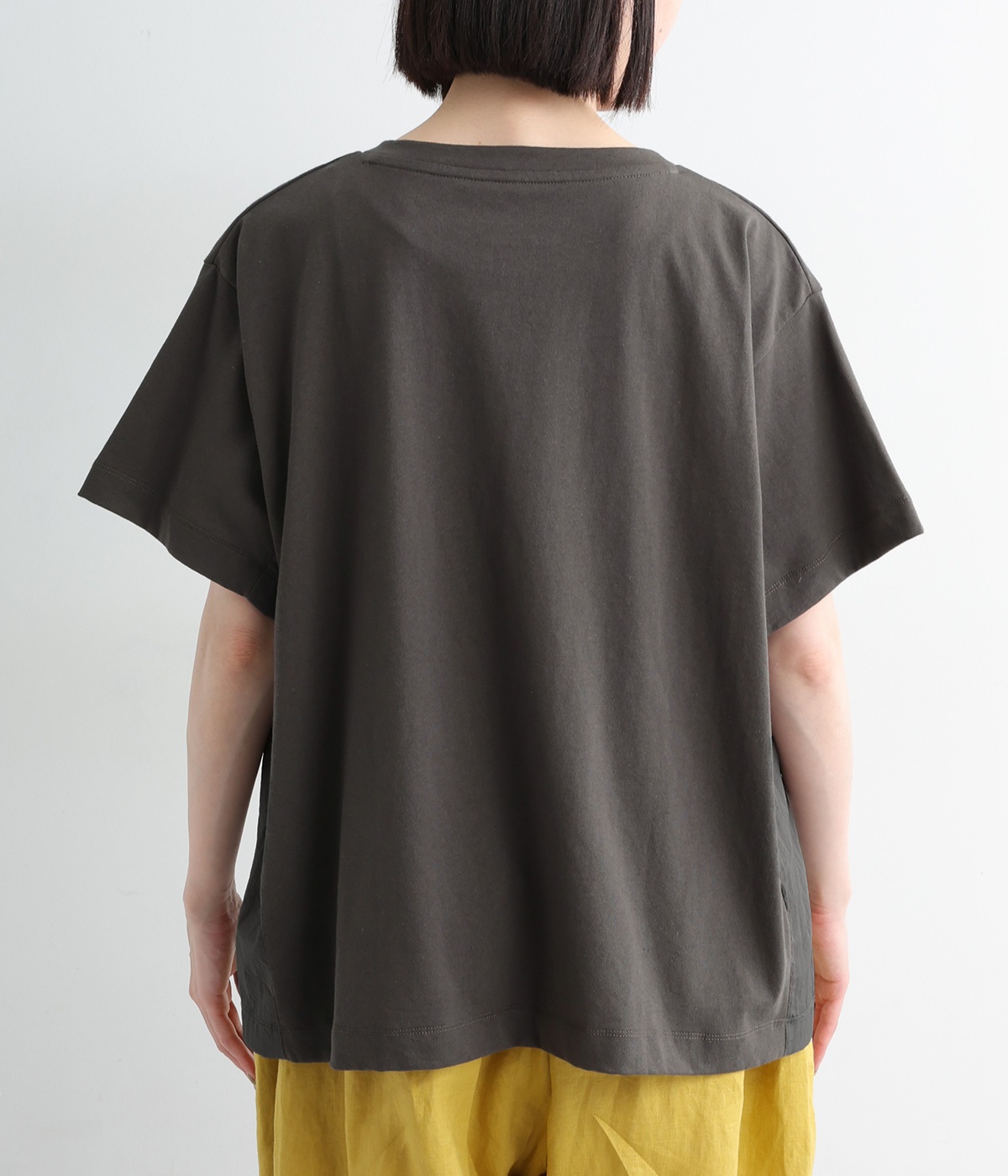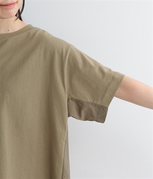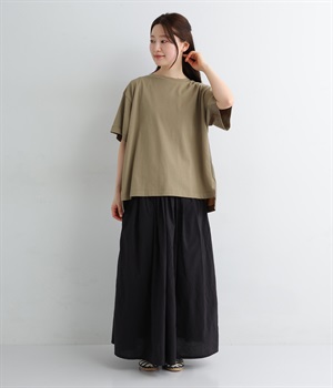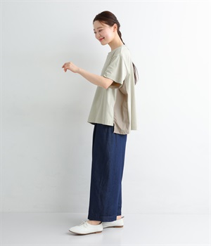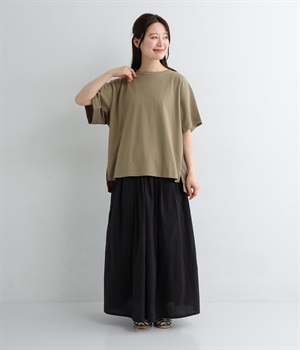 切り替えデザインをほどこしてベーシックになりすぎず、こなれ感のある印象に仕上がっています。体のラインを拾いにくいゆったりとしたサイズ感でラフな着こなしがたのしめます。同色系でまとまりがありスタイリングしやすい点も◎。