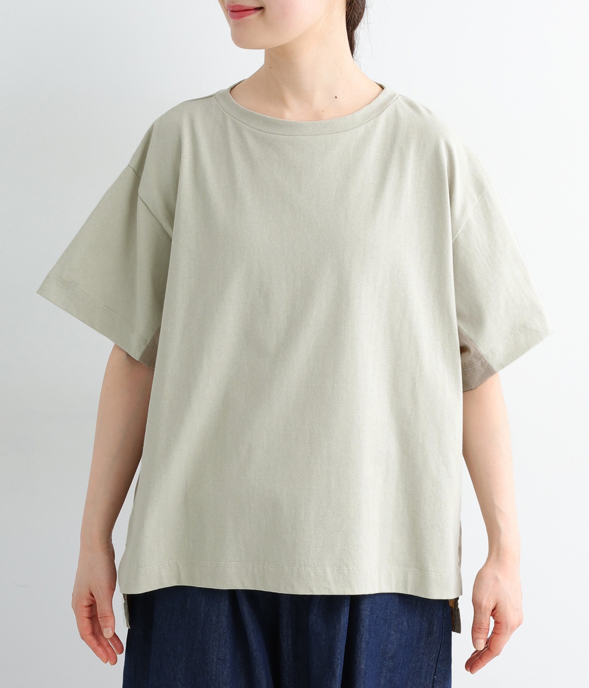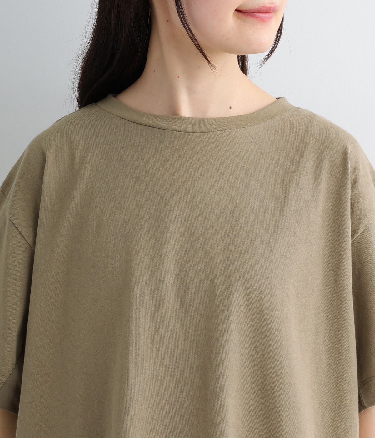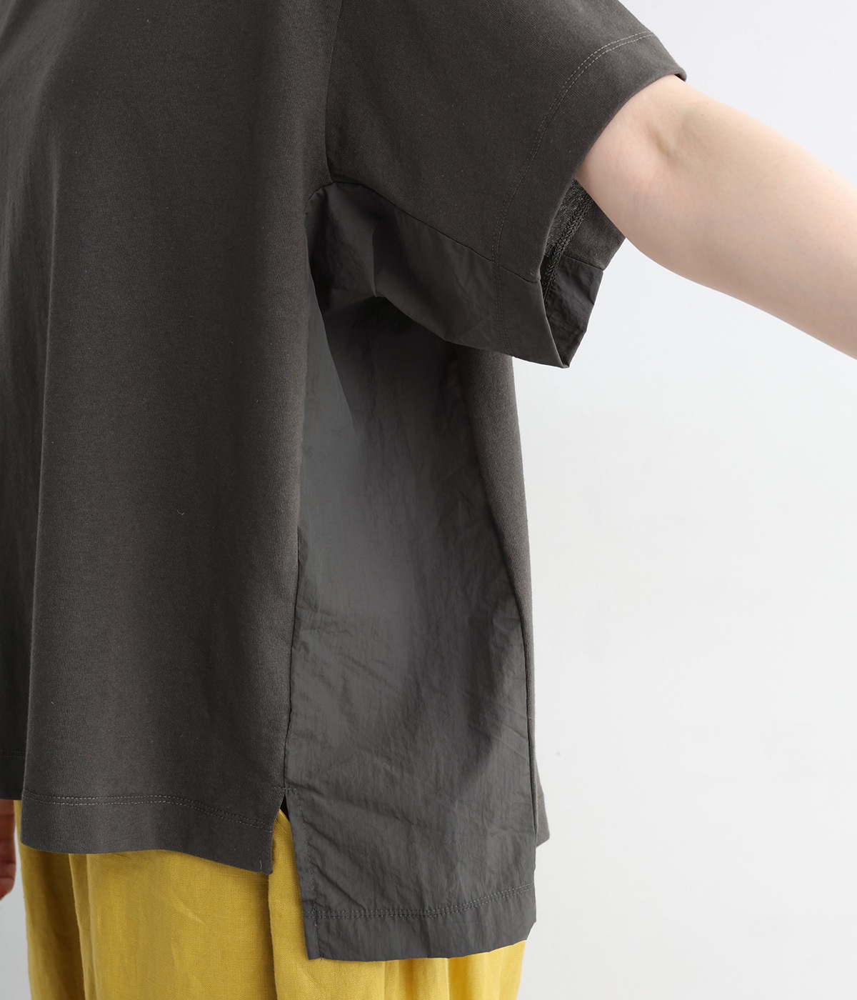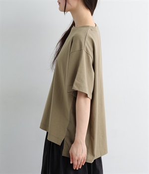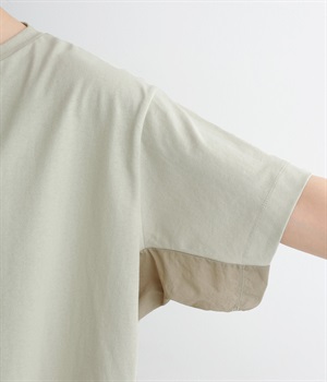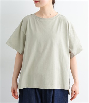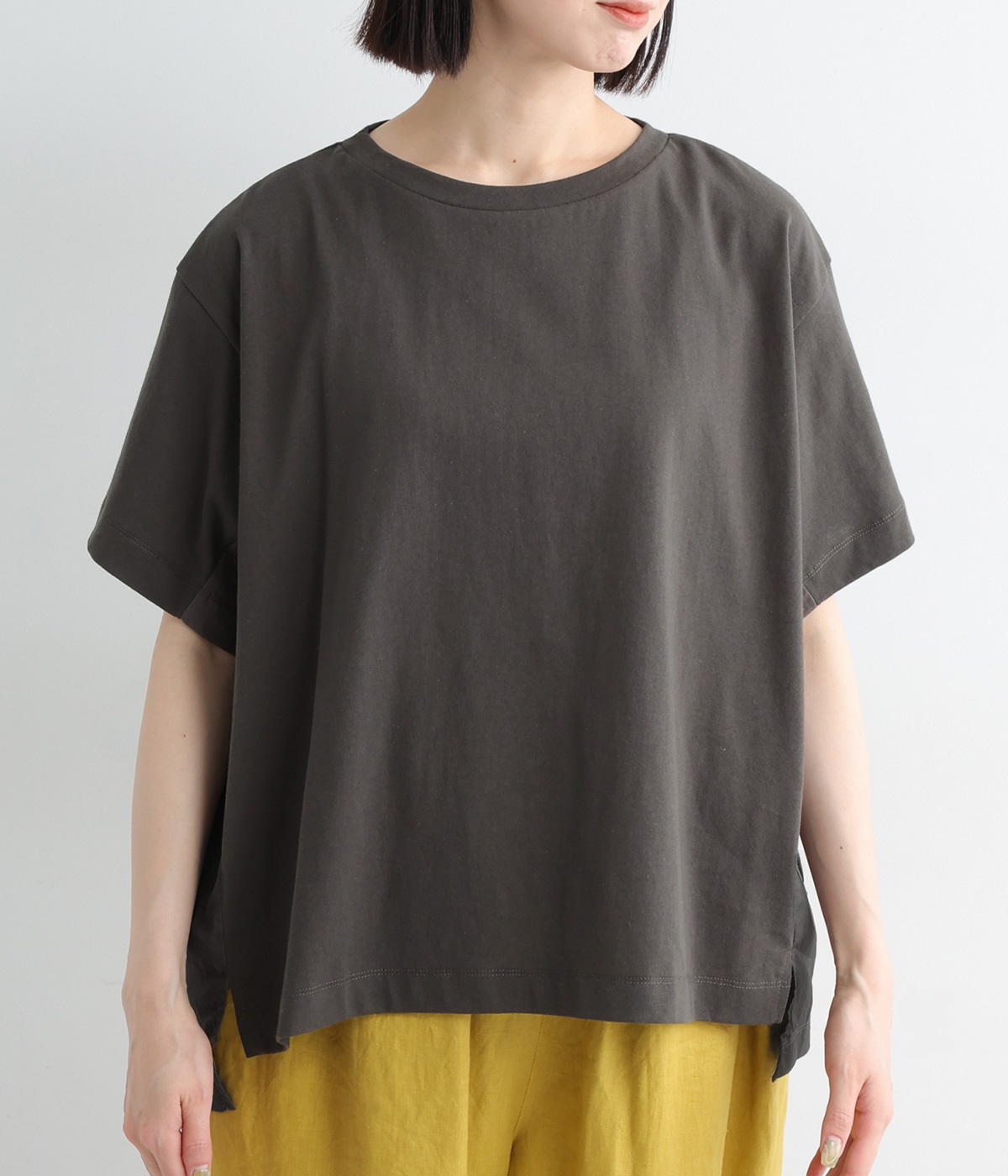 切り替えデザインをほどこしてベーシックになりすぎず、こなれ感のある印象に仕上がっています。体のラインを拾いにくいゆったりとしたサイズ感でラフな着こなしがたのしめます。同色系でまとまりがありスタイリングしやすい点も◎。