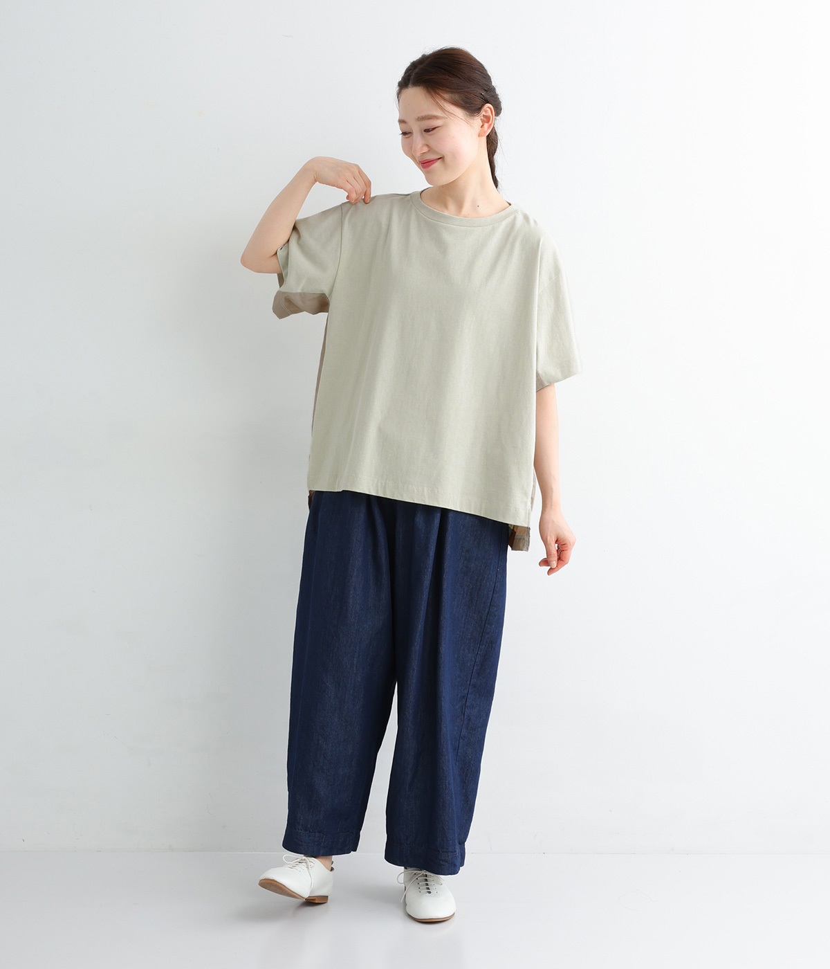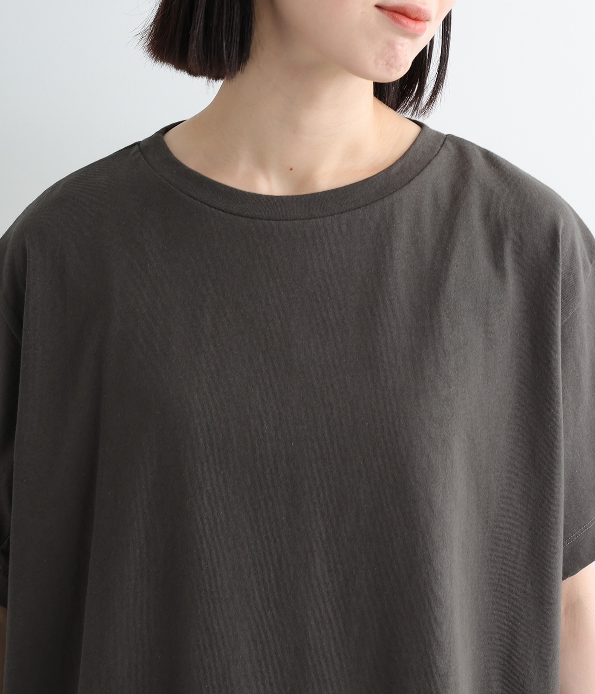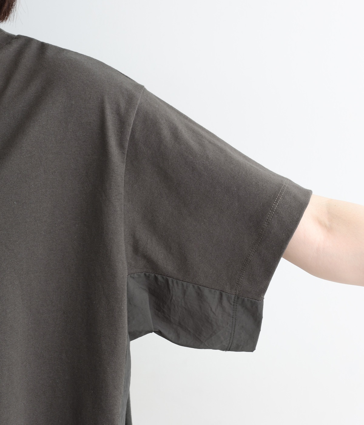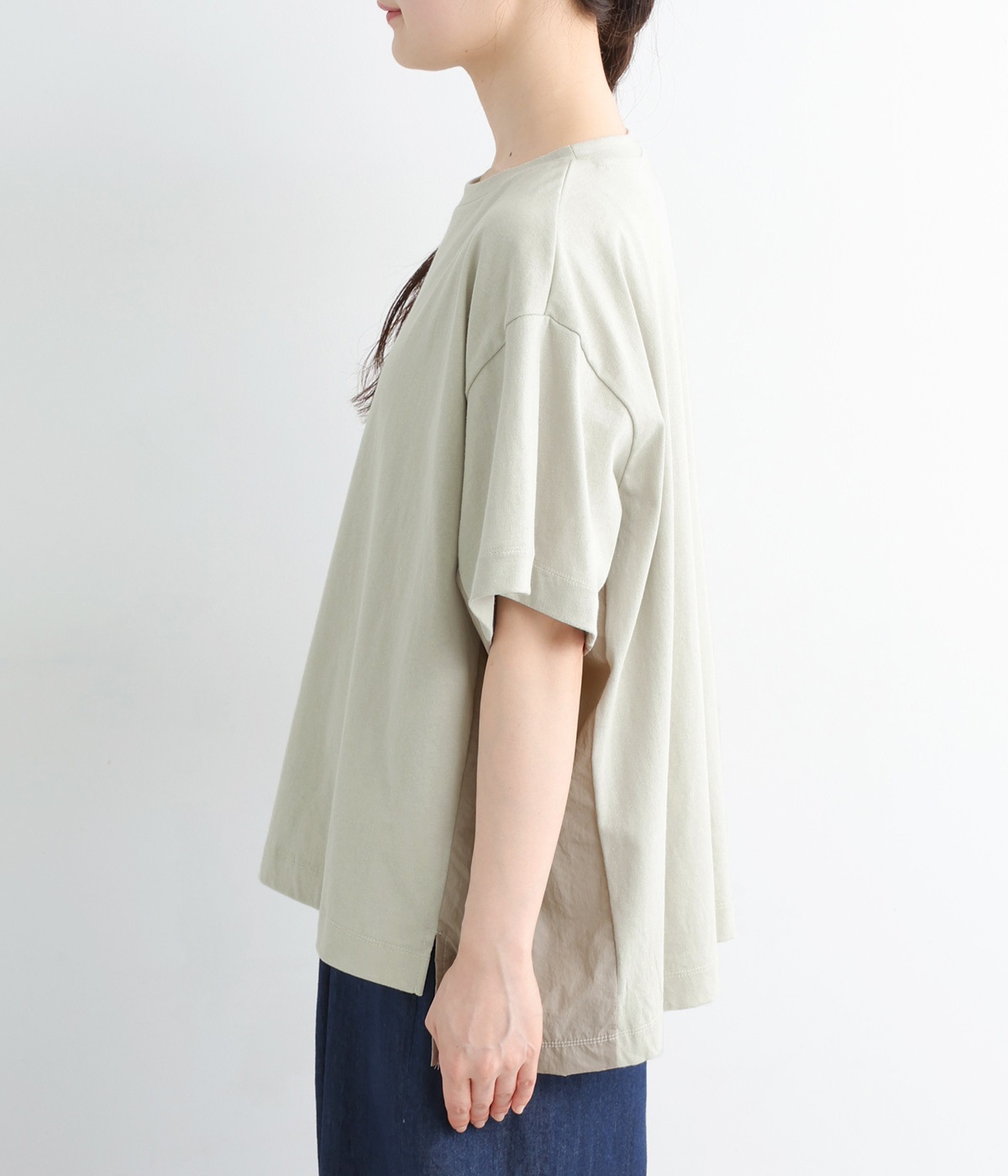 切り替えデザインをほどこしてベーシックになりすぎず、こなれ感のある印象に仕上がっています。体のラインを拾いにくいゆったりとしたサイズ感でラフな着こなしがたのしめます。同色系でまとまりがありスタイリングしやすい点も◎。