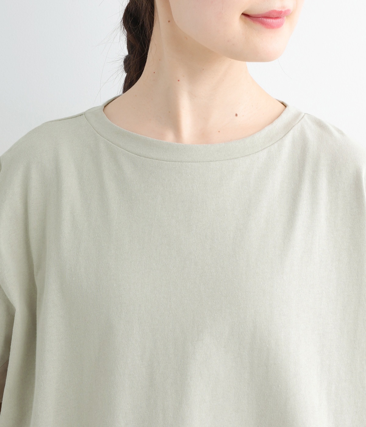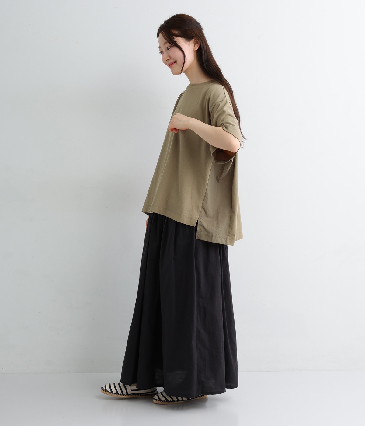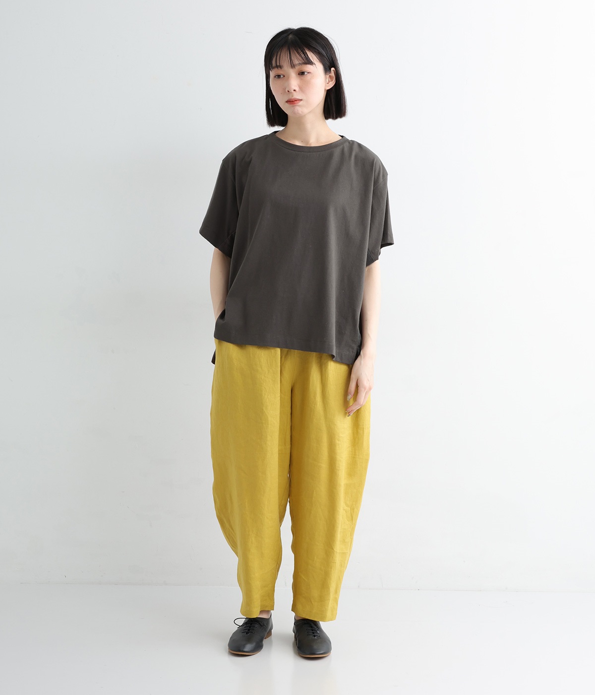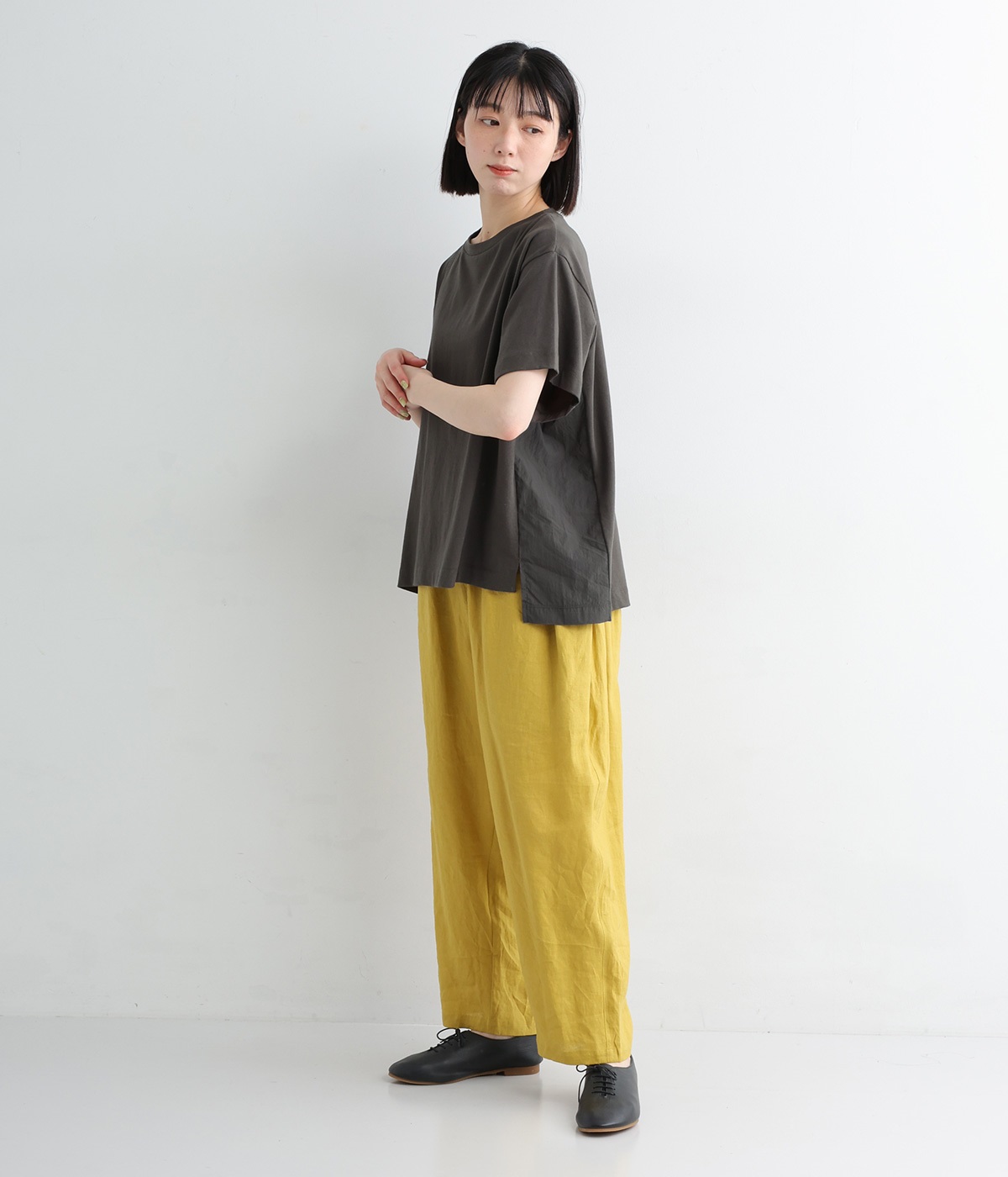 切り替えデザインをほどこしてベーシックになりすぎず、こなれ感のある印象に仕上がっています。体のラインを拾いにくいゆったりとしたサイズ感でラフな着こなしがたのしめます。同色系でまとまりがありスタイリングしやすい点も◎。