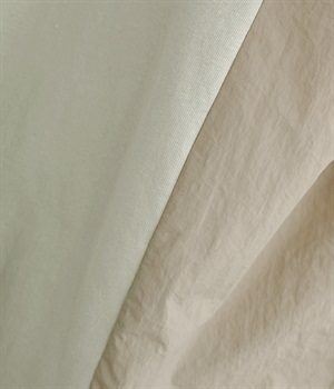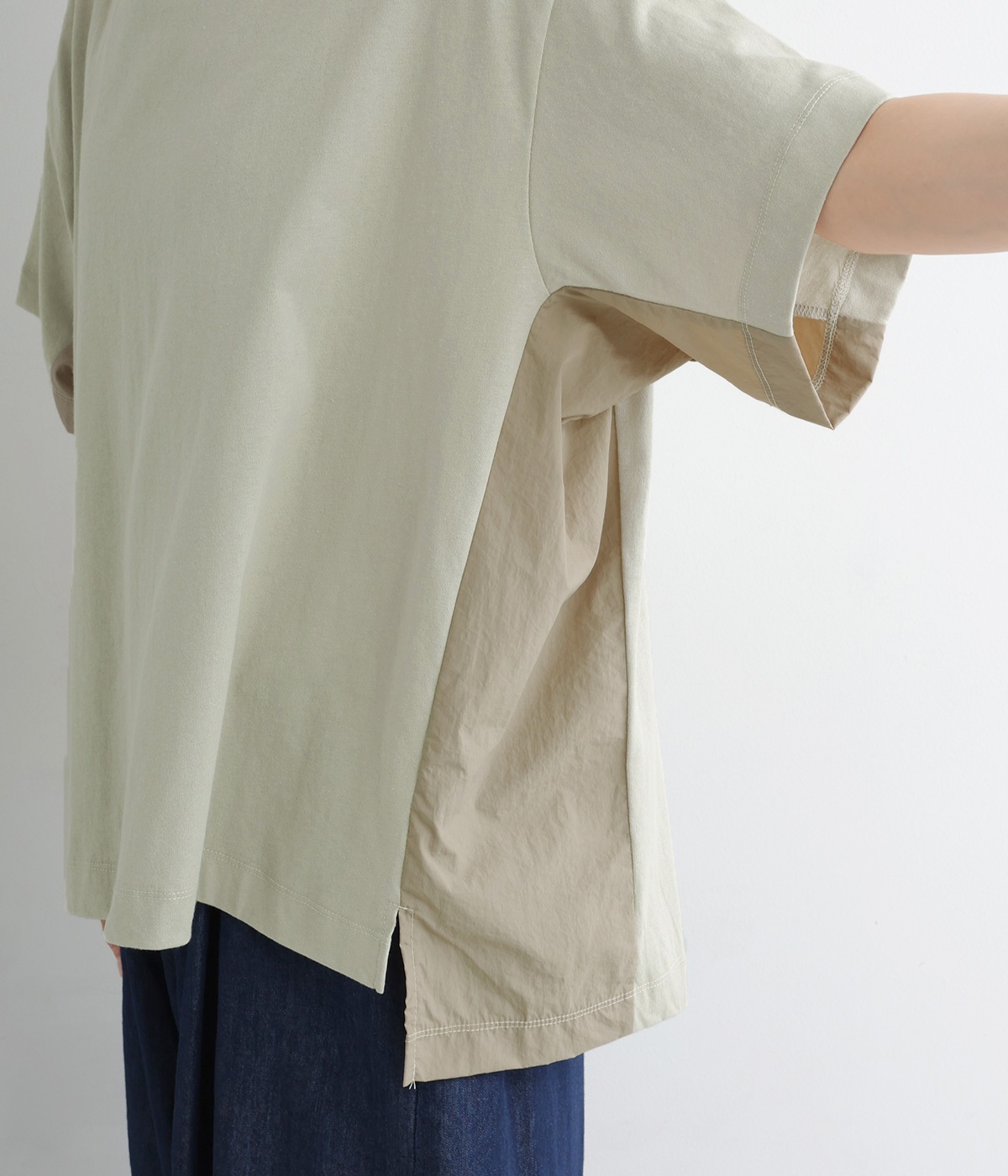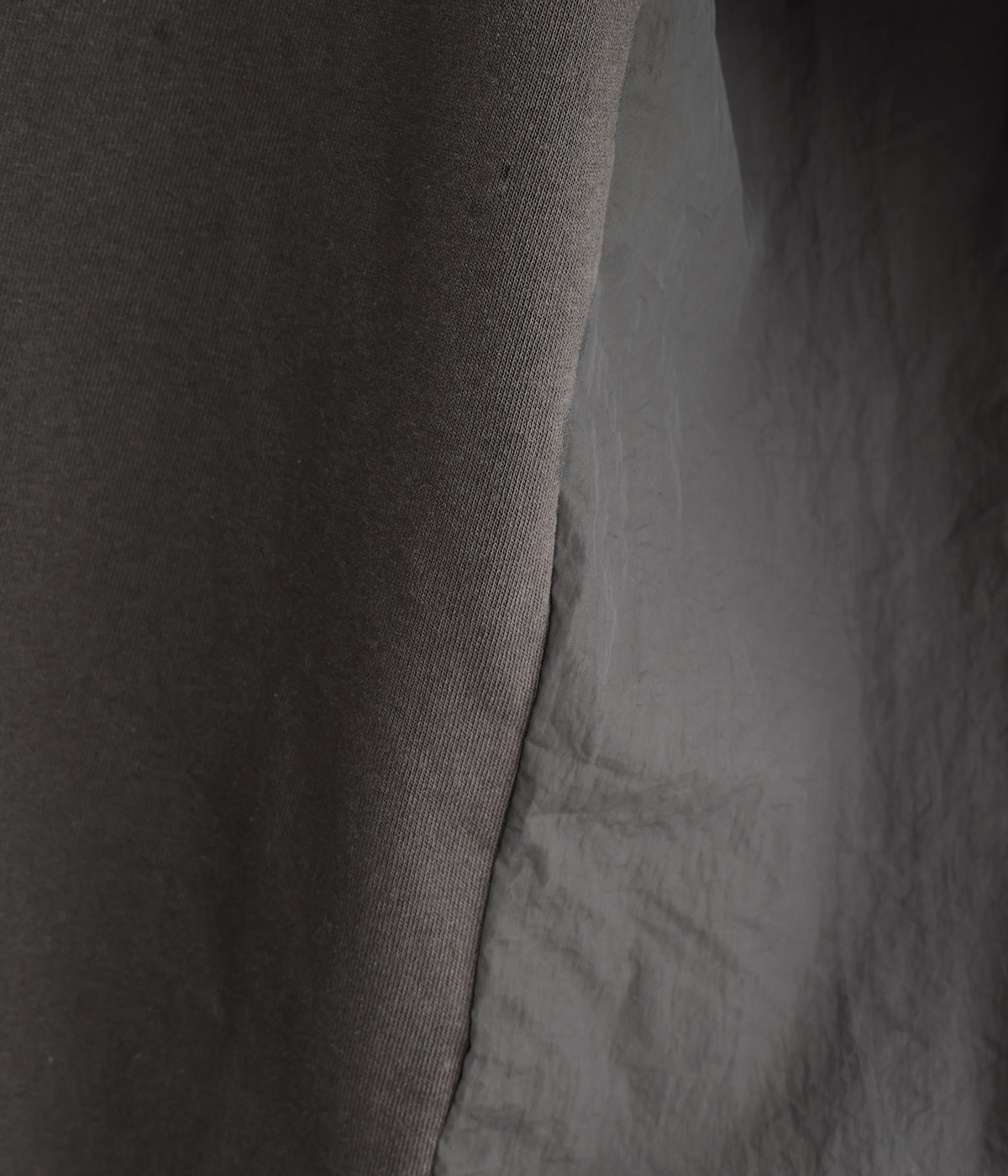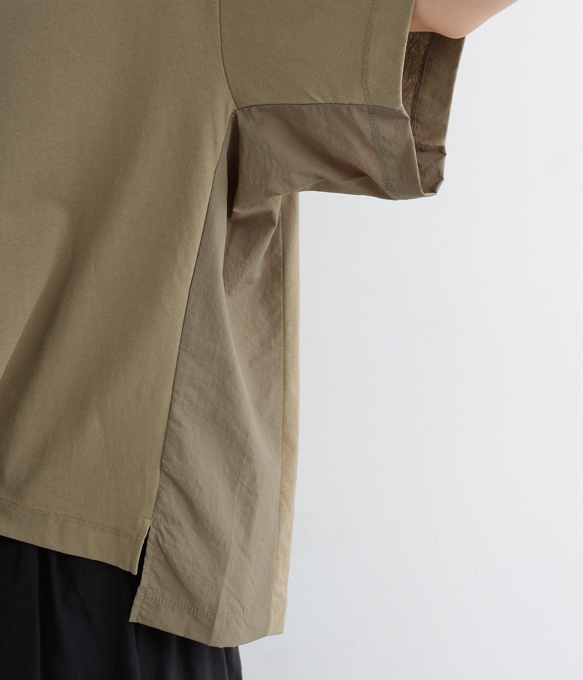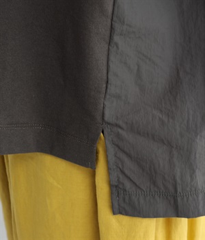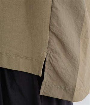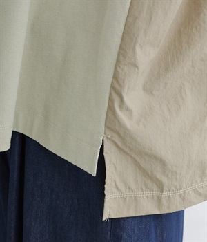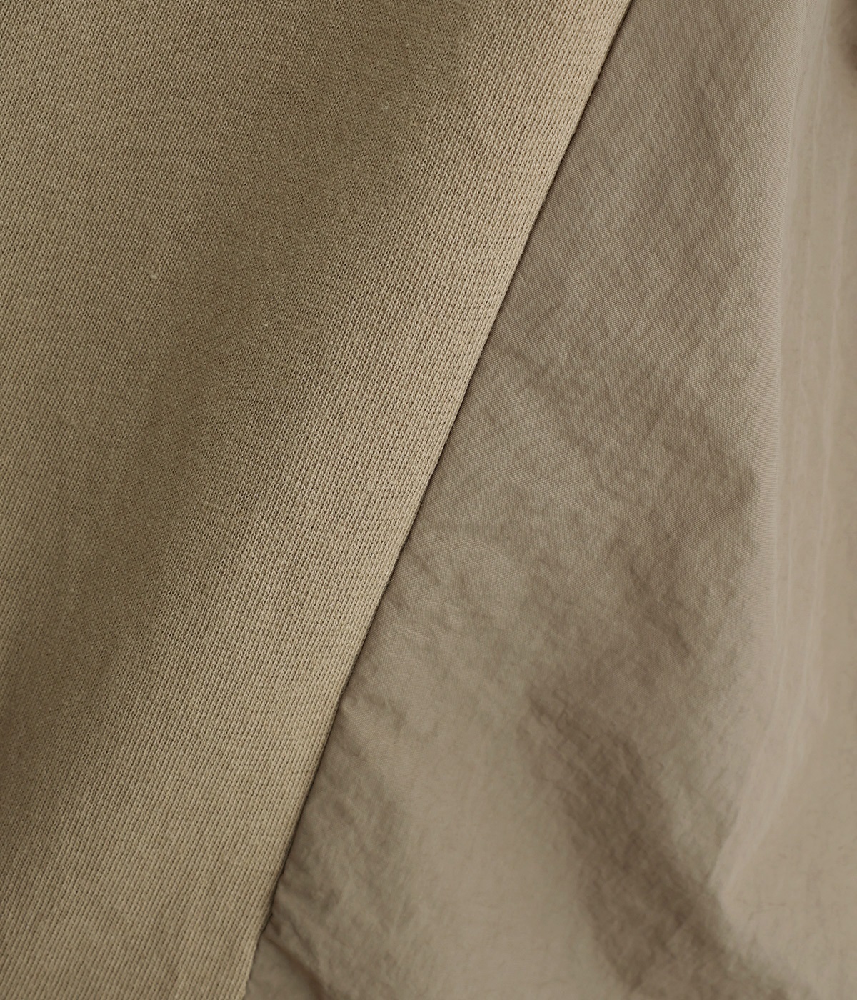 ユーズド感のある風合いのいいやわらかなコットン生地を使用しています。サイド部分はシャカシャカとしたタフなナイロンの布帛に切り替えて変化をつけました。