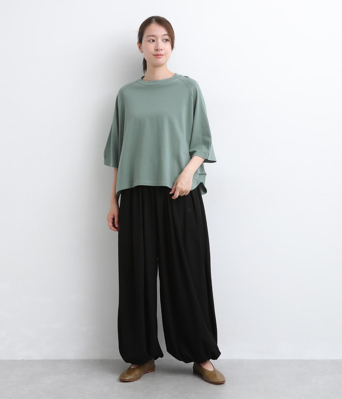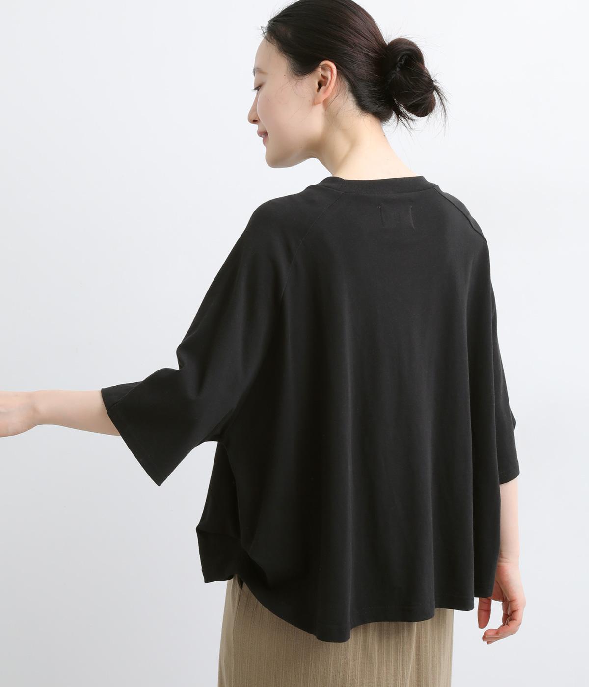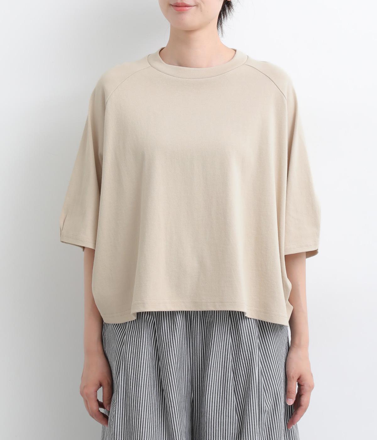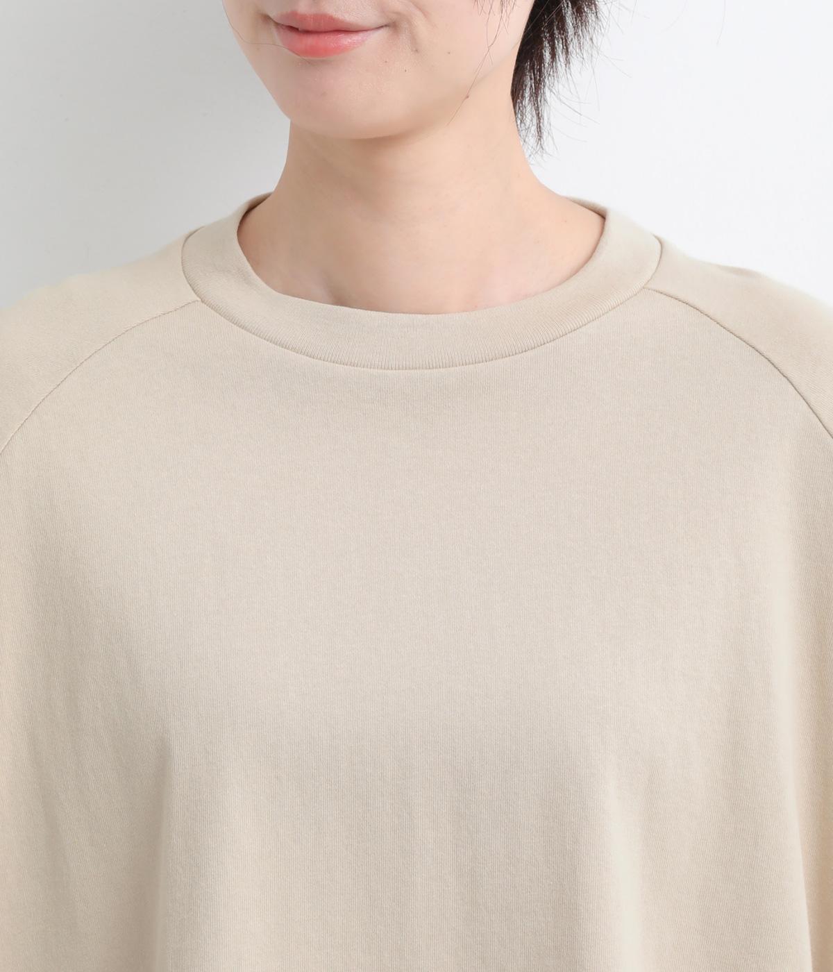太リブにラグラン袖のメンズライクな要素を、丸みのあるシルエットで中和したMIXテイストな一枚。ワイドな身幅で風通りがよく、サイドタックが立体的なニュアンスを生みます。6分袖でロングシーズン着まわせるのも◎。