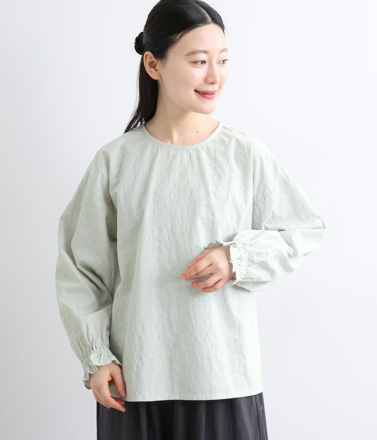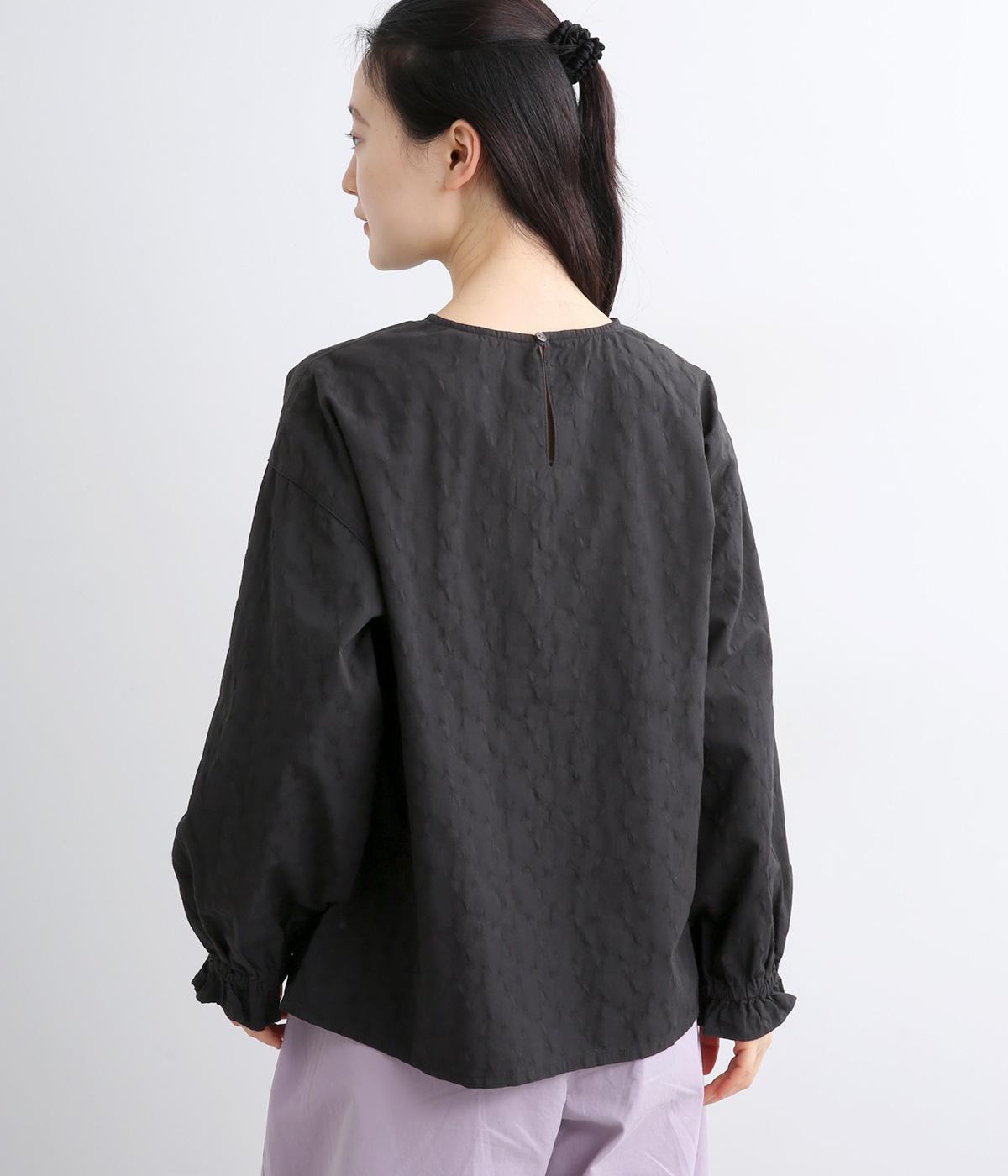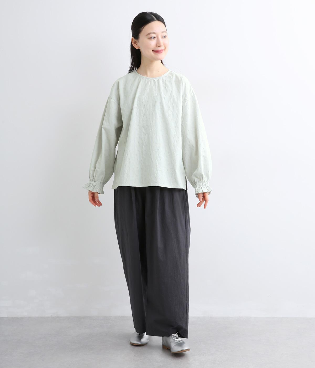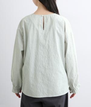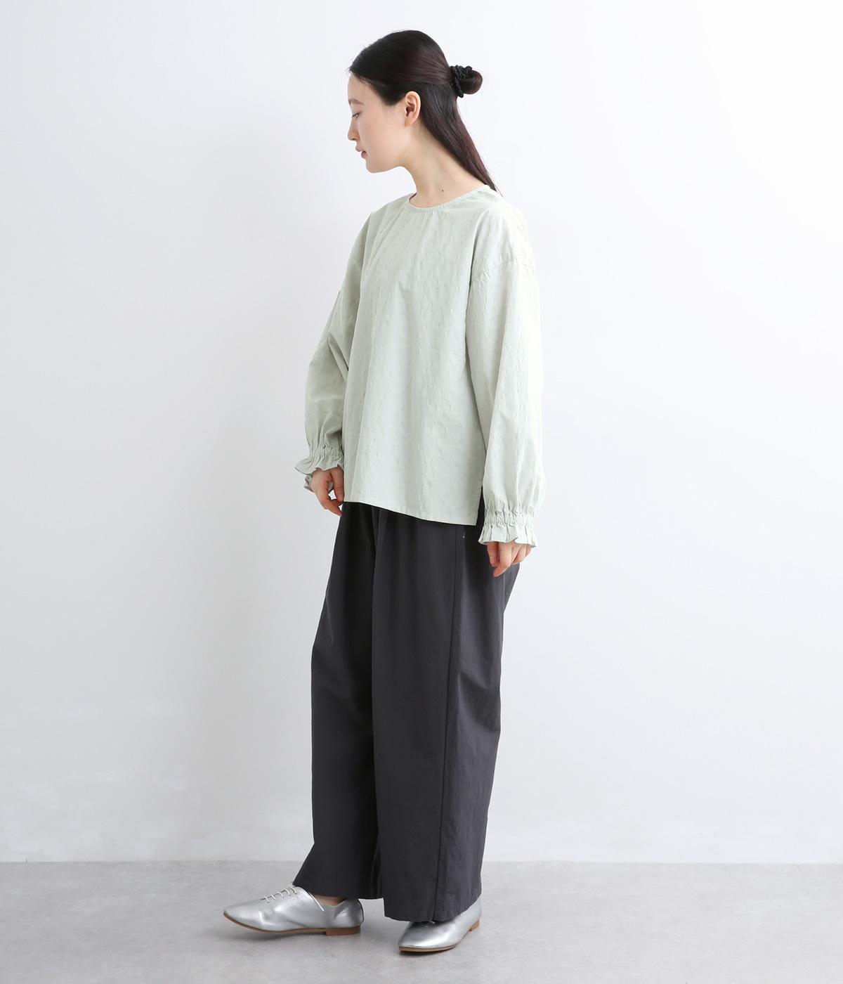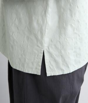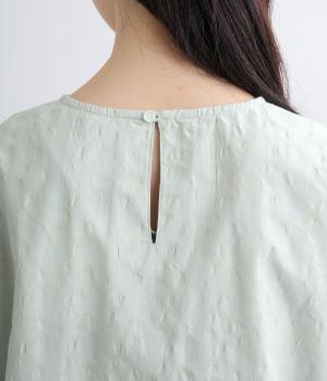 無地感覚で着こなしやすく、さり気なく表情をつけてくれるドットジャカードが印象のいい一枚。適度にゆとりを持たせたボックス型は、サイドスリット入りでボトム合わせもすっきり見え。袖口フリルが可愛らしく、ゴム入りでたくし上げも◎。