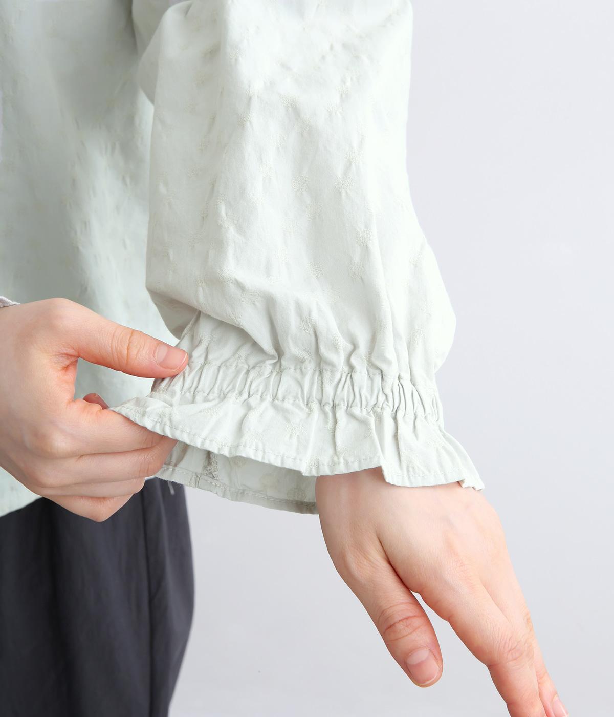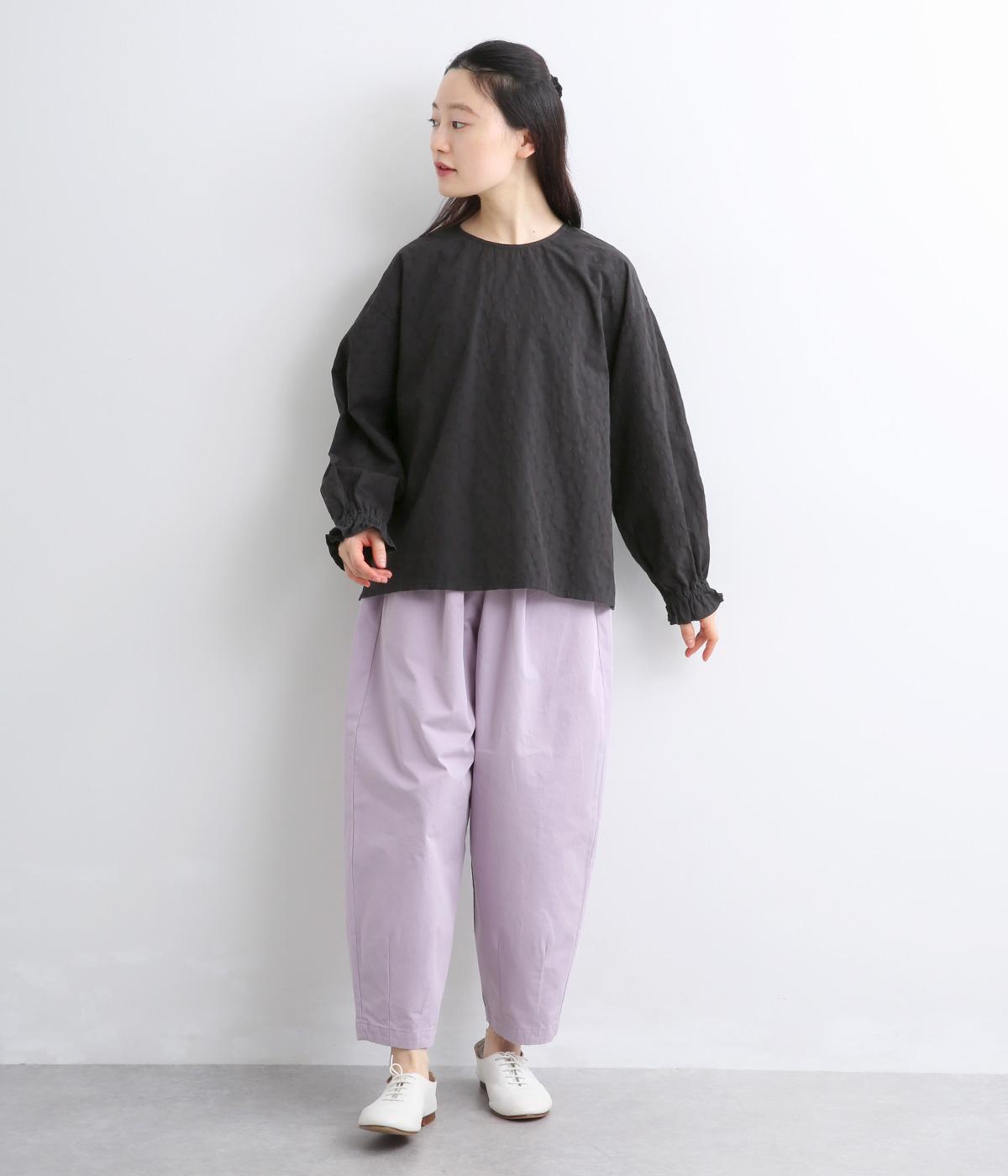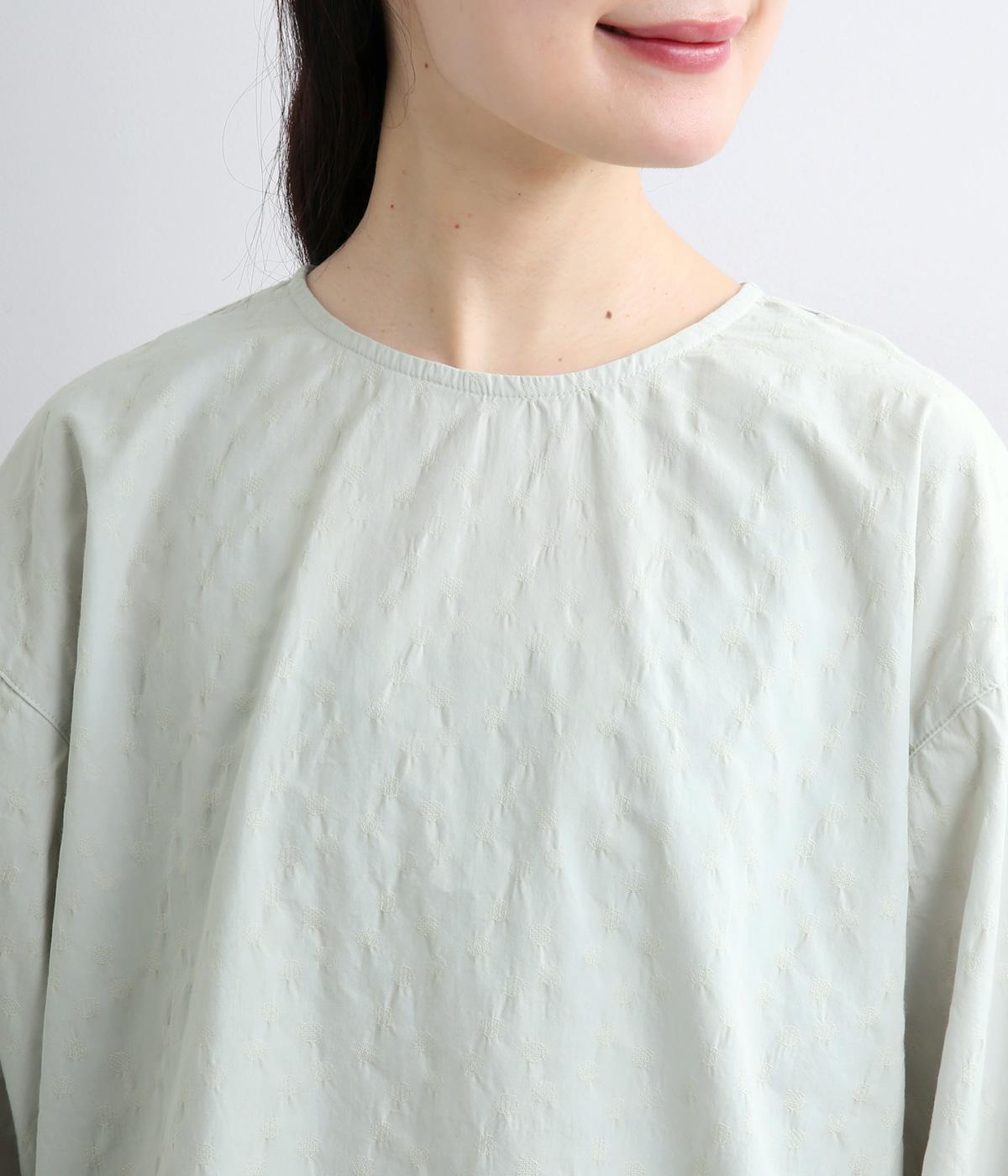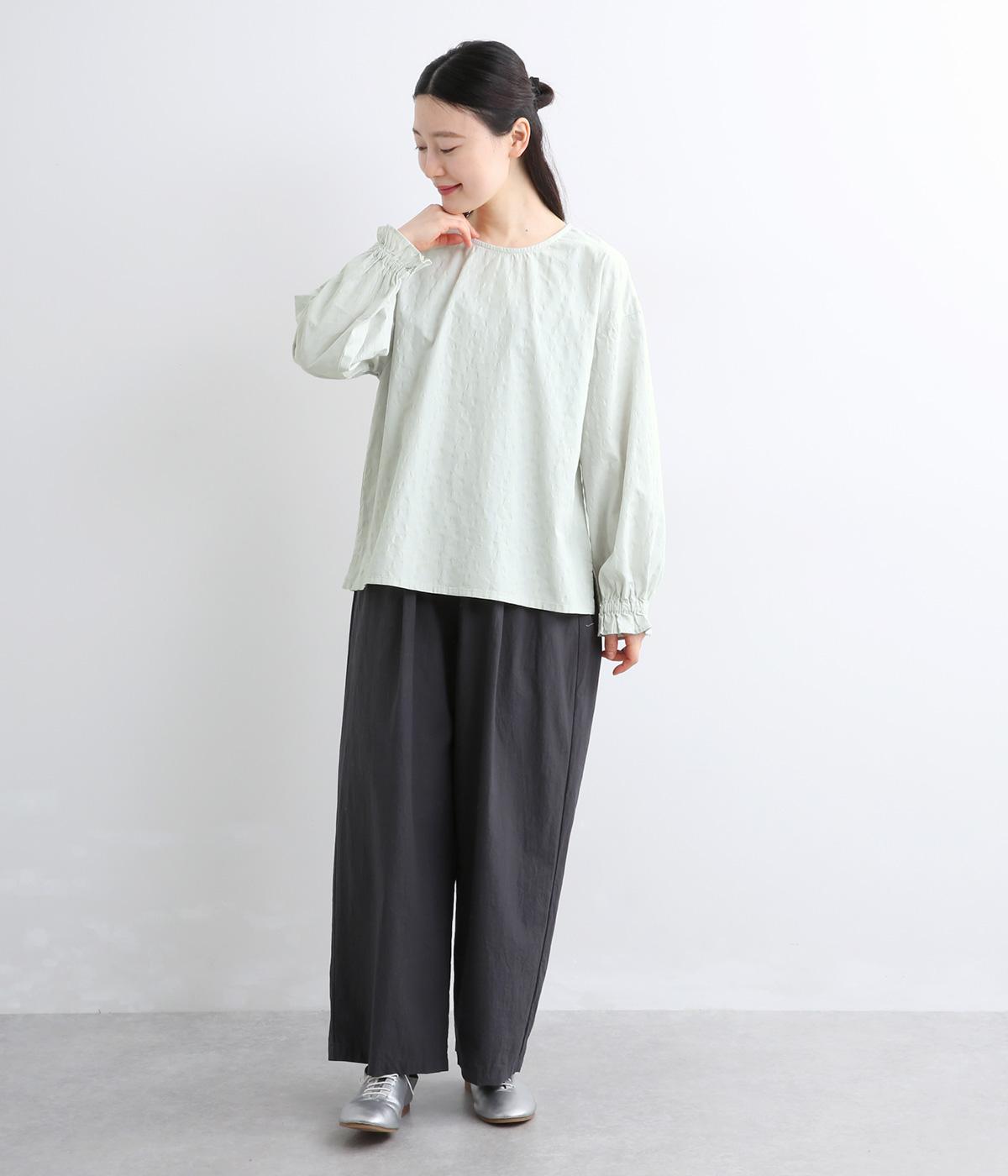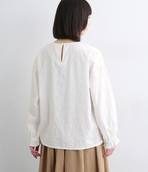 無地感覚で着こなしやすく、さり気なく表情をつけてくれるドットジャカードが印象のいい一枚。適度にゆとりを持たせたボックス型は、サイドスリット入りでボトム合わせもすっきり見え。袖口フリルが可愛らしく、ゴム入りでたくし上げも◎。
