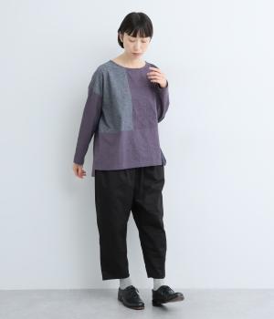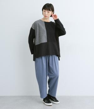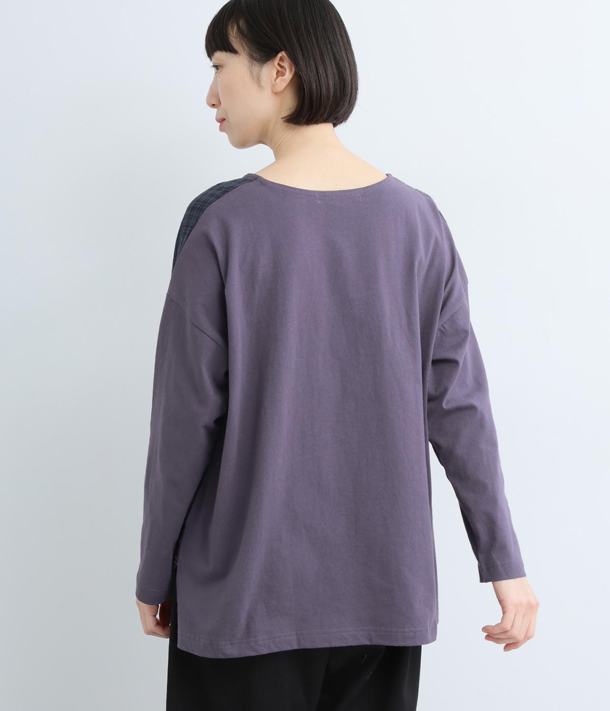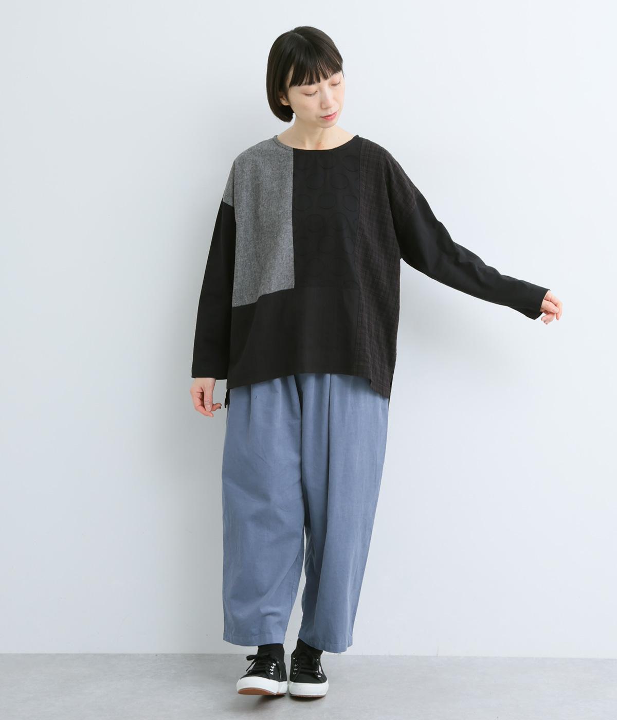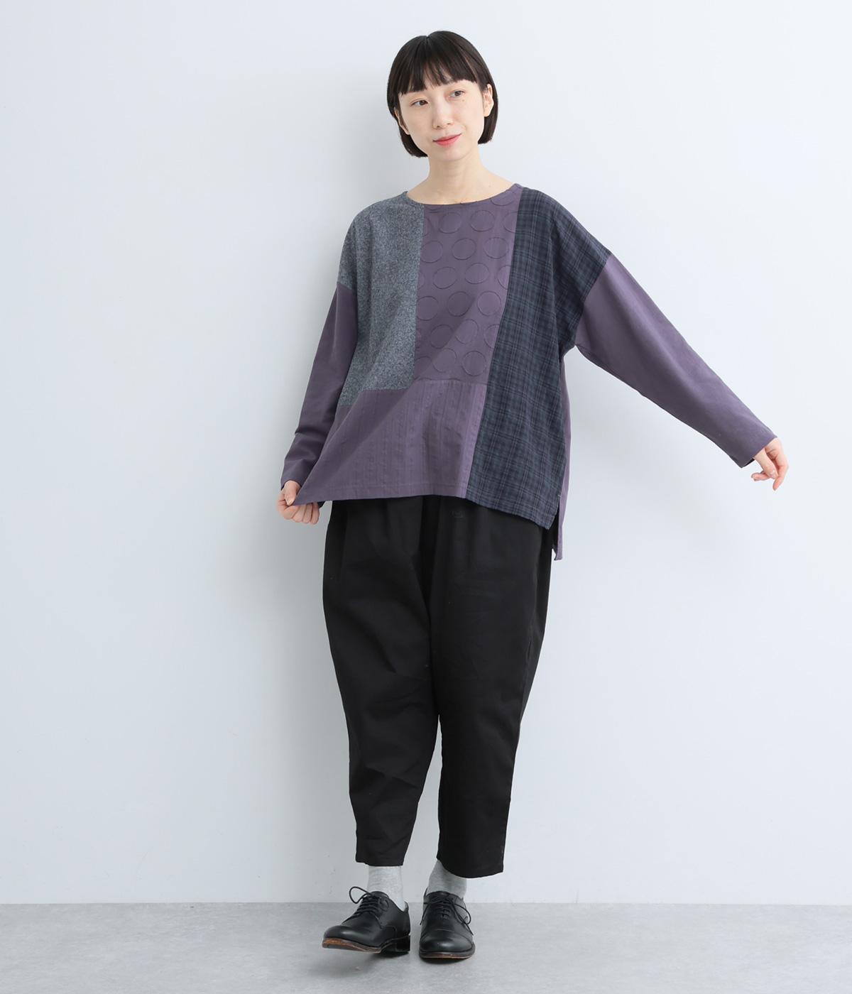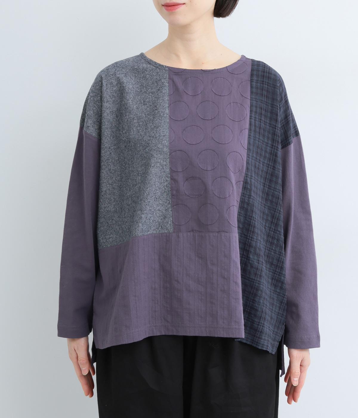 前身頃の様々な柄の布帛生地を切り替えたパッチワーク風、袖や後身頃はやわらかなカットソー素材で、デザイン性と着心地を両立。ナチュラルな風合いのコットンで、着るほど体になじみます。