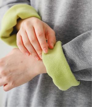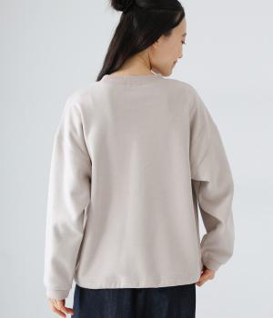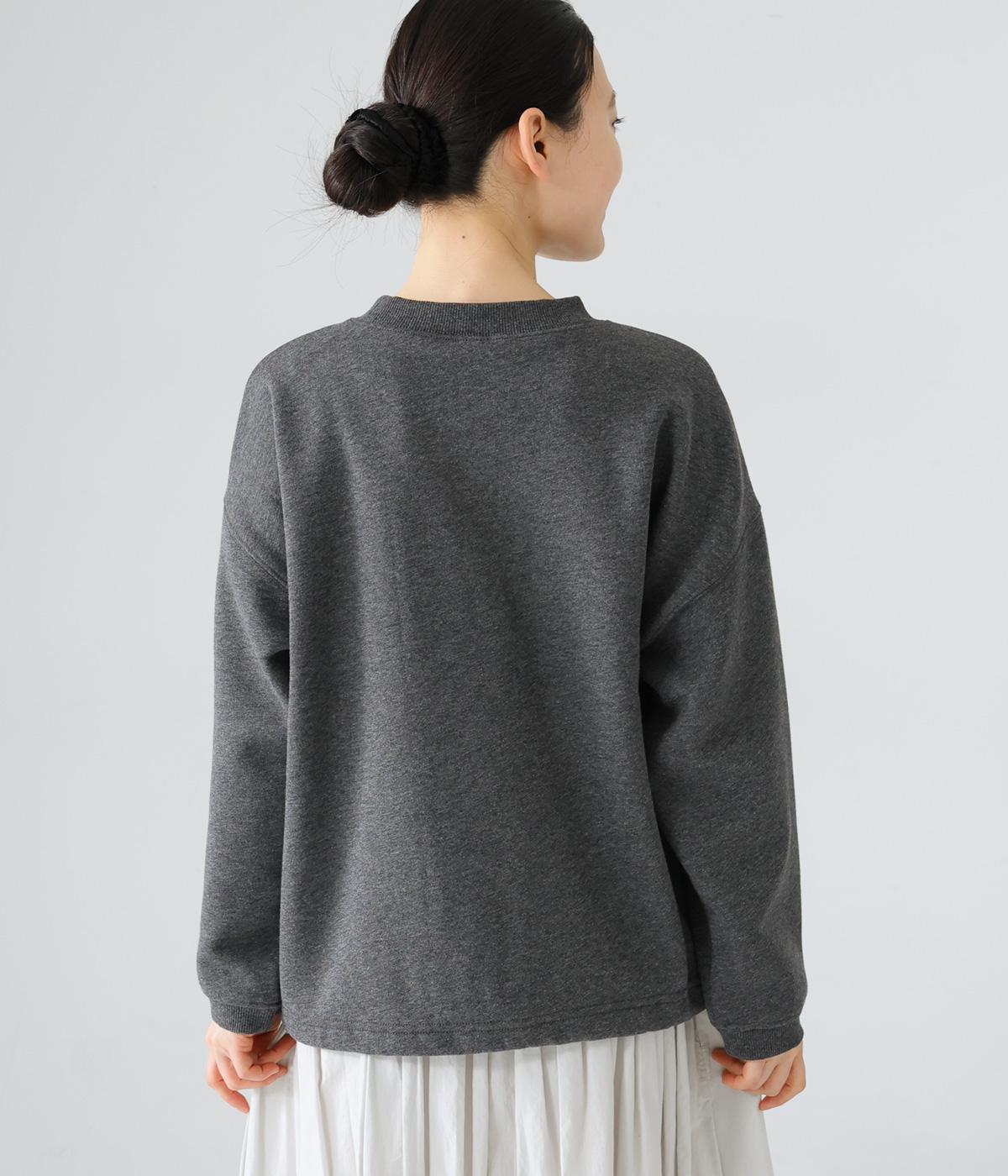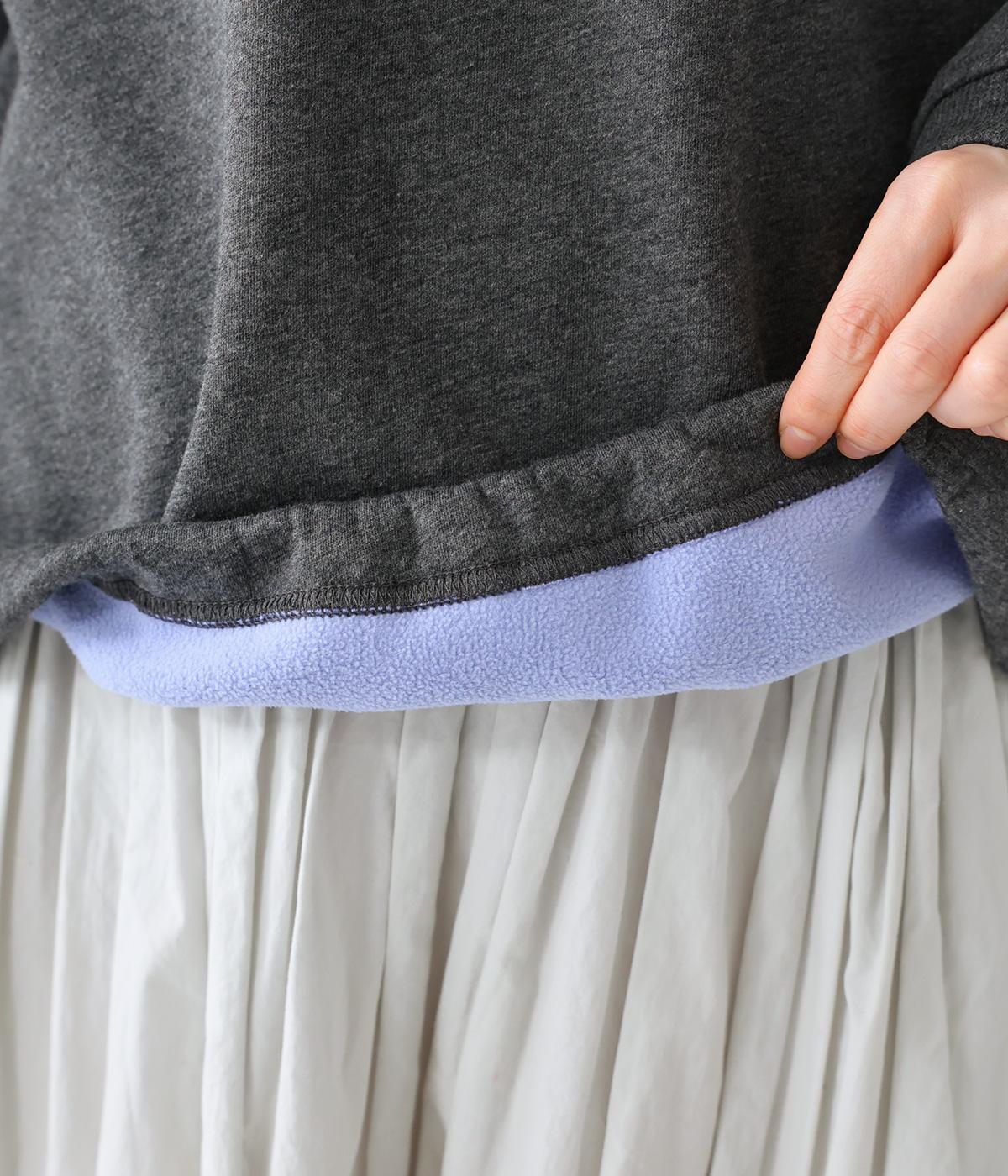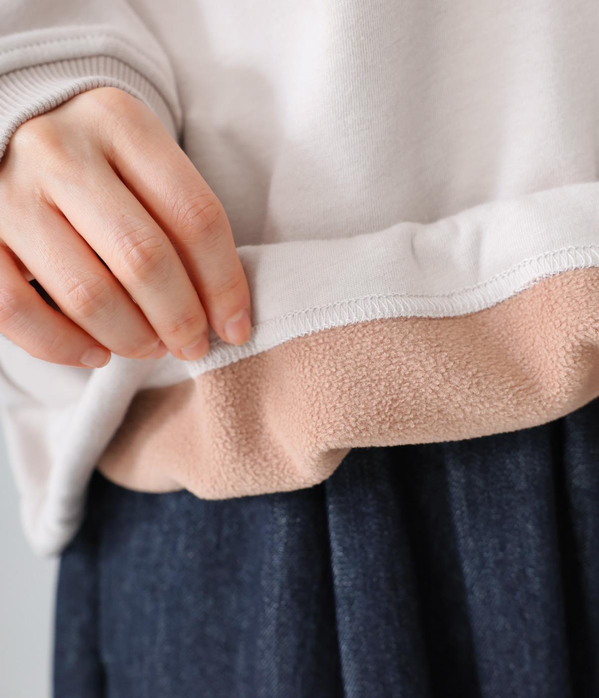 表面はさらっとなめらかな肌ざわりの天竺素材。裏面はふっくらとしたやわらかなフリース素材を使用した、あたたかな着用感を叶える生地です。軽くて伸びが良く、デイリーに活躍します。
