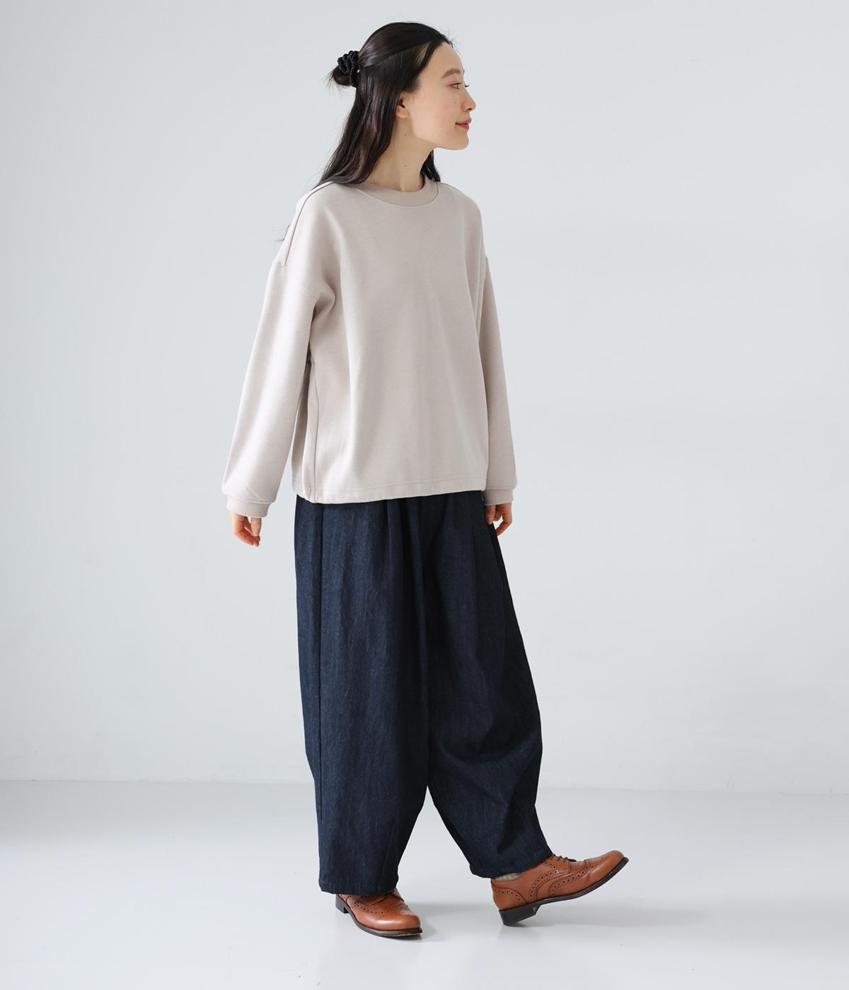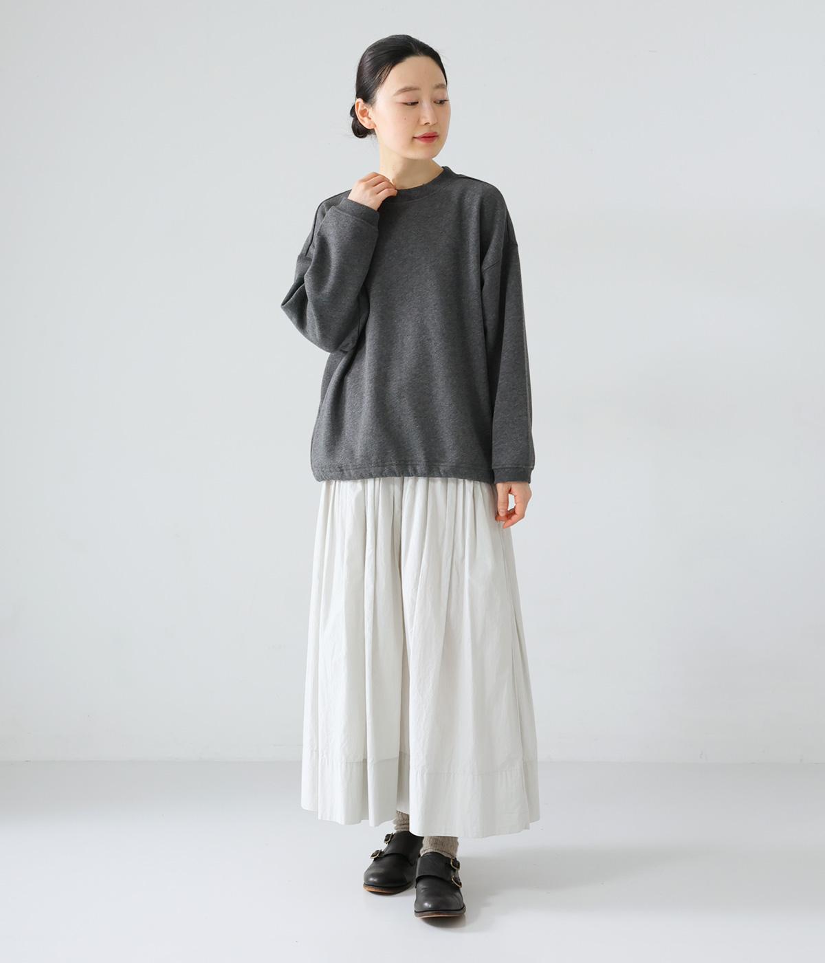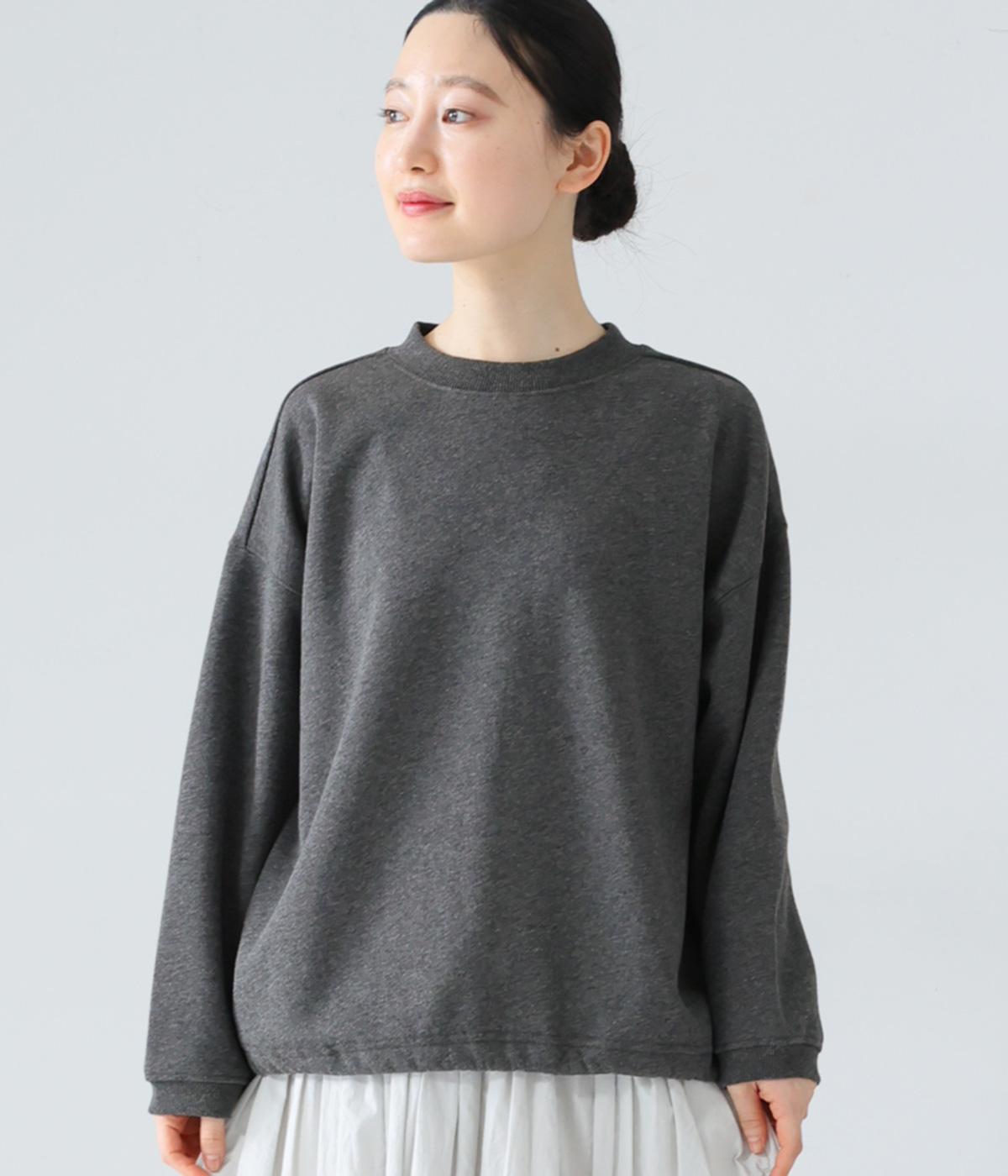 一見シンプルなデザインながらも、裏の配色にさりげないこだわりを感じるプルオーバー。裾はゴム入りで、自然なブラウジングと丸みのあるシルエットがたのしめます。軽くてあたたかく、着まわし力の高い色違いで揃えたくなるアイテムです。