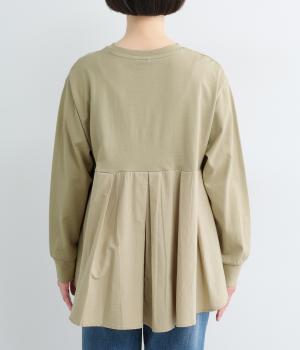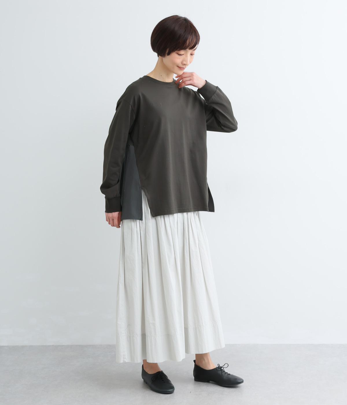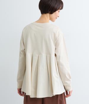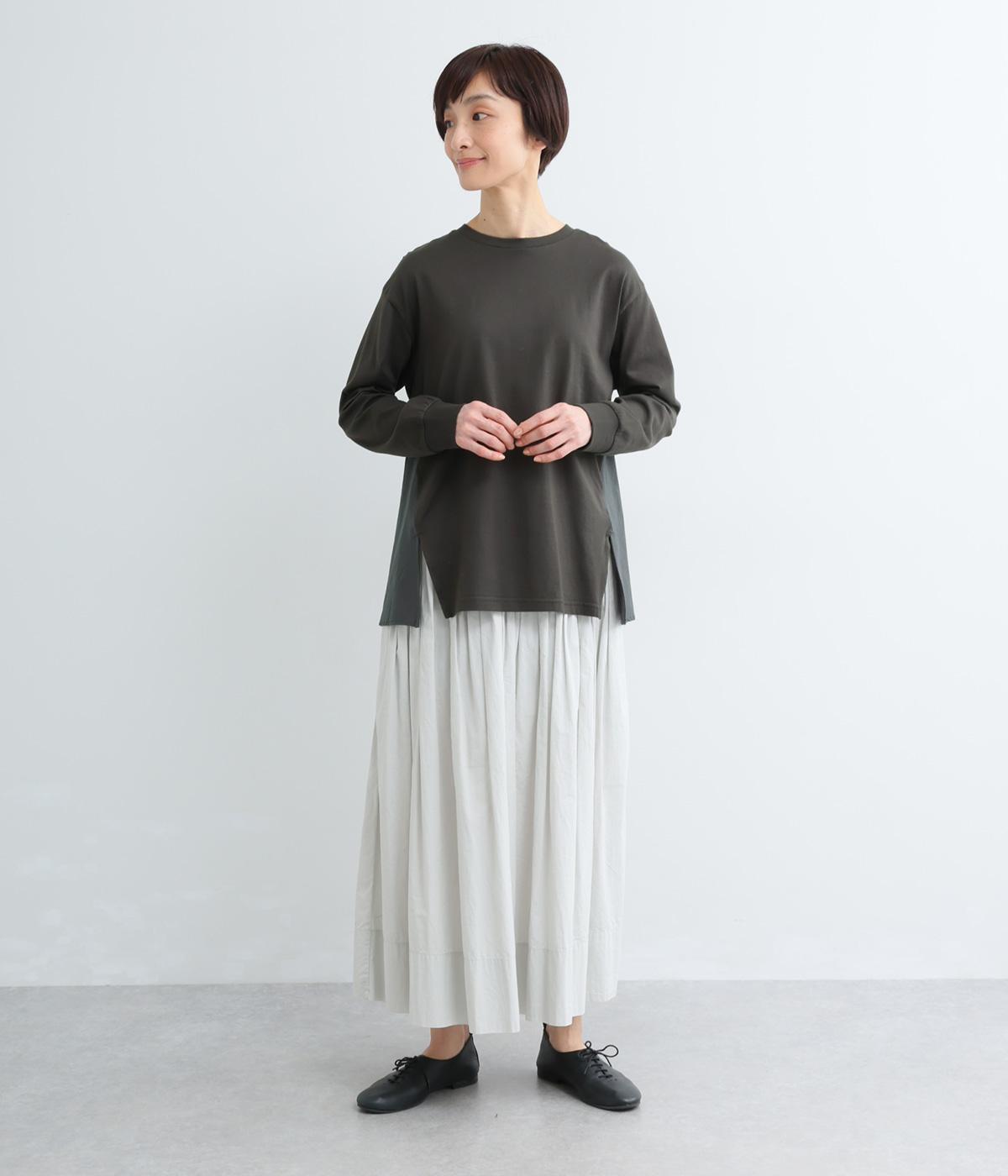 布帛で切り替えた後ろ身頃にタックを入れ、ふんわりとしたフレアシルエットを表現しました。前後で異なる表情がたのしめ、動きのある印象に。ほどよい丈感のAラインがヒップラインをやさしくつつみ、シンプルなコーディネートにも映える一枚です。