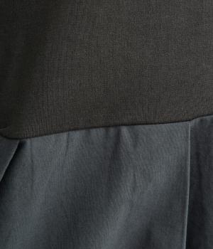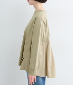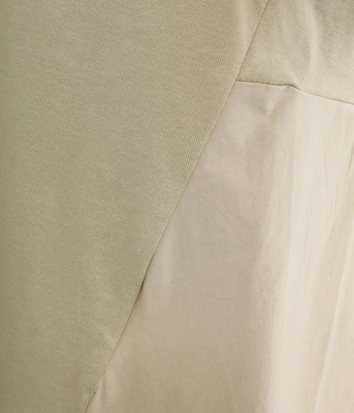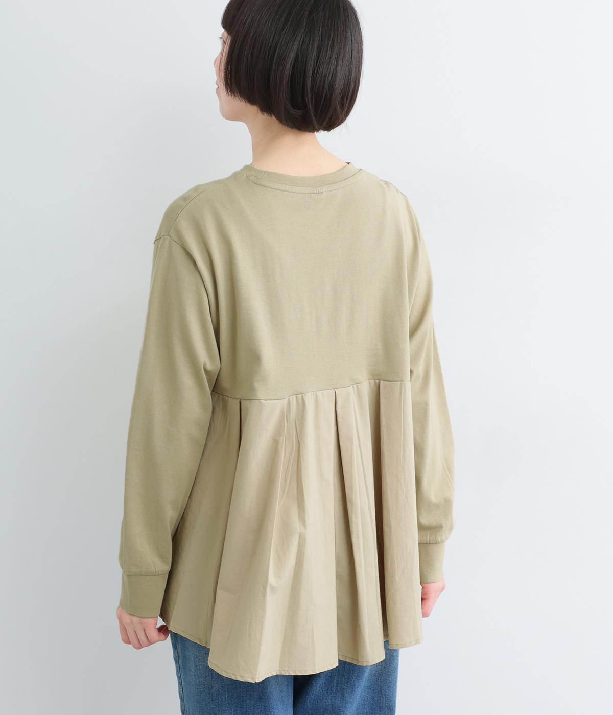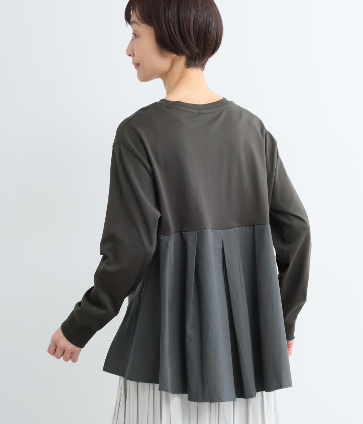 布帛で切り替えた後ろ身頃にタックを入れ、ふんわりとしたフレアシルエットを表現しました。前後で異なる表情がたのしめ、動きのある印象に。ほどよい丈感のAラインがヒップラインをやさしくつつみ、シンプルなコーディネートにも映える一枚です。