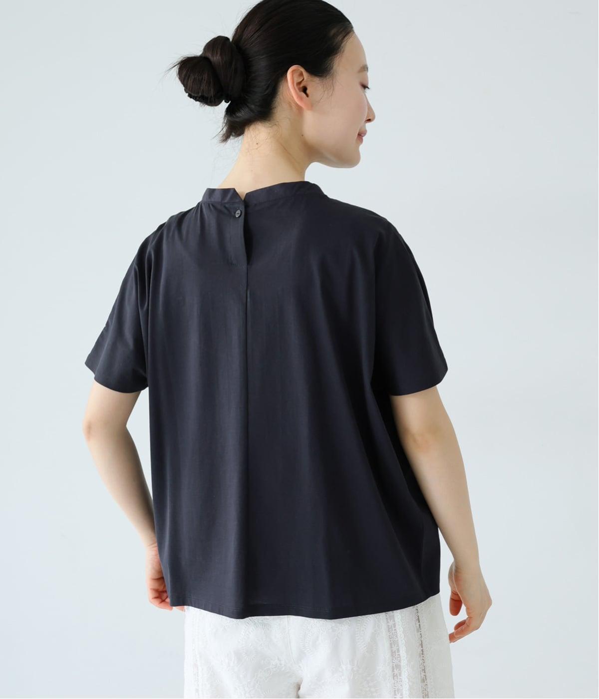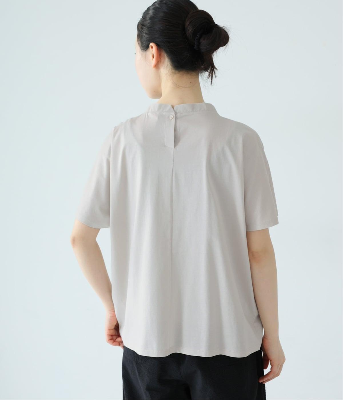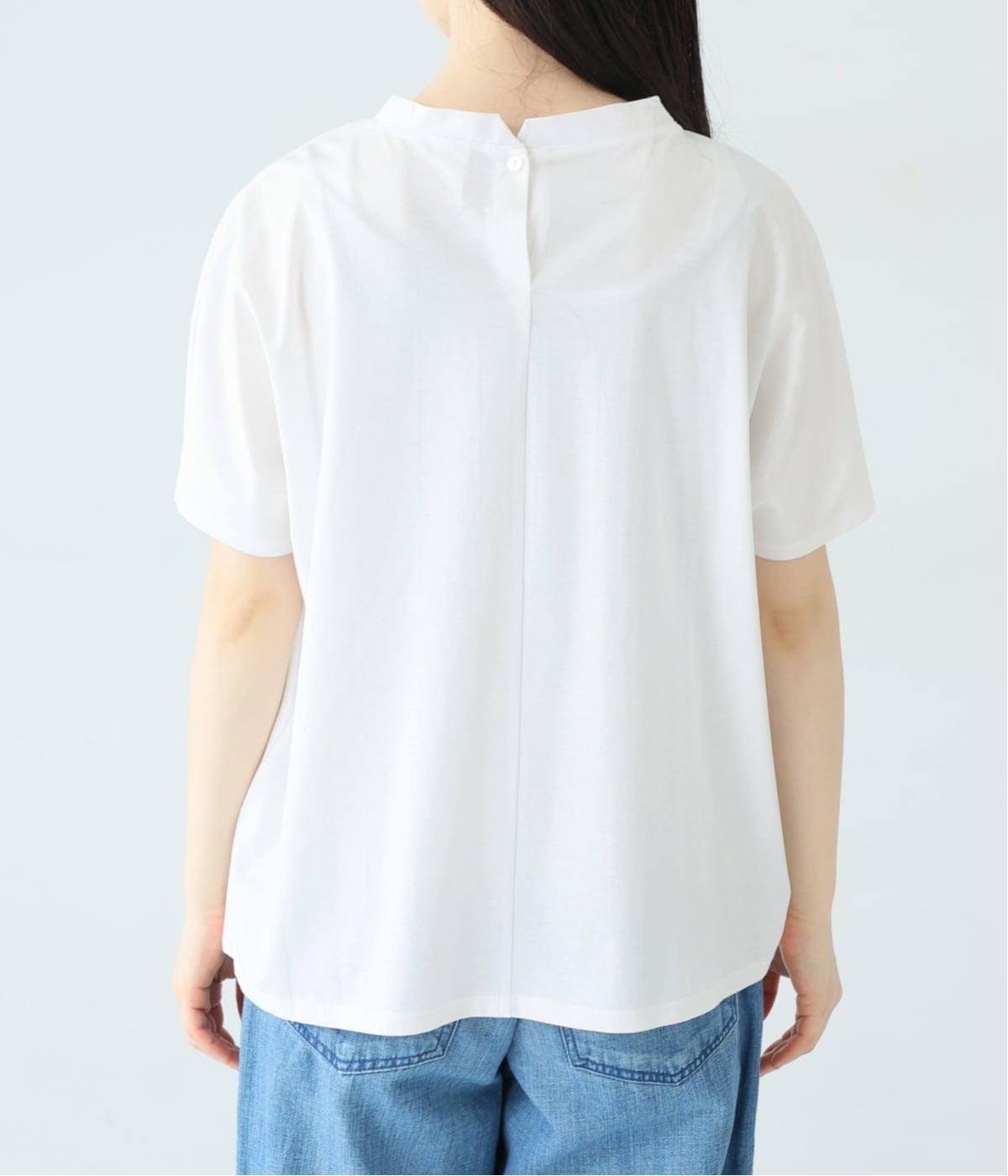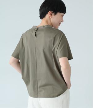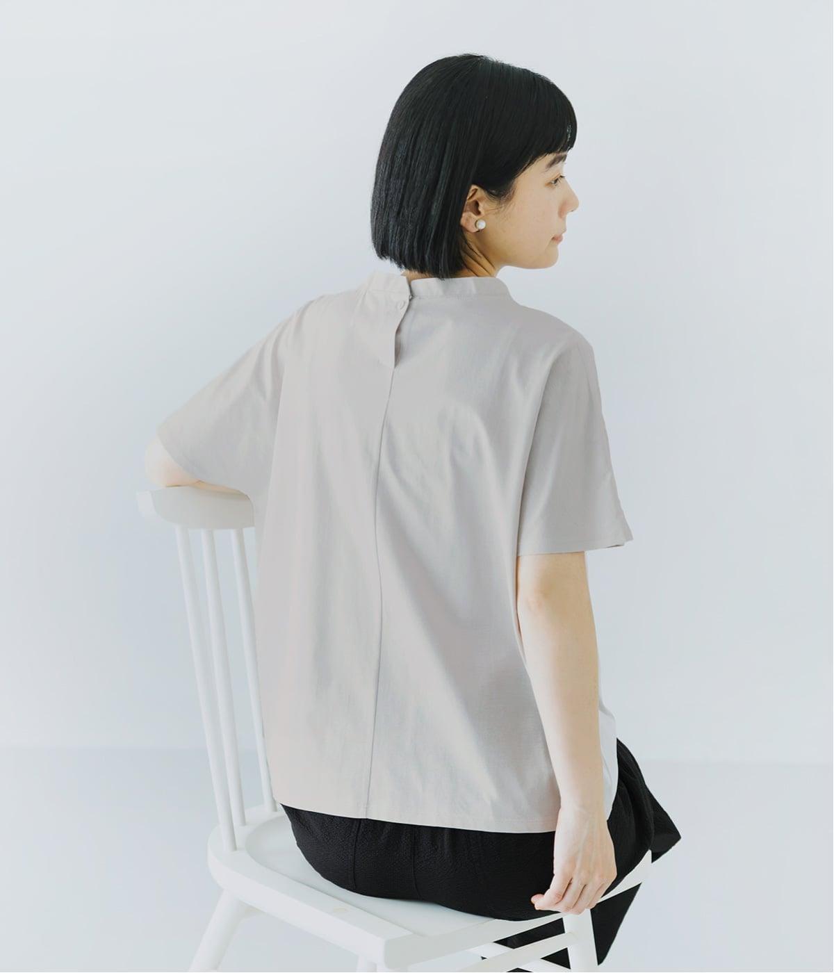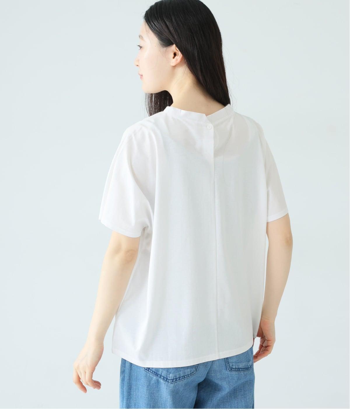 顔映りを明るく整える、肌なじみのいいやわらかなカラー。後ろの小さなボタンが、さりげないアクセントになり、ラフなイメージのTシャツをシックに格上げ。