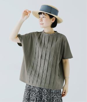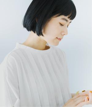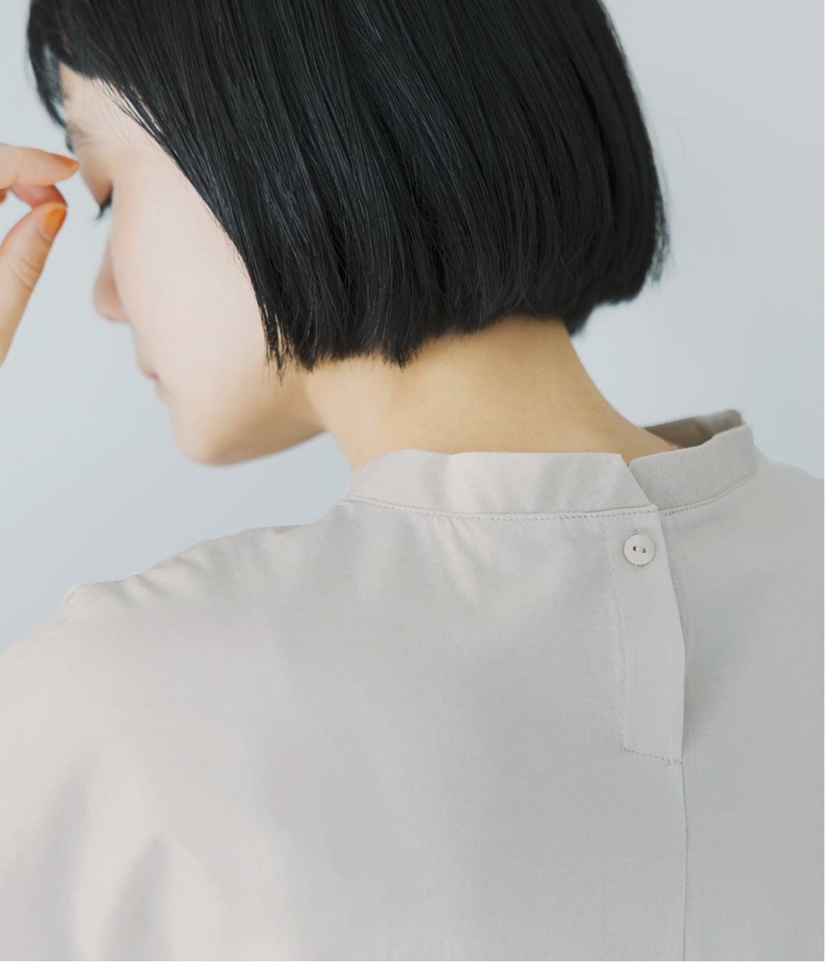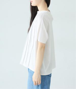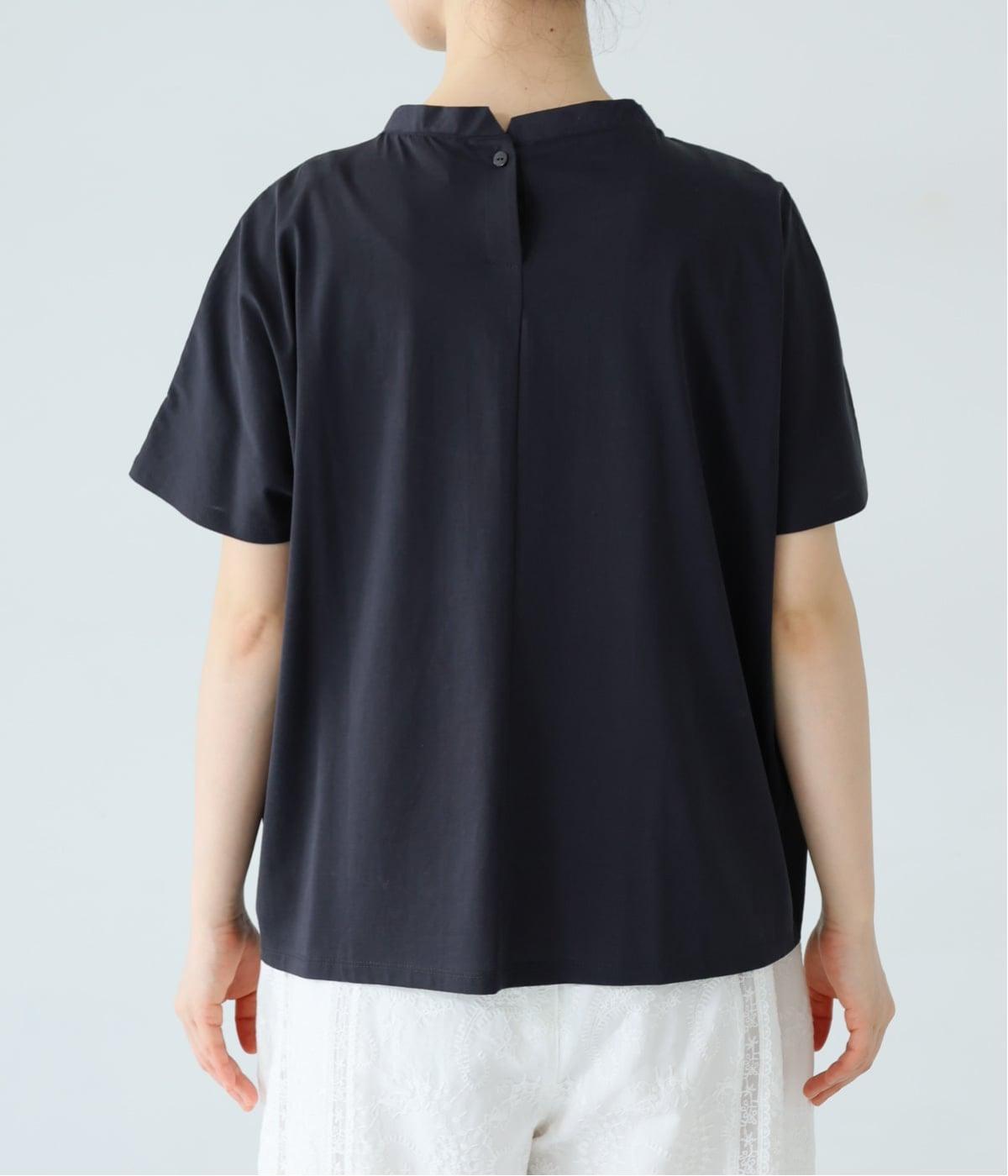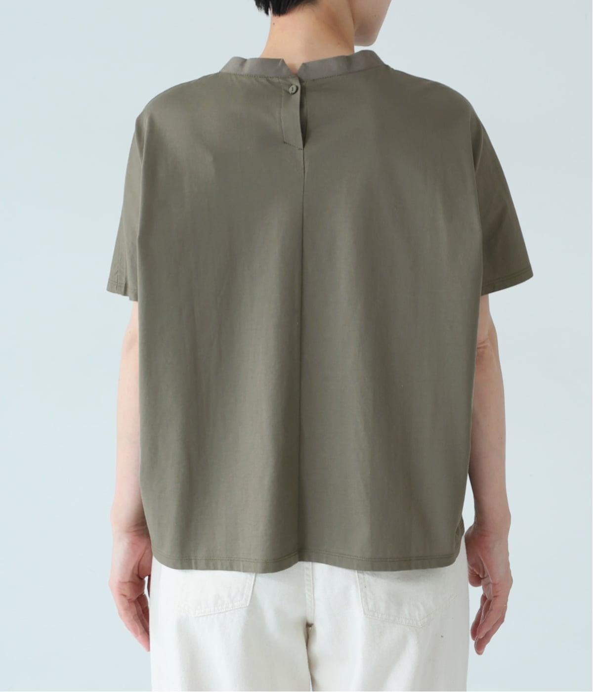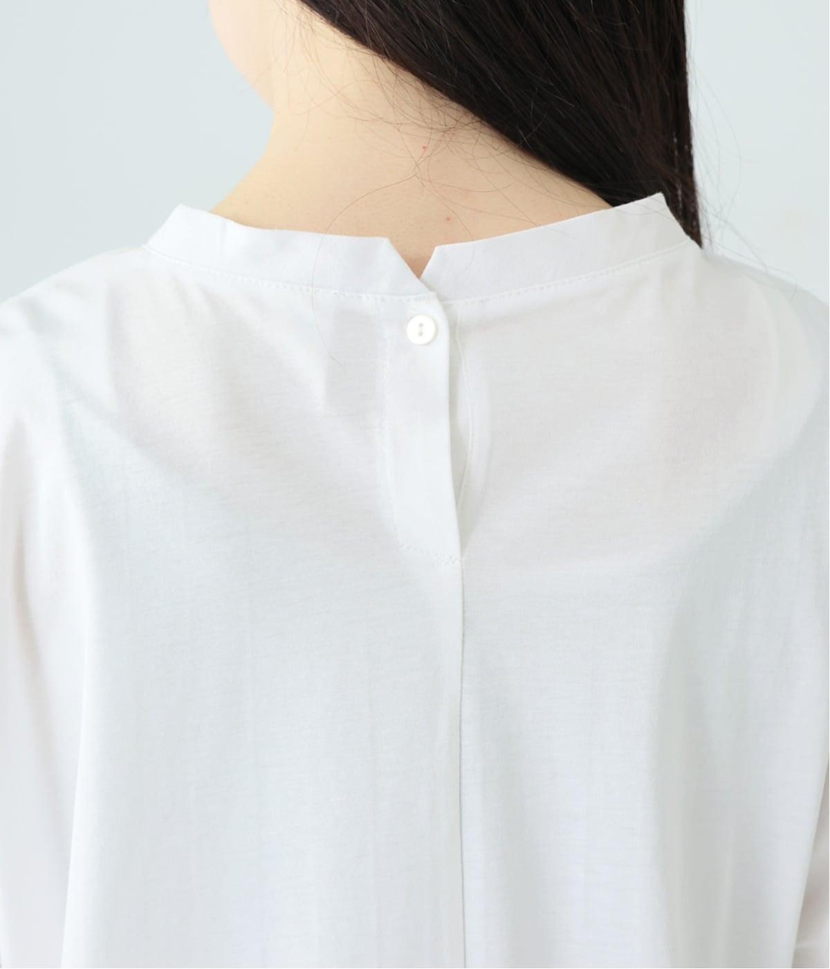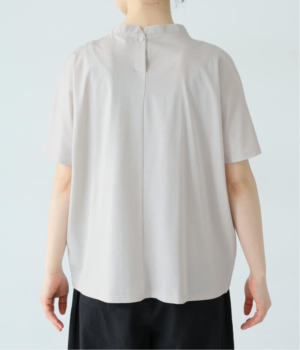 顔映りを明るく整える、肌なじみのいいやわらかなカラー。後ろの小さなボタンが、さりげないアクセントになり、ラフなイメージのTシャツをシックに格上げ。