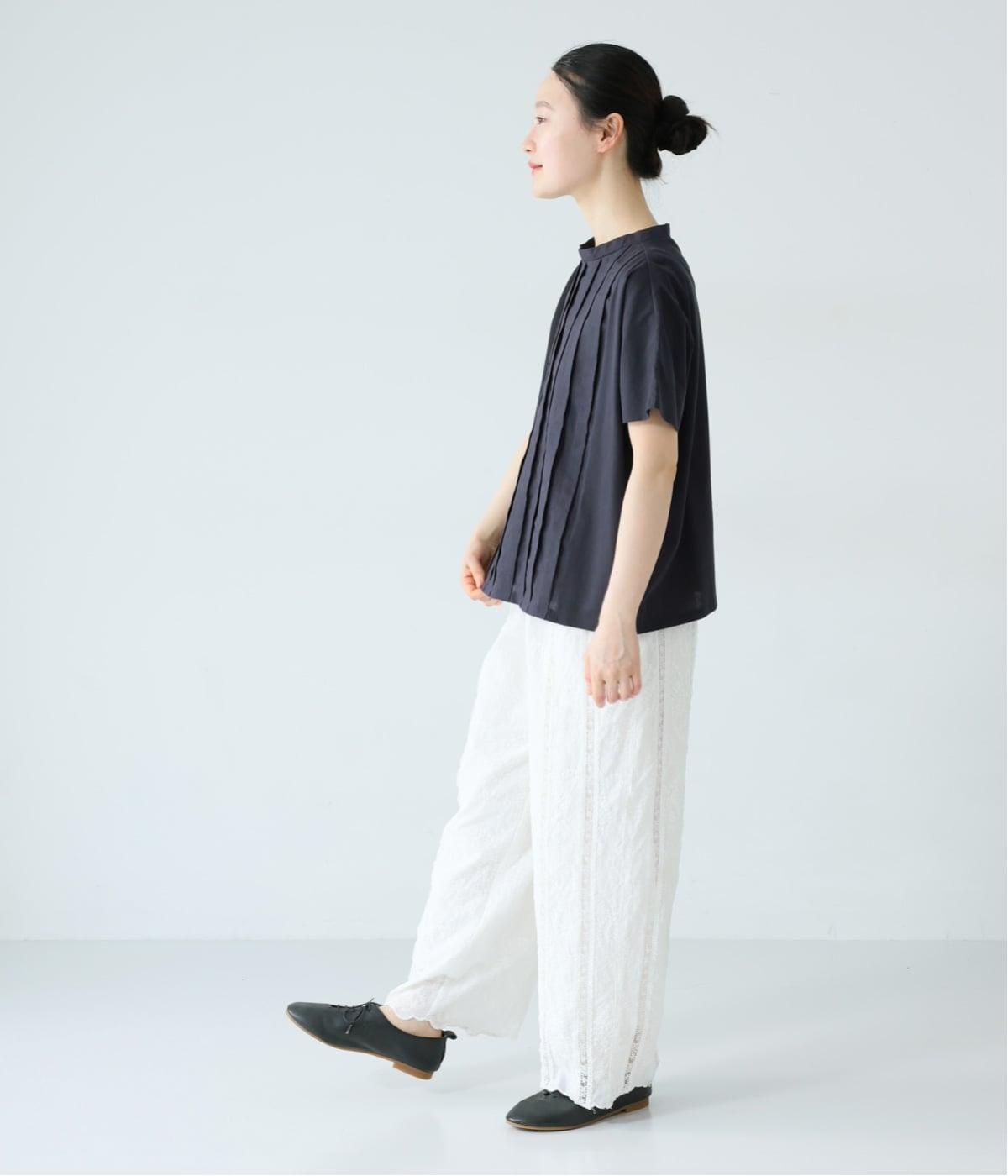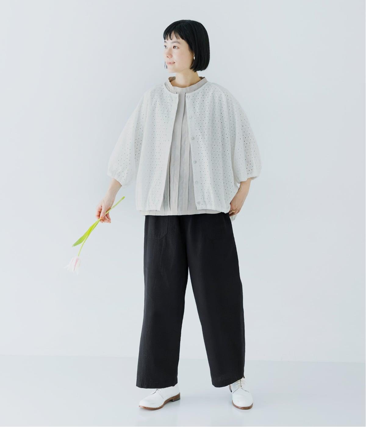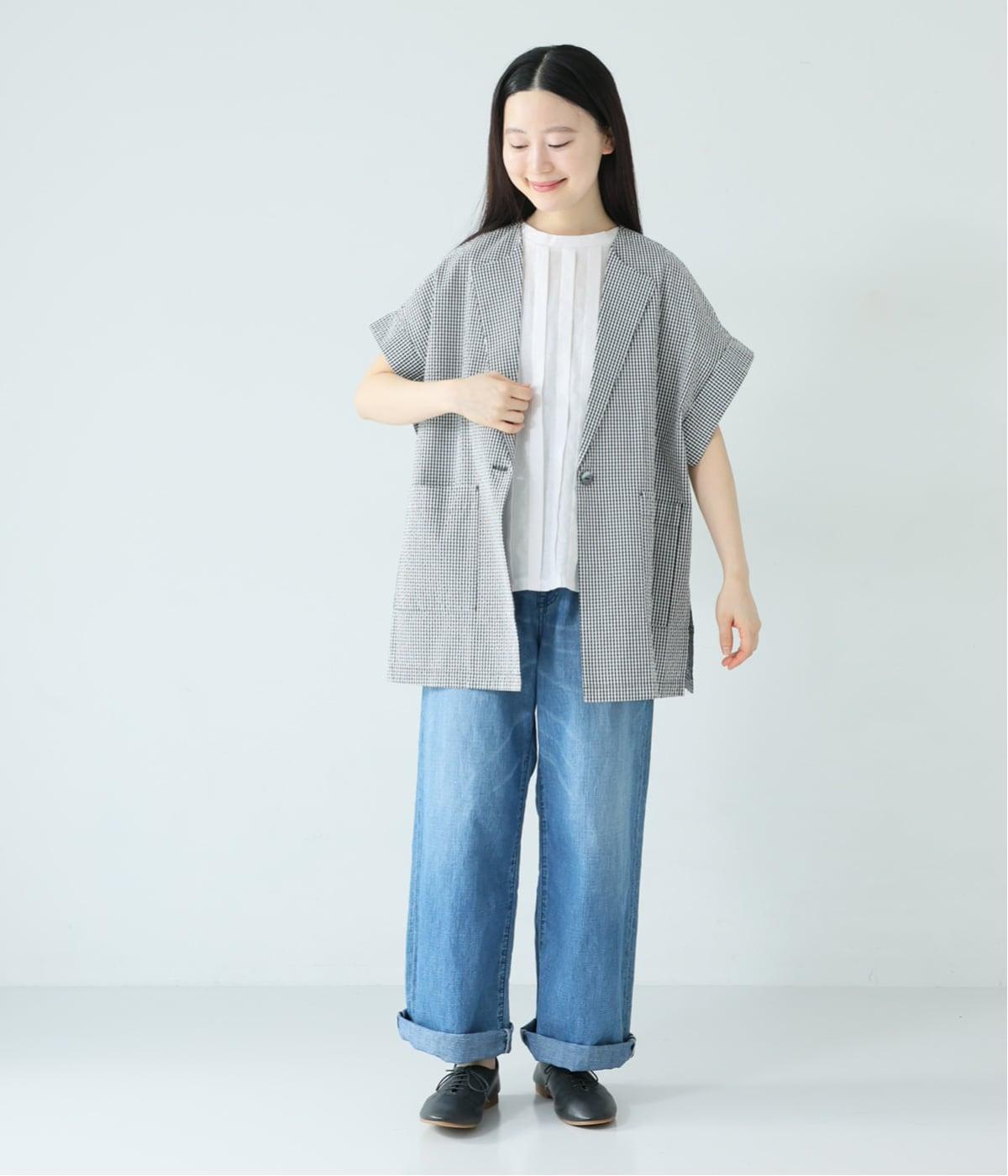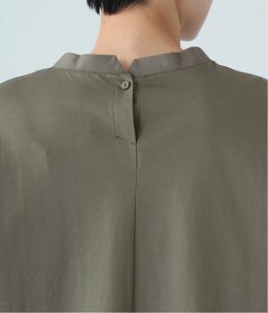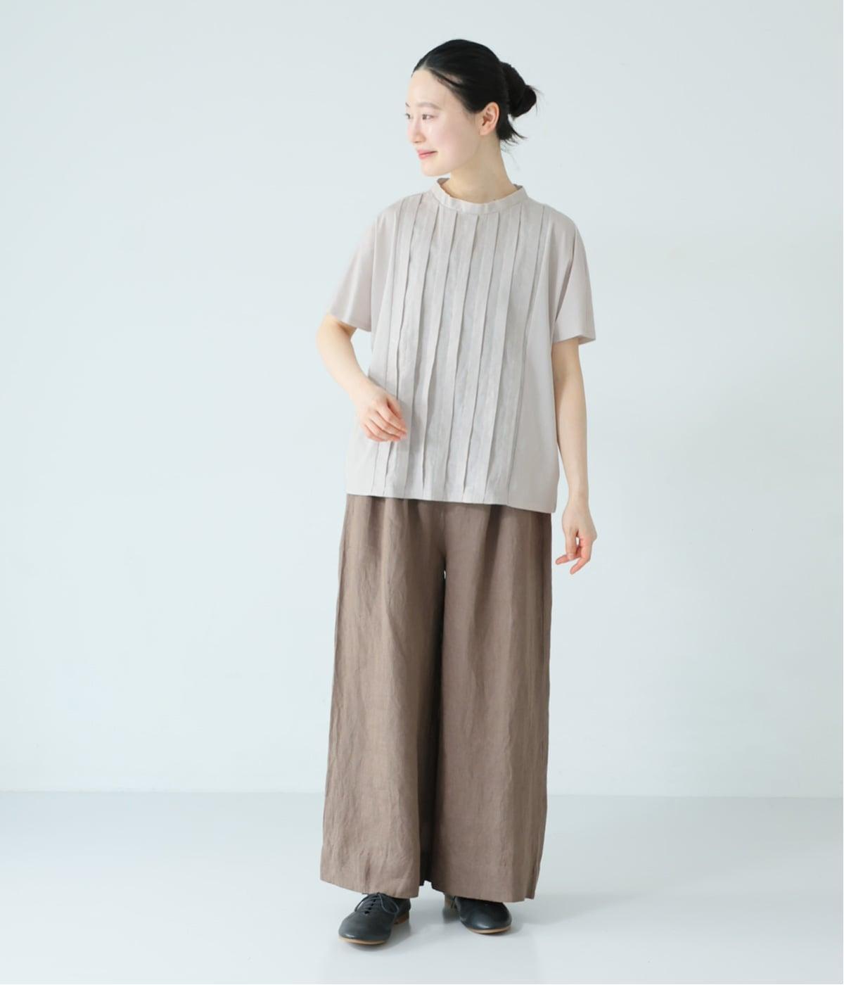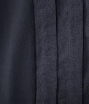 フロント中央には、リネンのハリと清涼感にコットンのやさしい質感を加えた、リネンコットン布帛生地を使用。軽やかで上品な表情が特徴です。