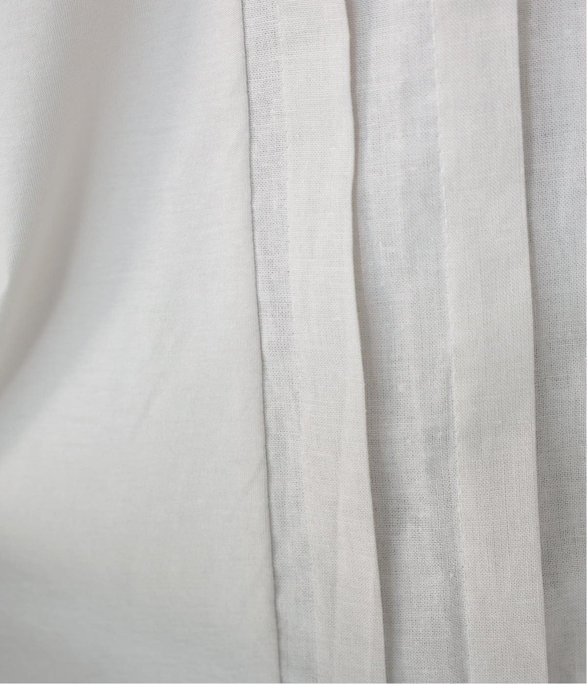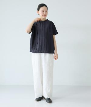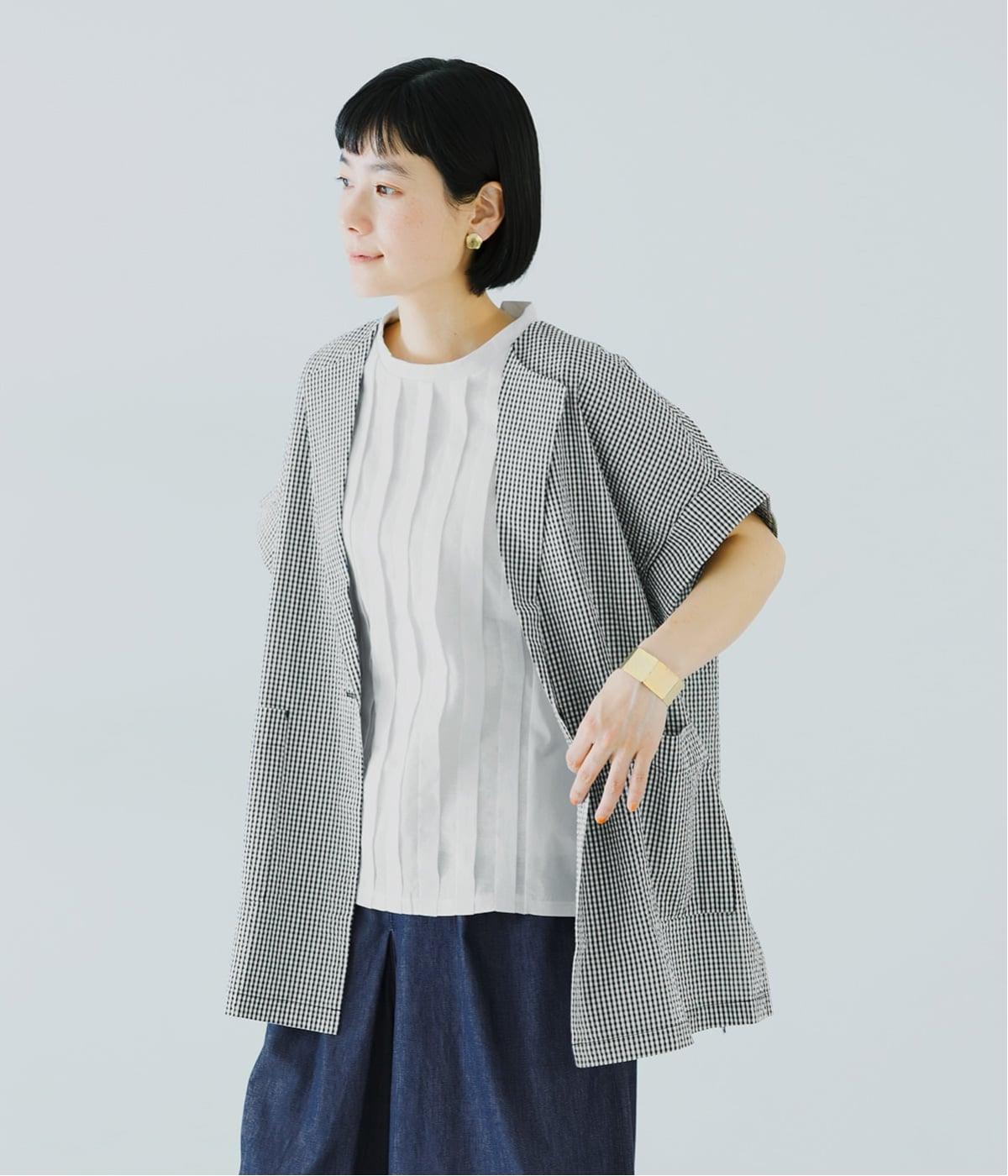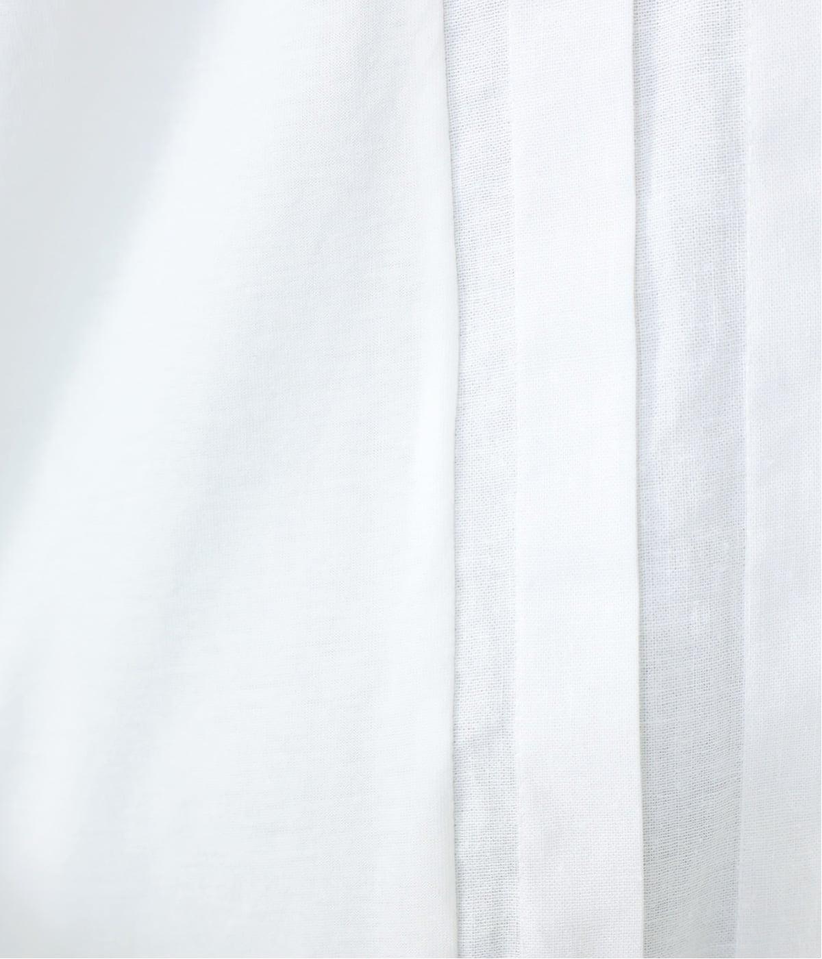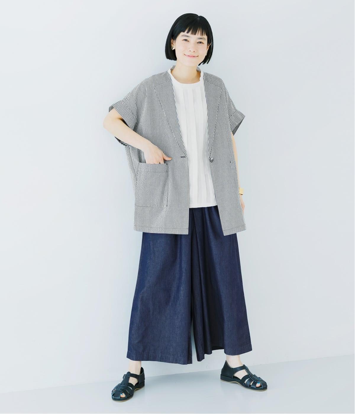 フロント中央には、リネンのハリと清涼感にコットンのやさしい質感を加えた、リネンコットン布帛生地を使用。軽やかで上品な表情が特徴です。