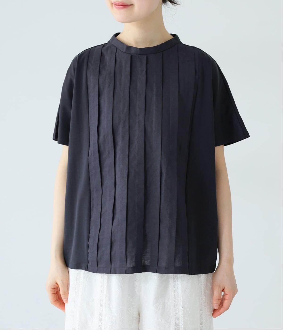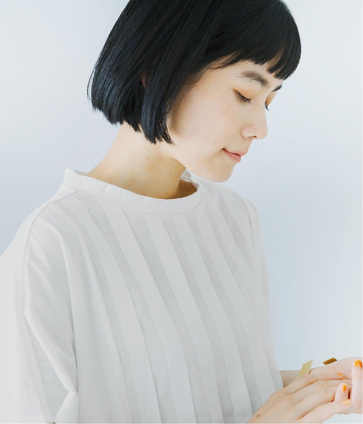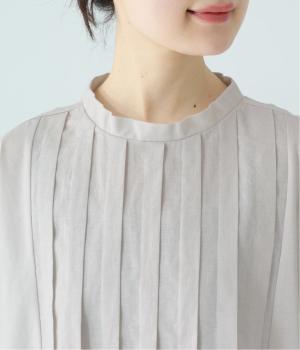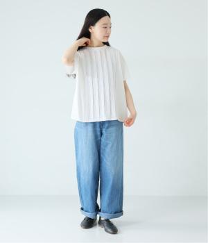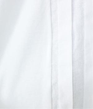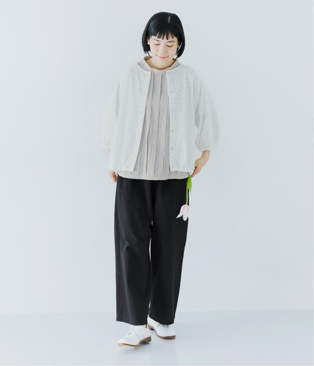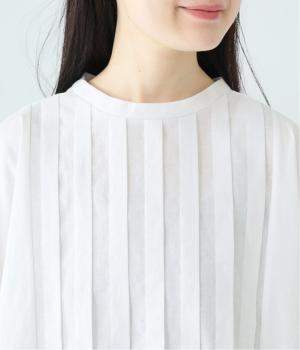 フロント中央には、リネンのハリと清涼感にコットンのやさしい質感を加えた、リネンコットン布帛生地を使用。軽やかで上品な表情が特徴です。