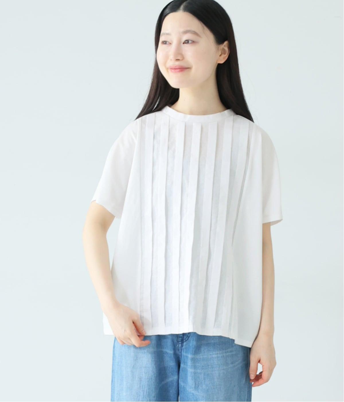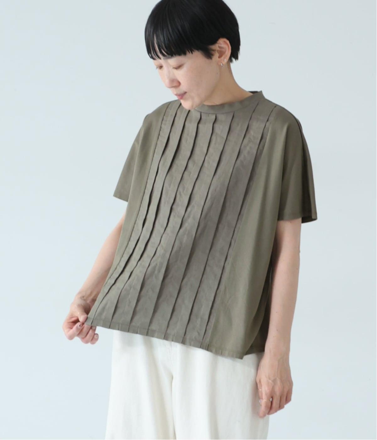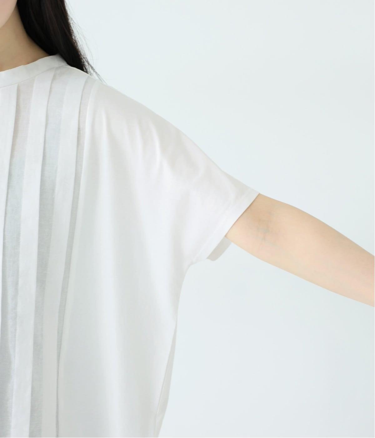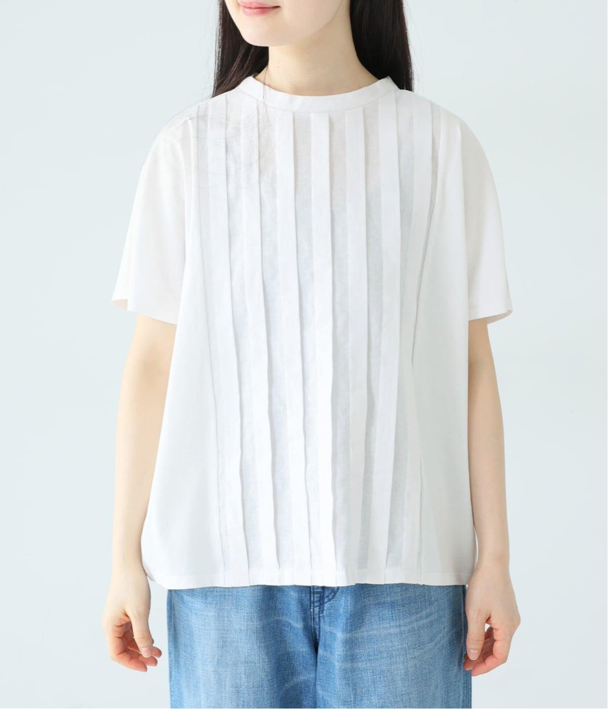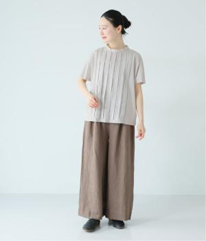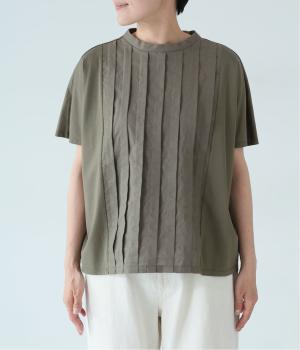 フロント中央はさらりとしたリネンコットン、サイドとバックにはなめらかなコットンを使用したTシャツ。異素材を組み合わせた上品さと着心地のよさが、人気の理由です。