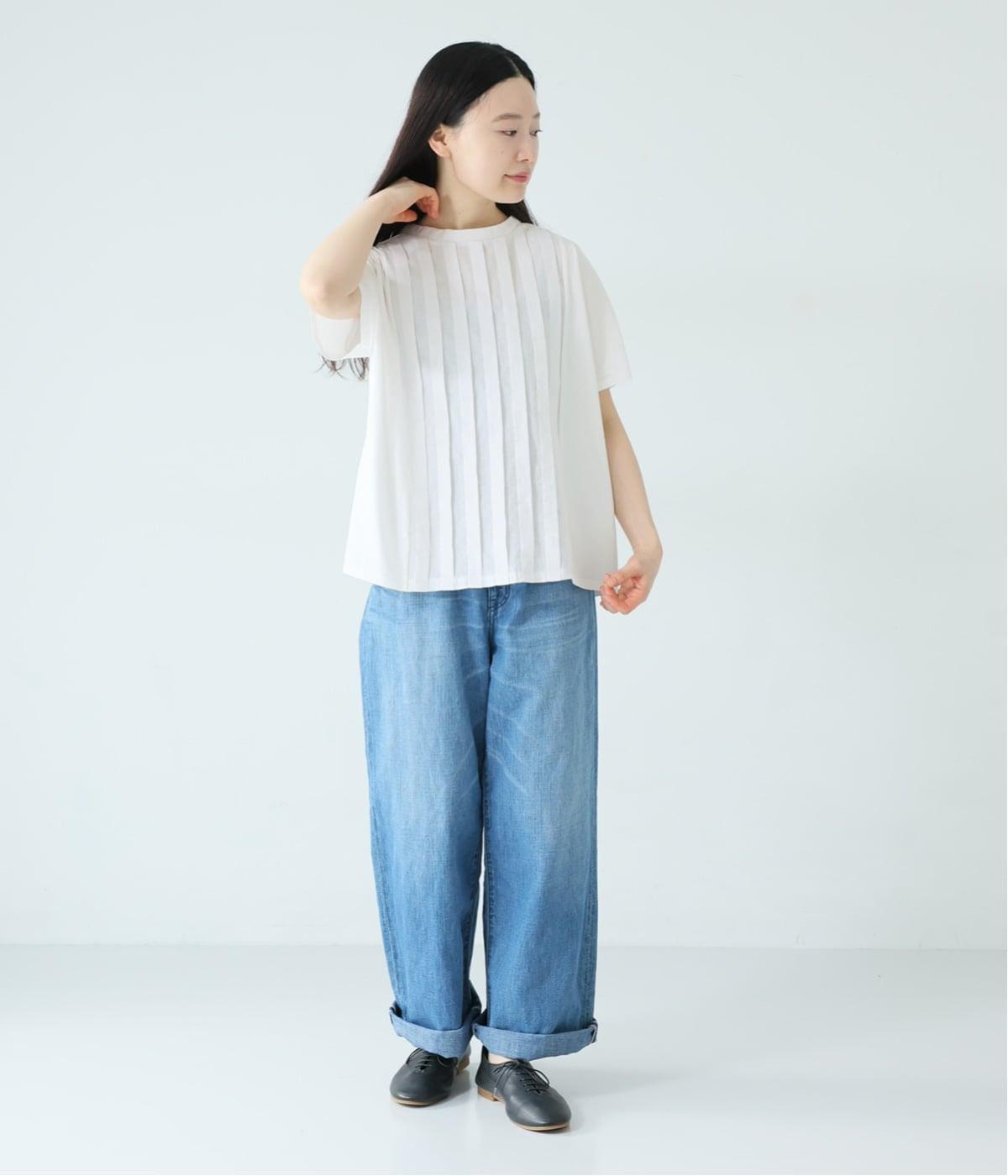 オフホワイトにデニムのワイドパンツを合わせた爽やかな春の装い。カジュアルなTシャツの着こなしが難しい大人にこそおすすめしたい、しなやかで女性らしいカラーです。