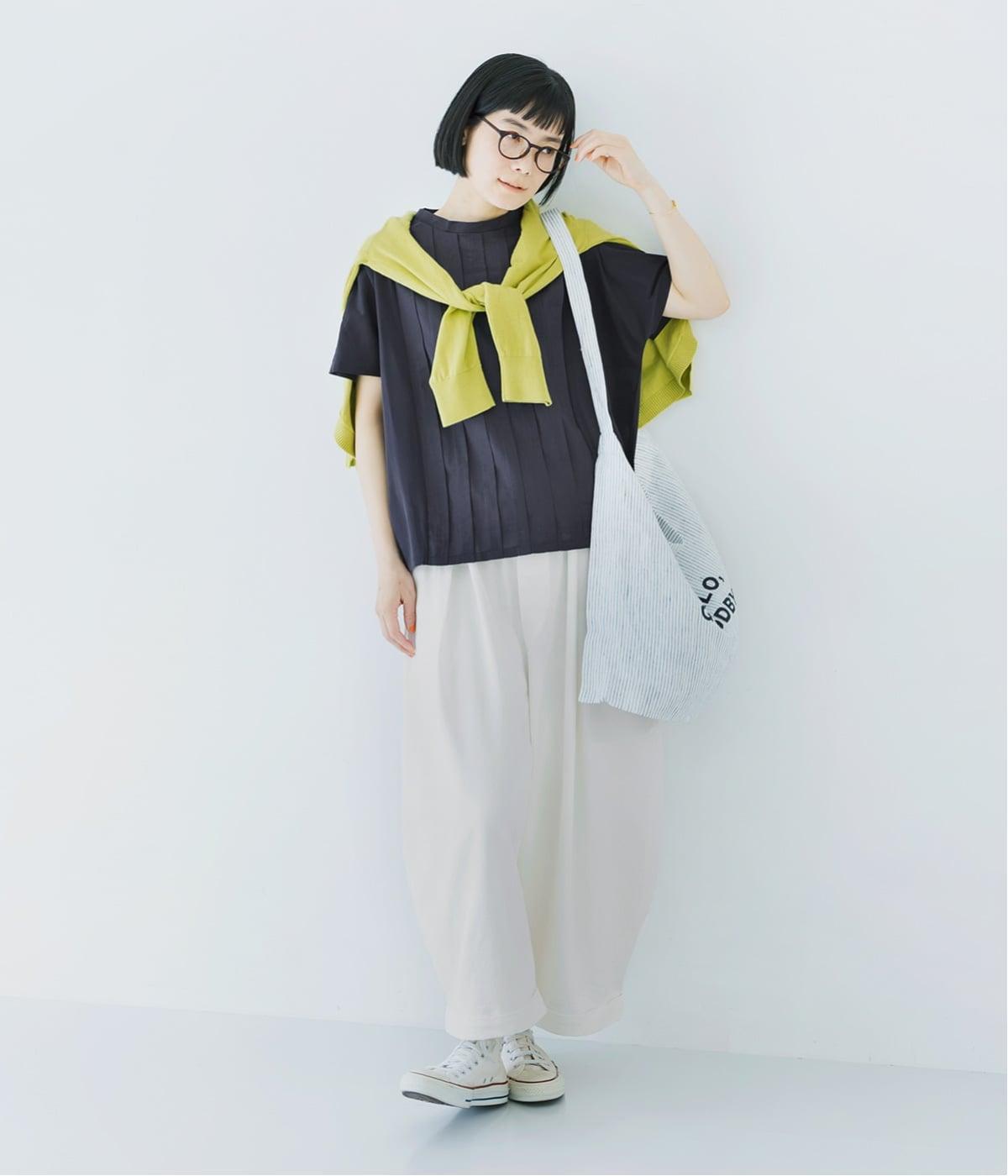 ネイビーに白のワイドパンツを合わせた、爽やかなスタイル。 明るめのグリーンのカーディガンを差し色に肩掛けして、こなれた雰囲気に仕上げました。