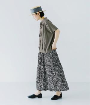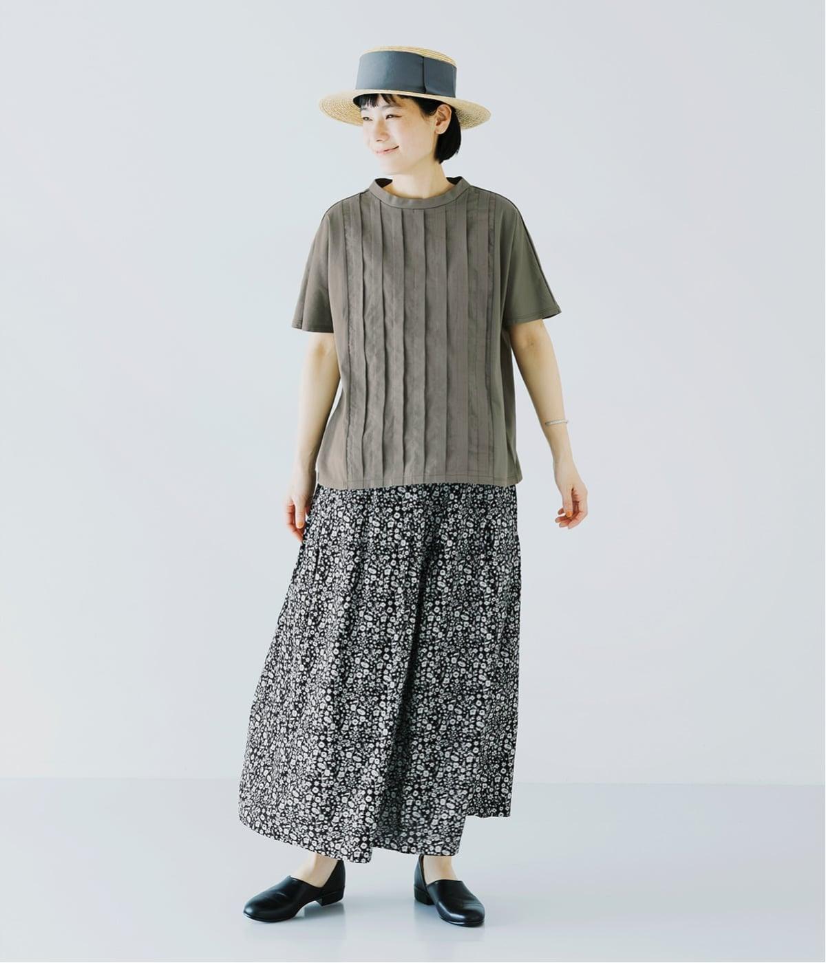 カーキはモノトーンの小花柄のスカートを合わせたナチュラルスタイル。落ち着いた色合いが甘さを控えめに整え、大人らしいバランスに。